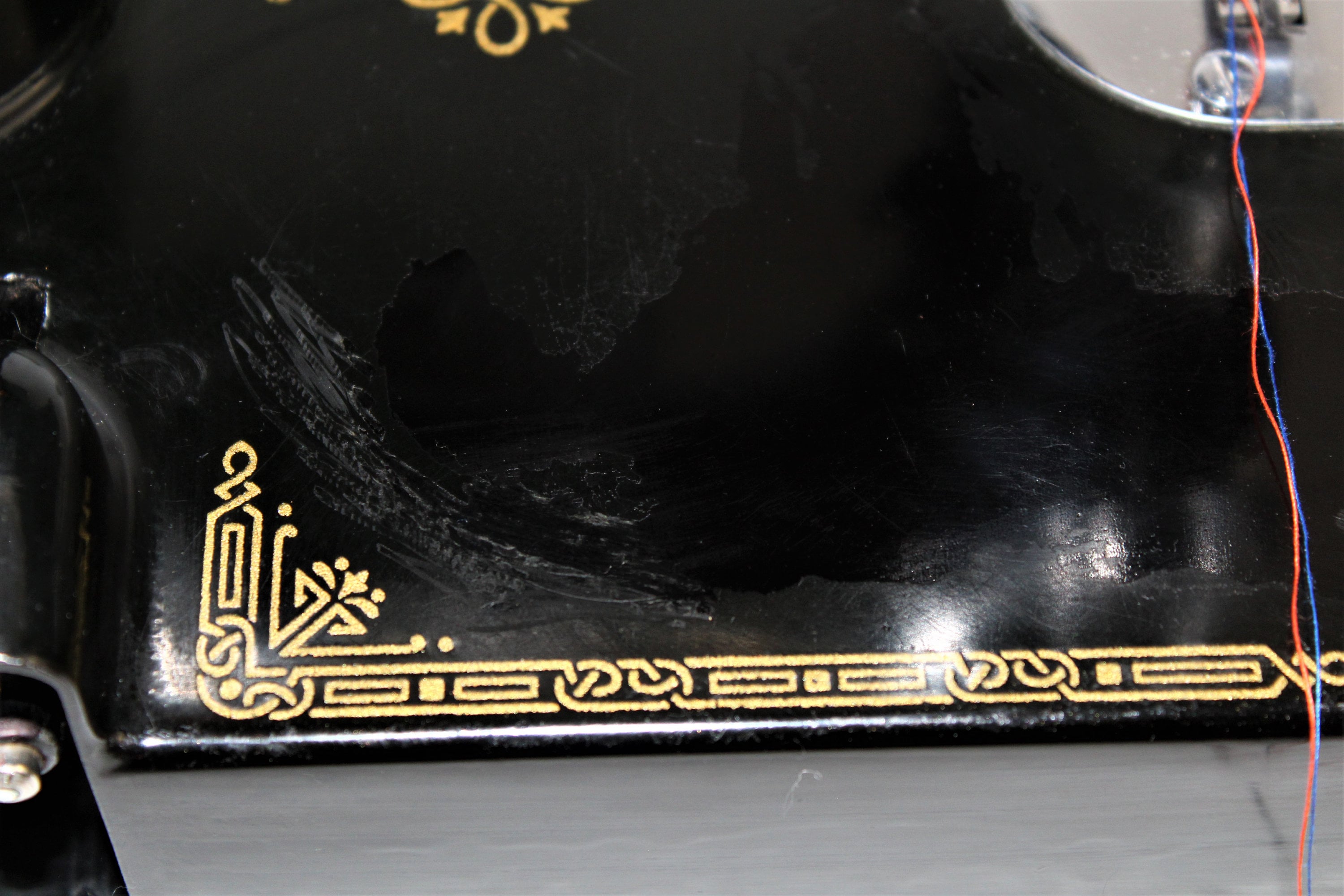 Overall condition of the machine is good with wear from use on sewing bed, scuffs and scratches, there is a large spot on the backside of the bed where the clear coat finish has been removed most likely from a solvent type of cleaner, this does not harm the functionality of the machine it is only cosmetic.