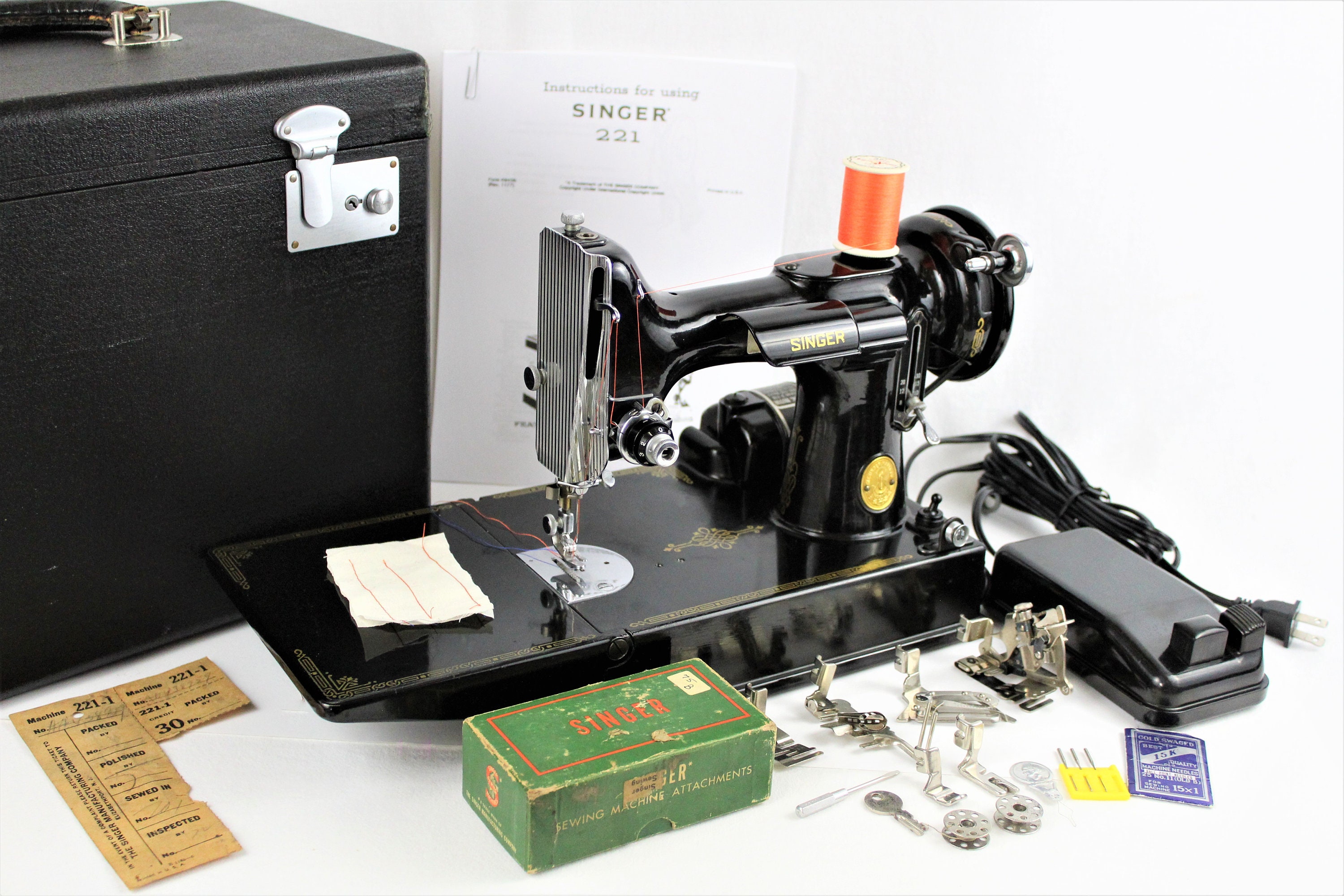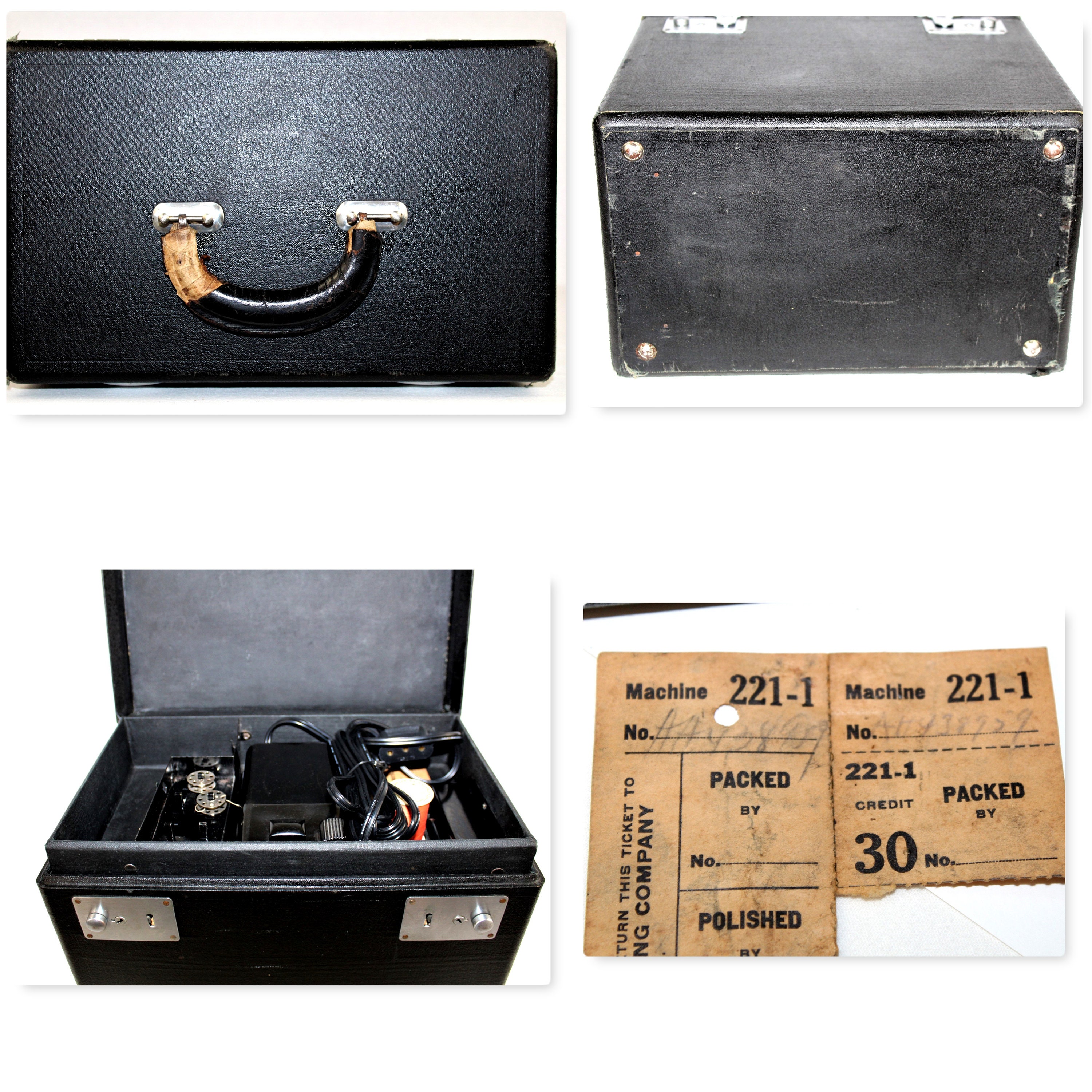 We have for sale a vintage Singer 221-1 portable featherweight sewing machine and carrying case. Serial # AH488959. The machine badge was issued on January 22, 1948, and was manufactured in Elizabethsport, NJ, USA. It has an original 110-volt motor and beautiful chrome trim. The machine, case, instruction book and attachments are in very good vintage condition. We’ve had several machines in the last few years and this one purrs. The case is in good vintage condition showing wear consistent with age and use.