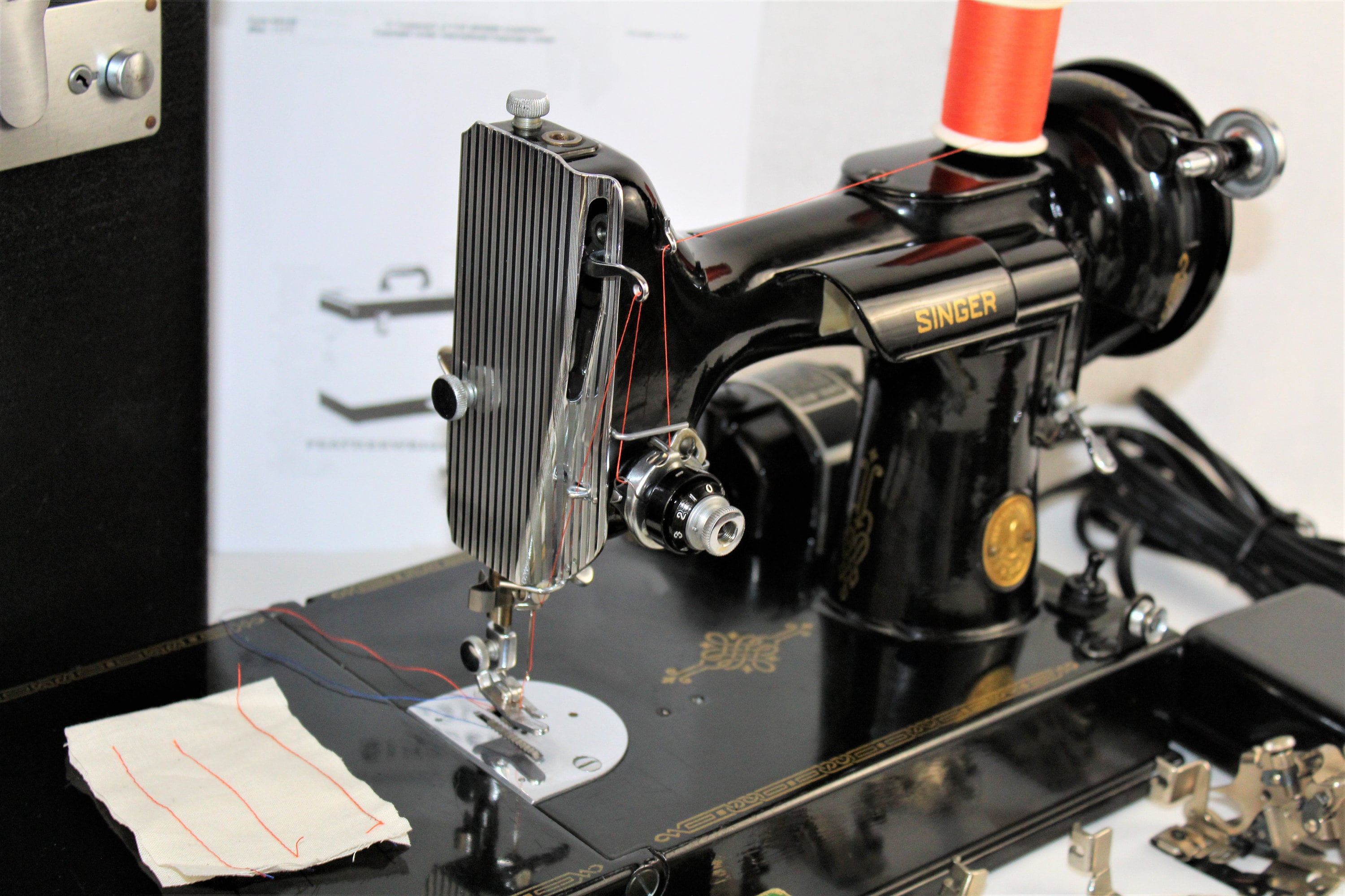 This is a very nice machine finished in that classic deep gorgeous shiny black featherweight paint, gold decals and chrome trim. The original foot pedal still makes the motor hum. The locking carrying case is also in very nice condition with original hardware, handle, and a key. Please see all photos as they are part of the item’s description.