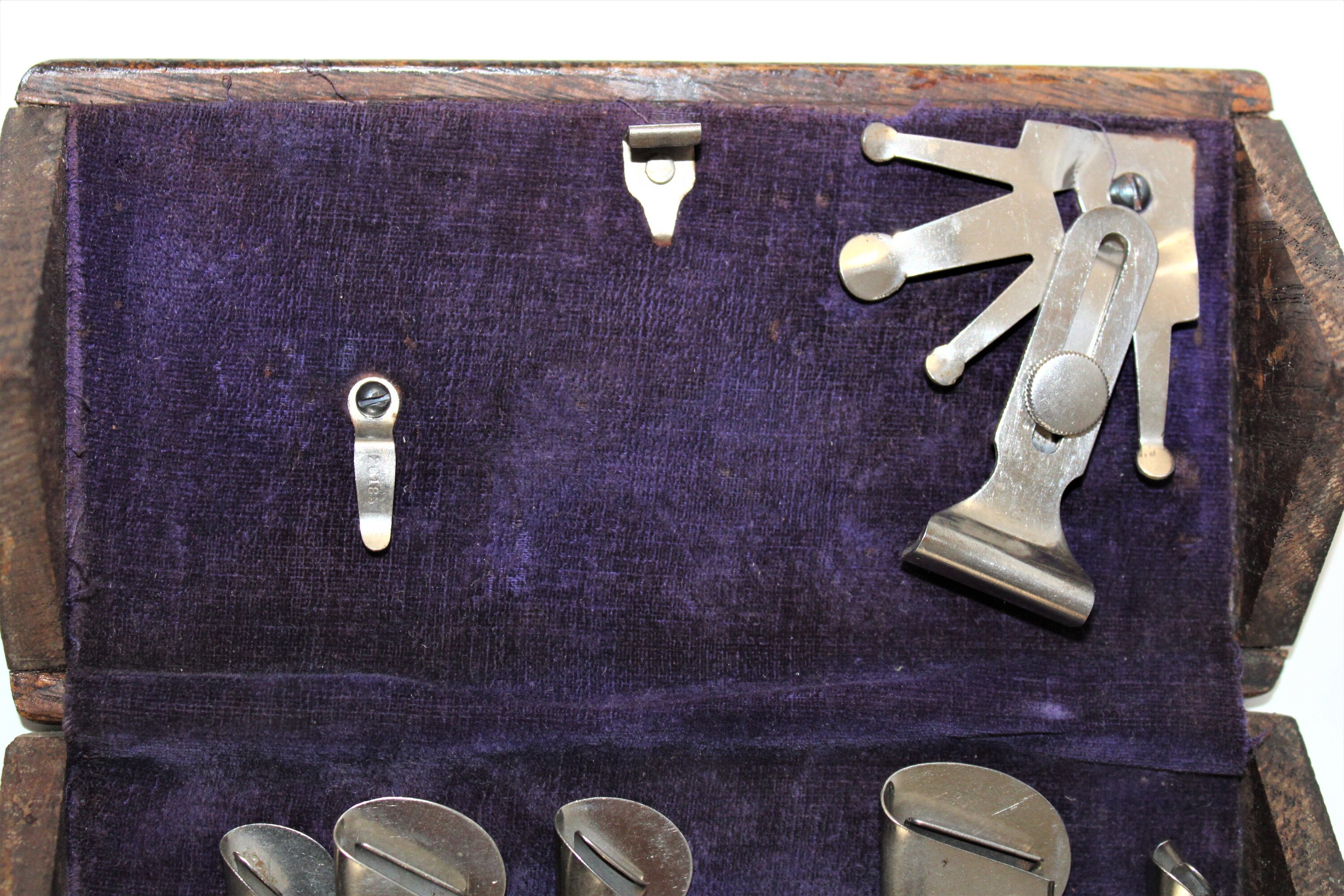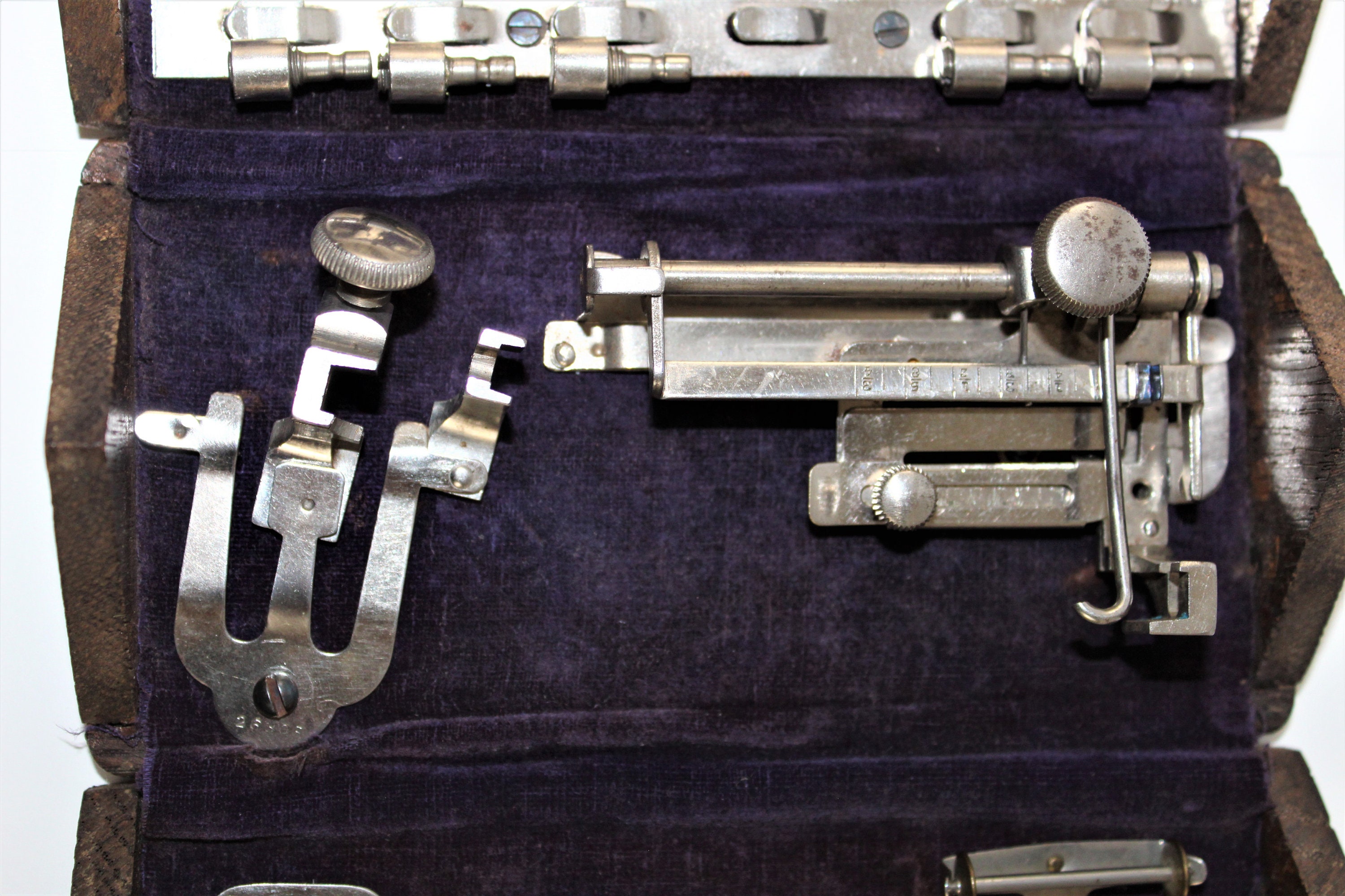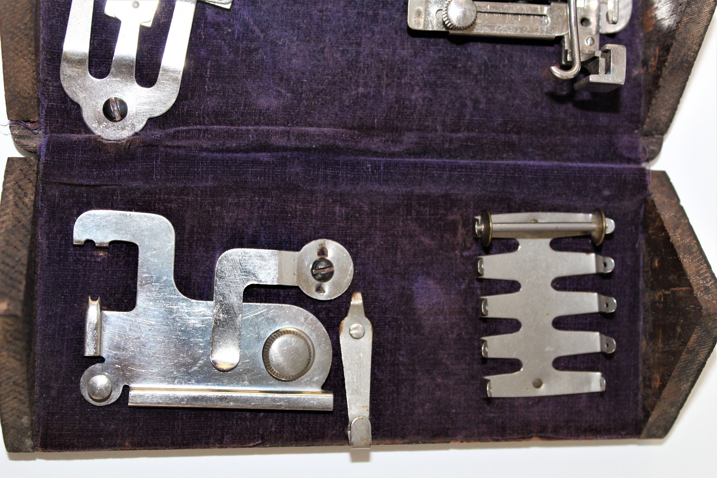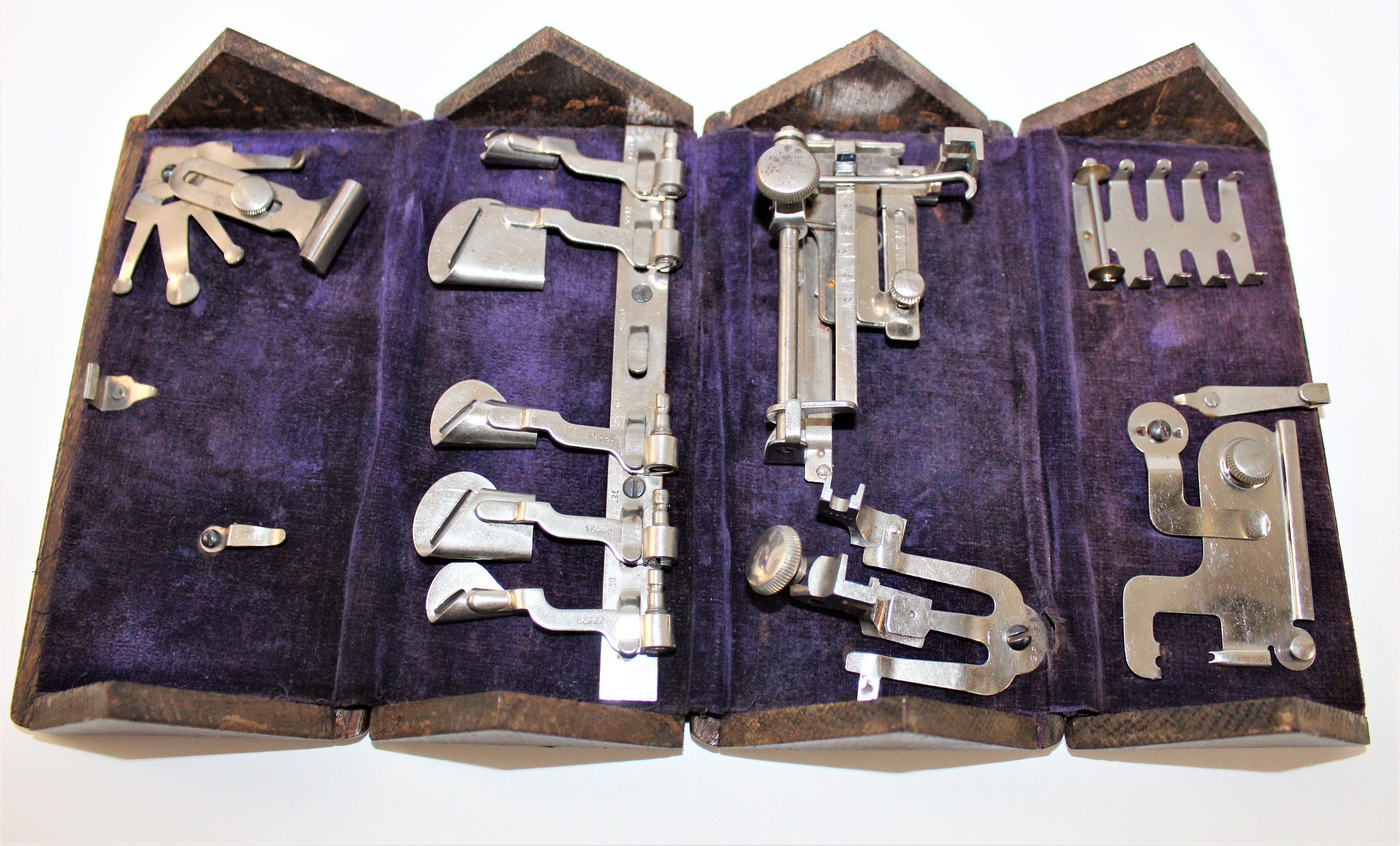 We have for sale a wonderful antique oak Singer puzzle box with Singer attachments and thumb indent box latch works perfectly. The workmanship is extraordinary for this oak with purple velveteen lined box and interior latches so each attachment could be secured. For Singer’s Vibrating Shuttle style machine (2, 27, 127, 28 and 128).