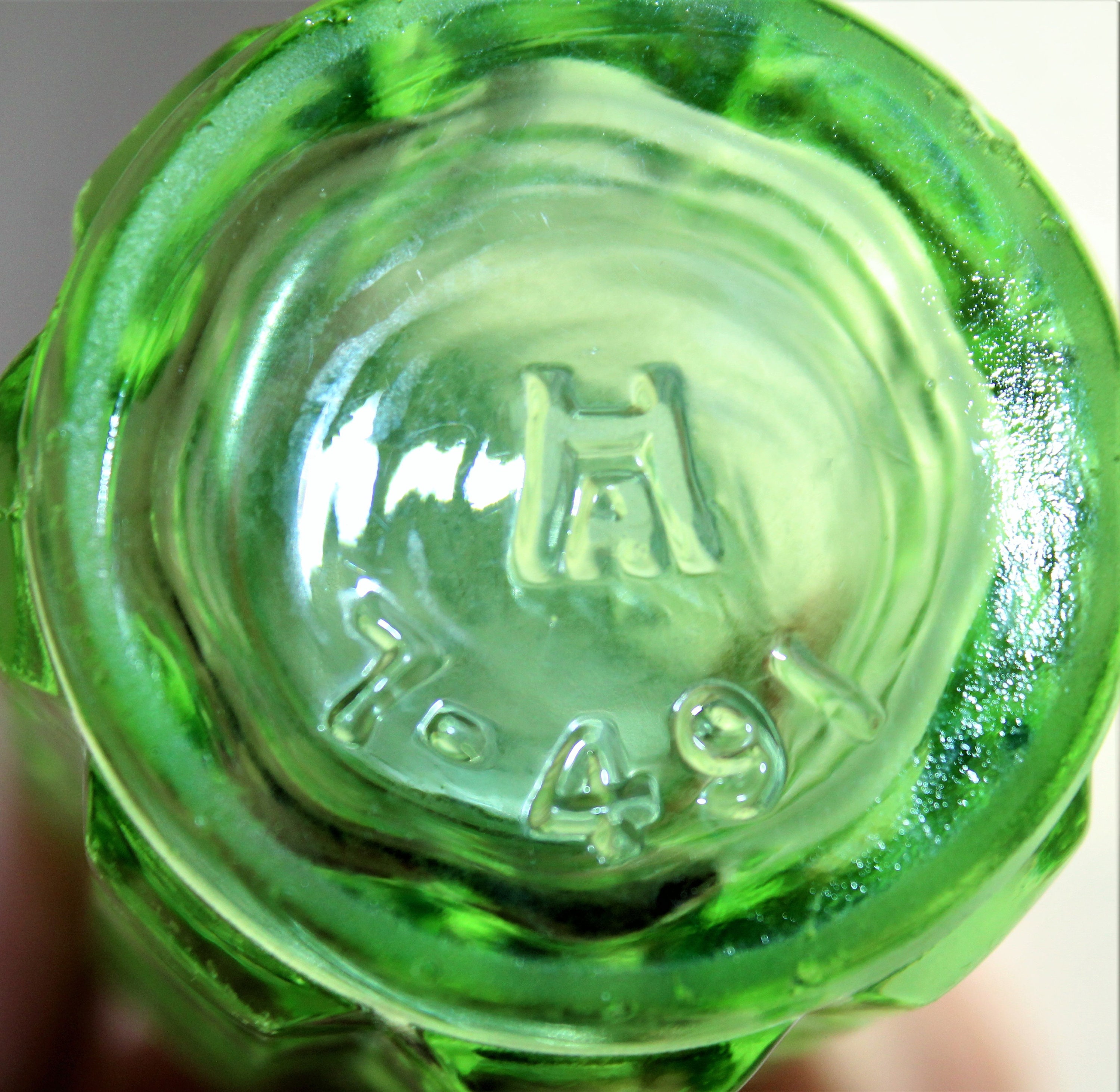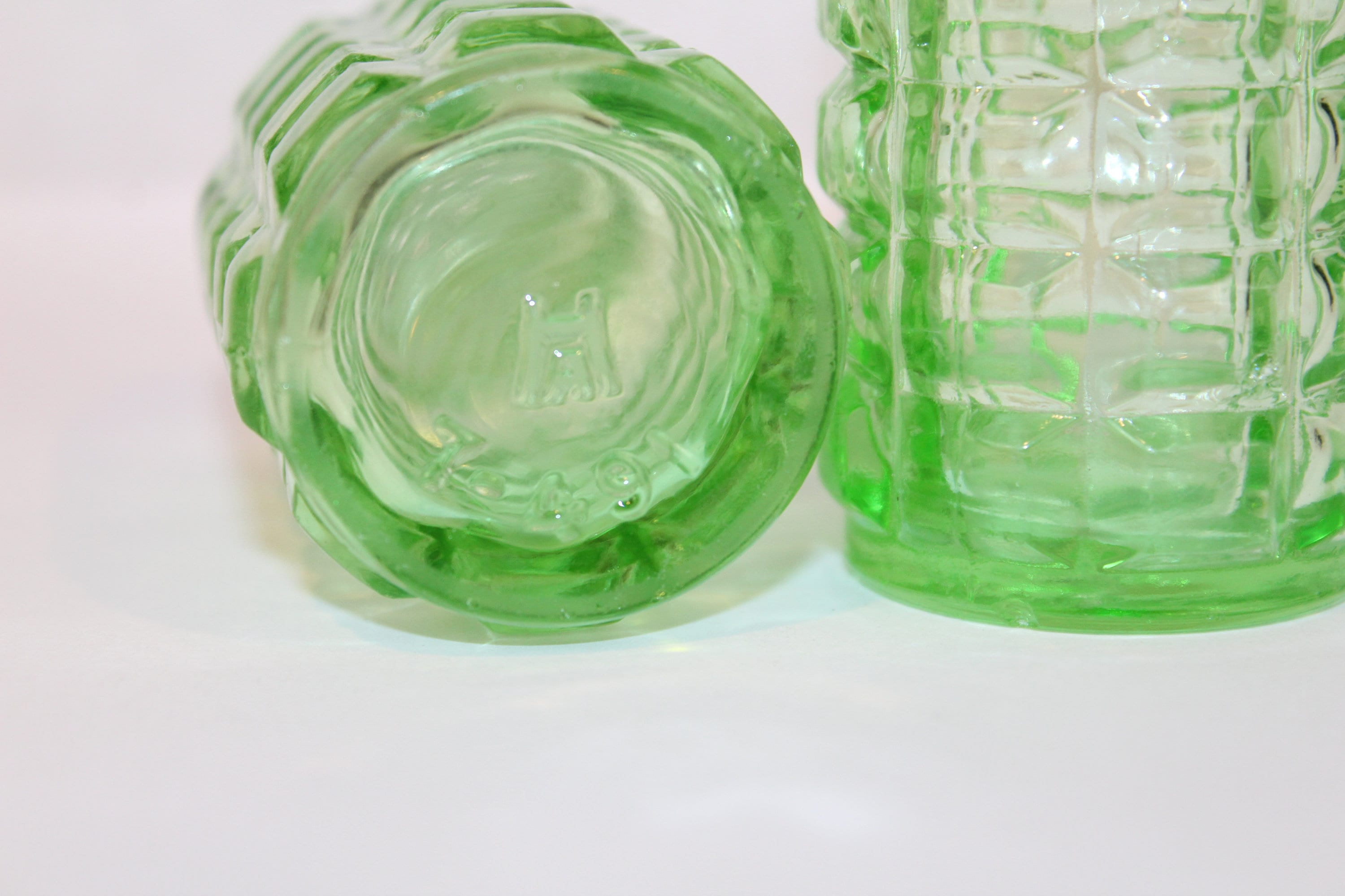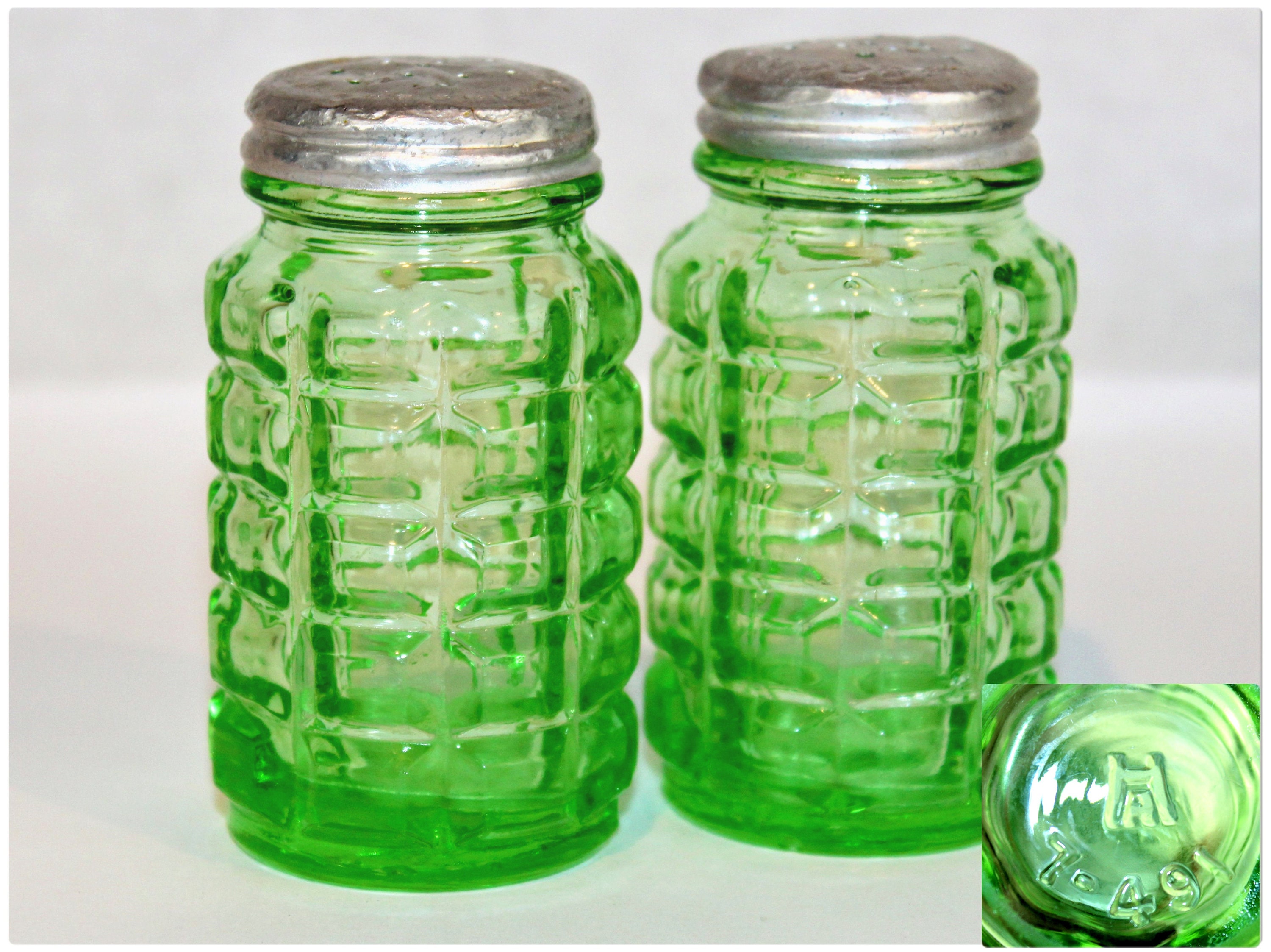 On the bottom each shaker is the Hazel Atlas logo and they are marked with the manufacturing line number followed by the pattern number, 7-491. Hazel Atlas created this pattern between 1929-1931 at the start of the Great Depression.