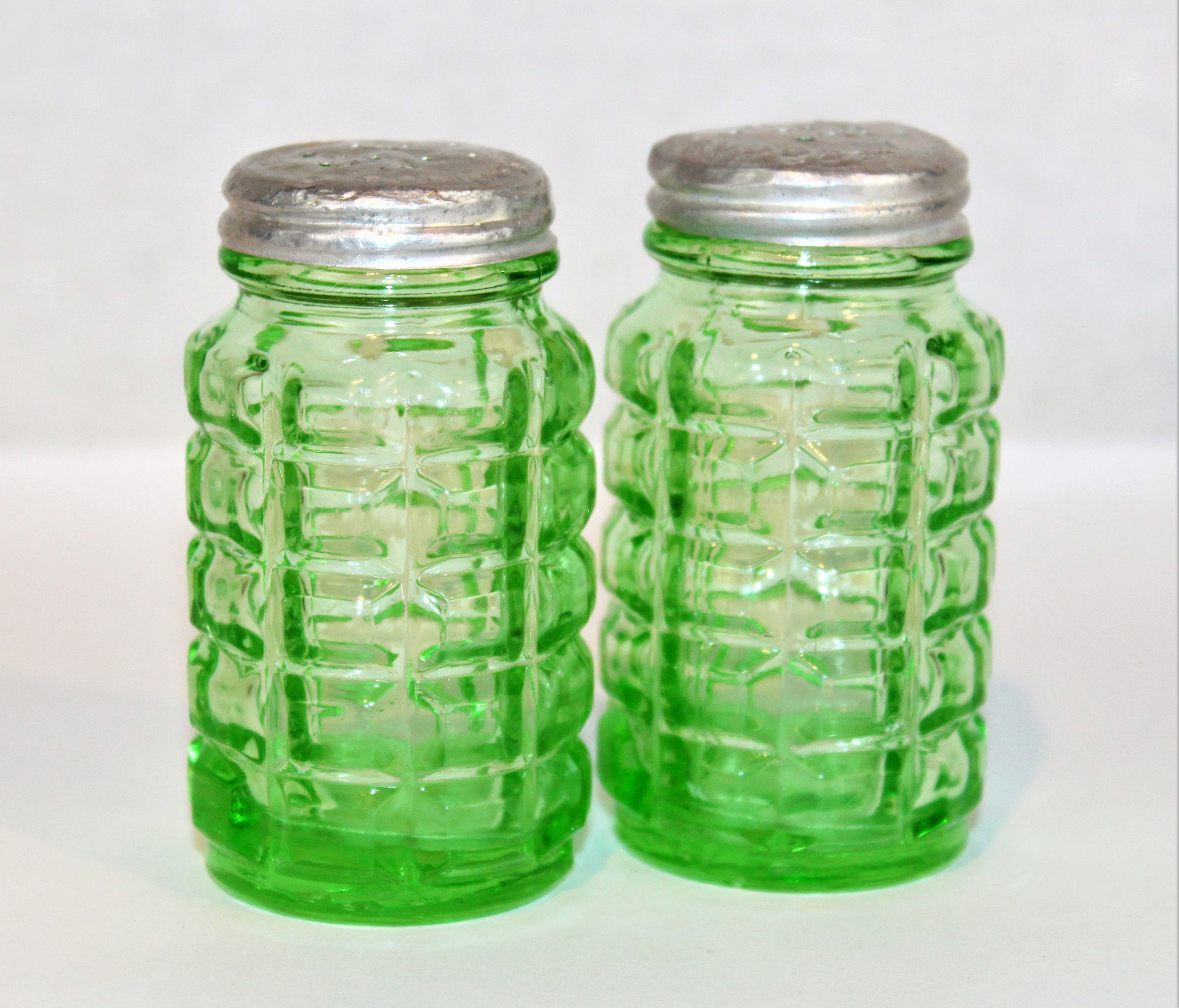 Wonderful find this set of Green Depression Glass Salt and Pepper Shakers made by the Hazel Atlas Company, this is known as the Block Pattern 491