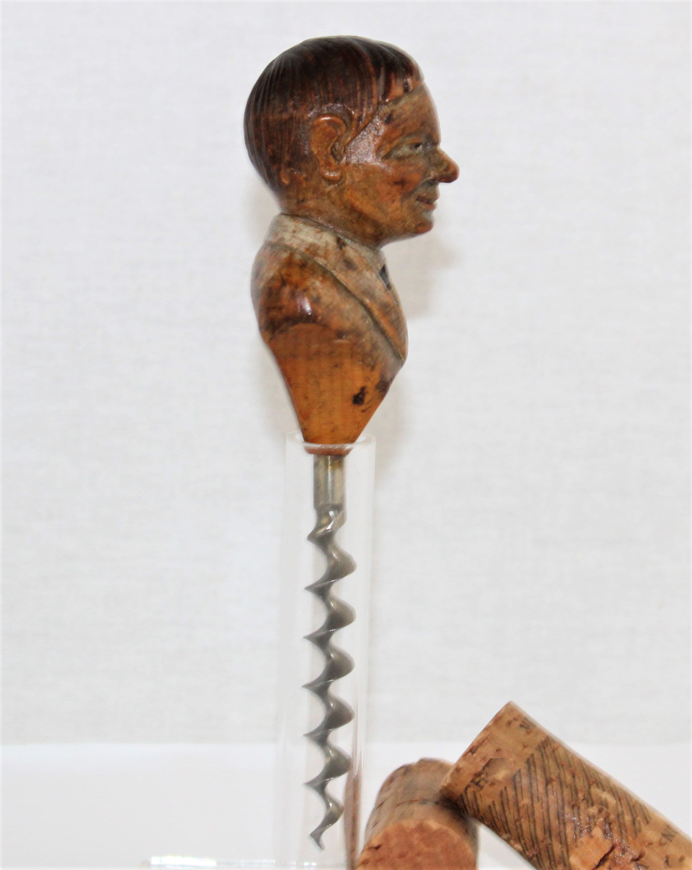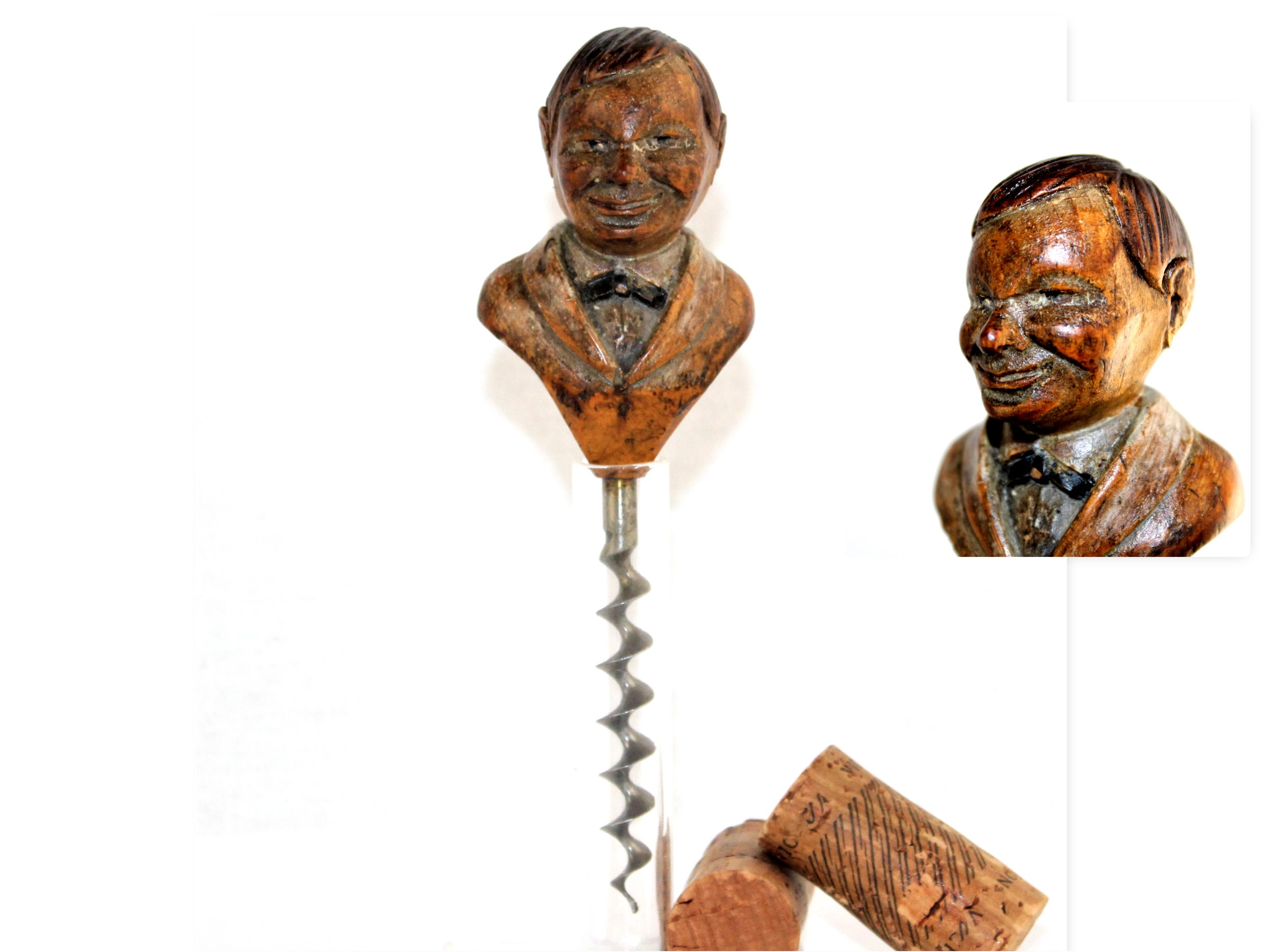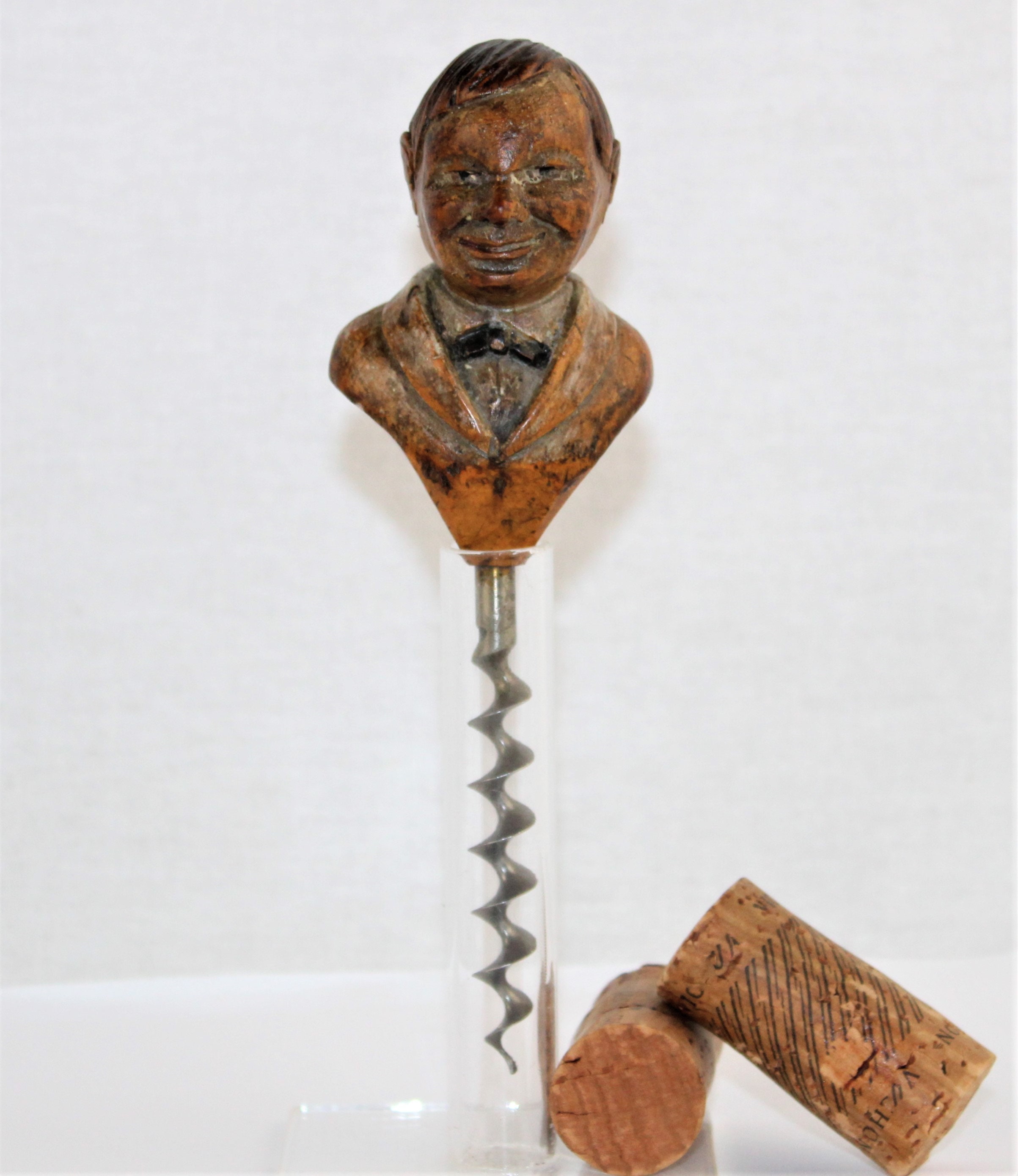 Wonderful highly collectible hand carver Anri woodcarving. This is the Waiter corkscrew. Anri made several different types of barware corkscrews, this is considered a standalone piece with tapered shoulders / waistline that led down to the corkscrew. These were made in the 1920-1960s this one was made around the 1920.