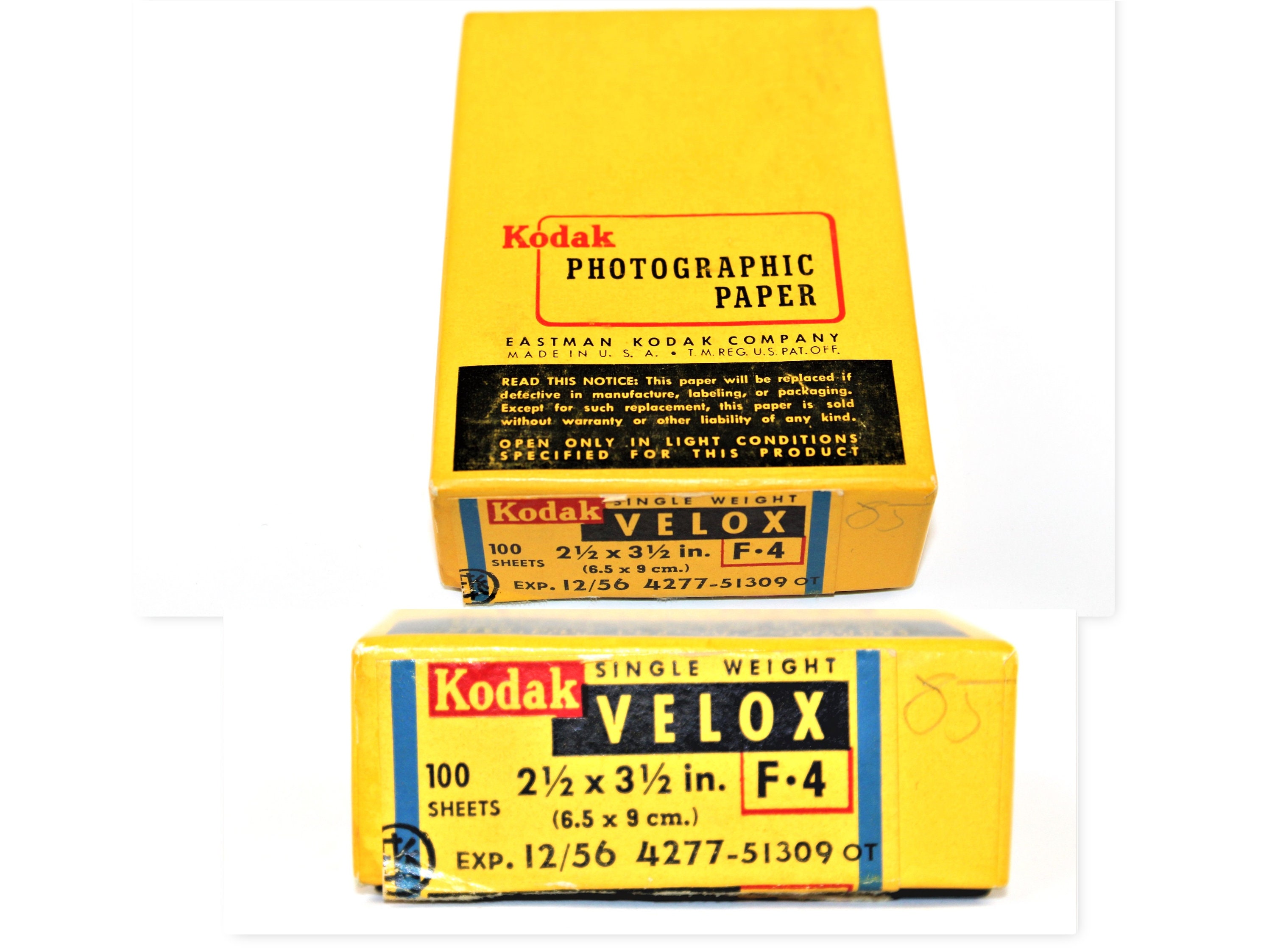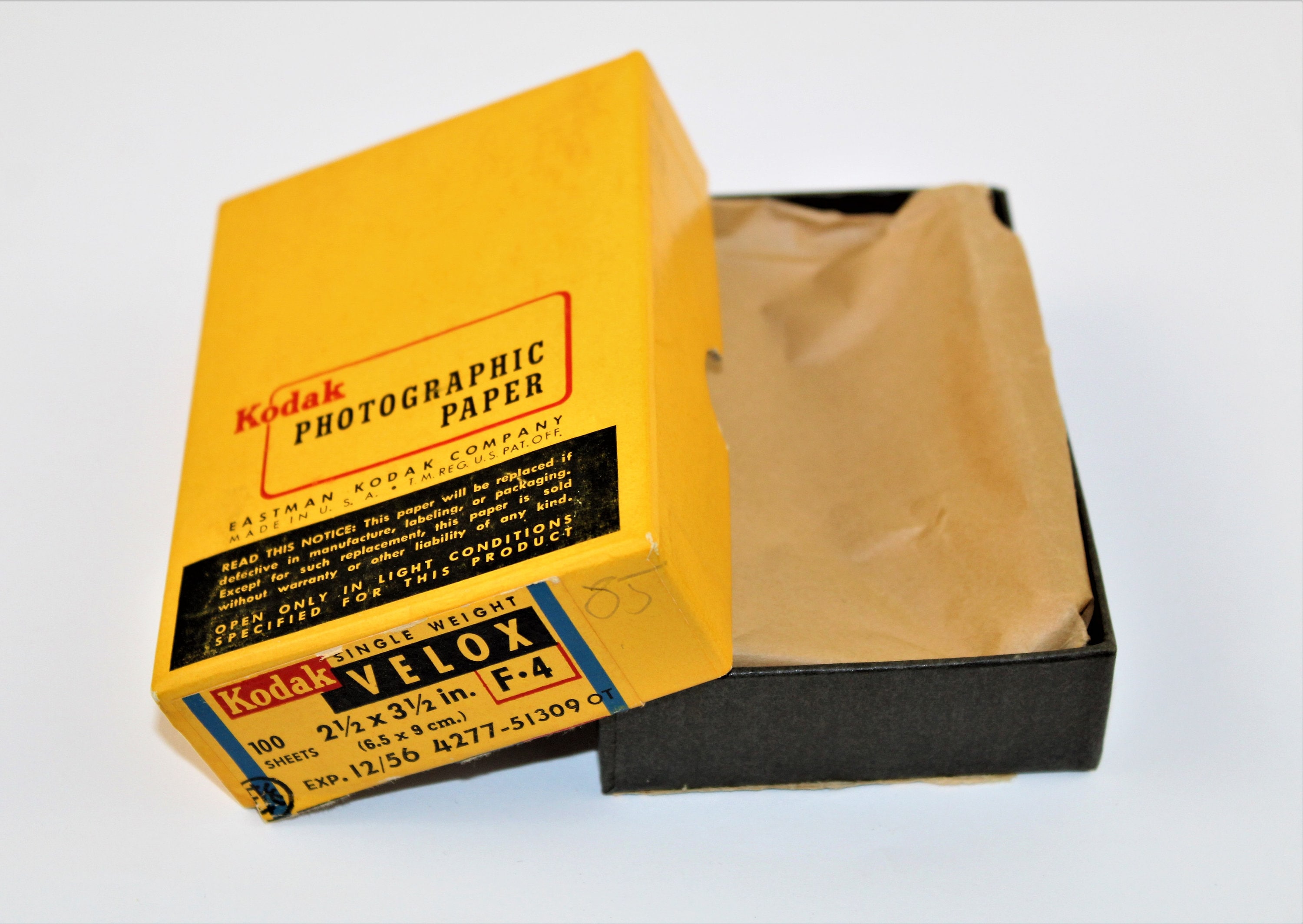 1956 processing paper to make 2 ½” x 3 ½” photos. Box contains approximately 100 sheets of Kodak Velox F4 single weight paper.
