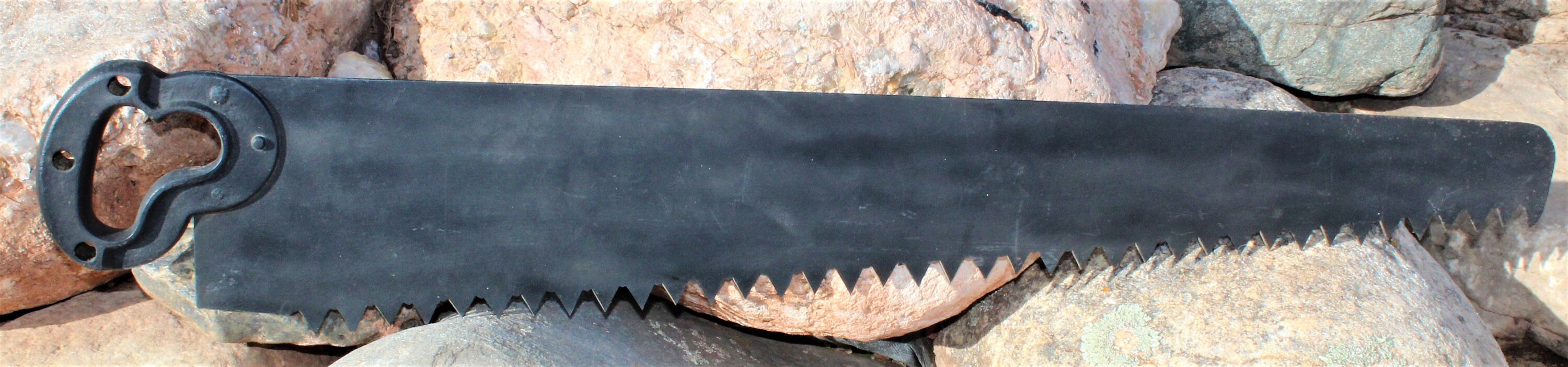 Wonderful piece of American History this turn of the century 1900 Ice Saw. Ice harvesting was a huge industry before the days of refrigeration, people used large chunks of ice to cool food and beverages for transport and home use. This saw is made of steel with an iron handle the saw teeth are ¾” long and very sharp. The saw was painted black at some point which most likely helped preserve the metal.