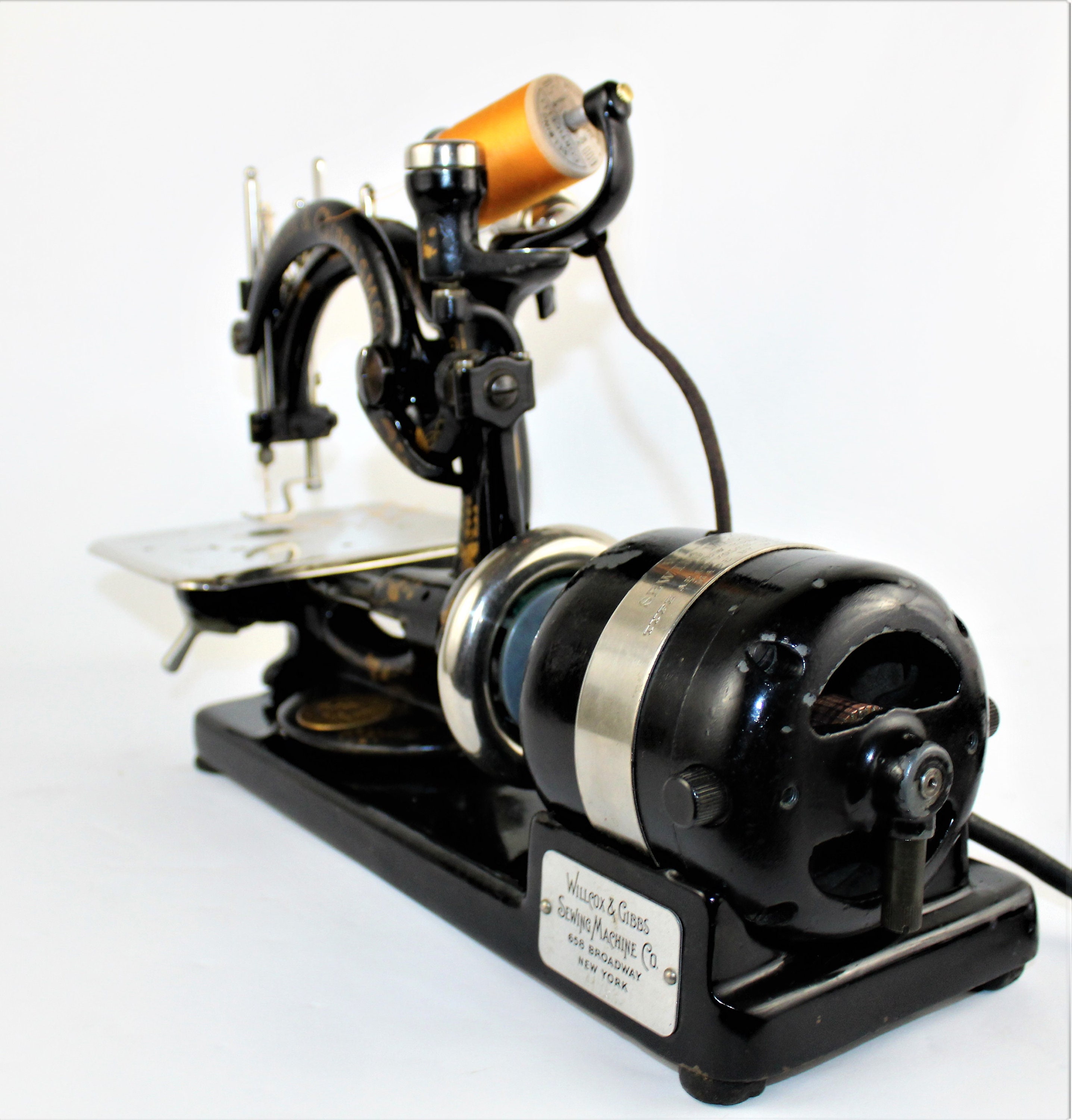 This is one of the first portable electric sewing machines produced in the United States, made by the Wilcox and Gibbs Sewing Machine Company New York N.Y. Wilcox and Gibbs started manufacturing sewing machines in the late 1850s. This design machine was produced as a Hand Crack Machine, Treadle Foot Pump Machine and an Electric Machine. This is a single thread machine that produces a chain stitch.