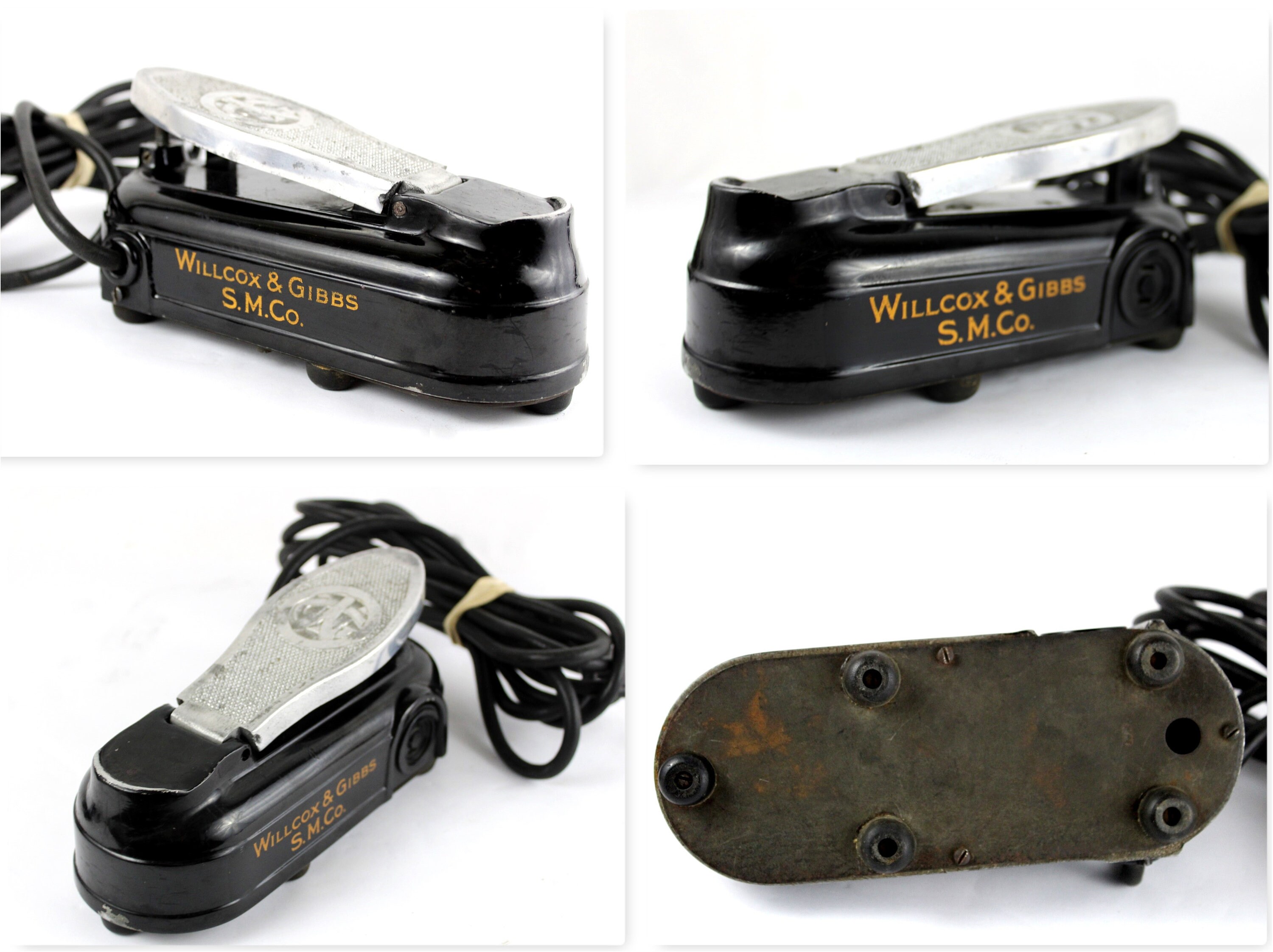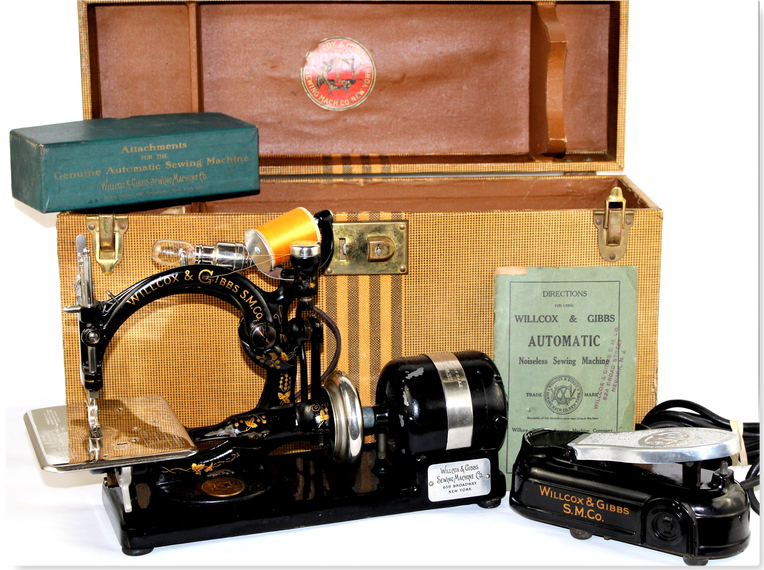 CASE Condition, case is the original made of fabric covered wood construction with the Wilcox and Gibbs logo, it shows wear as shown in the pictures, but very solid and sturdy, the top of case has a taped-on label, we believe this was from the factory when it was first shipped. It can be removed.