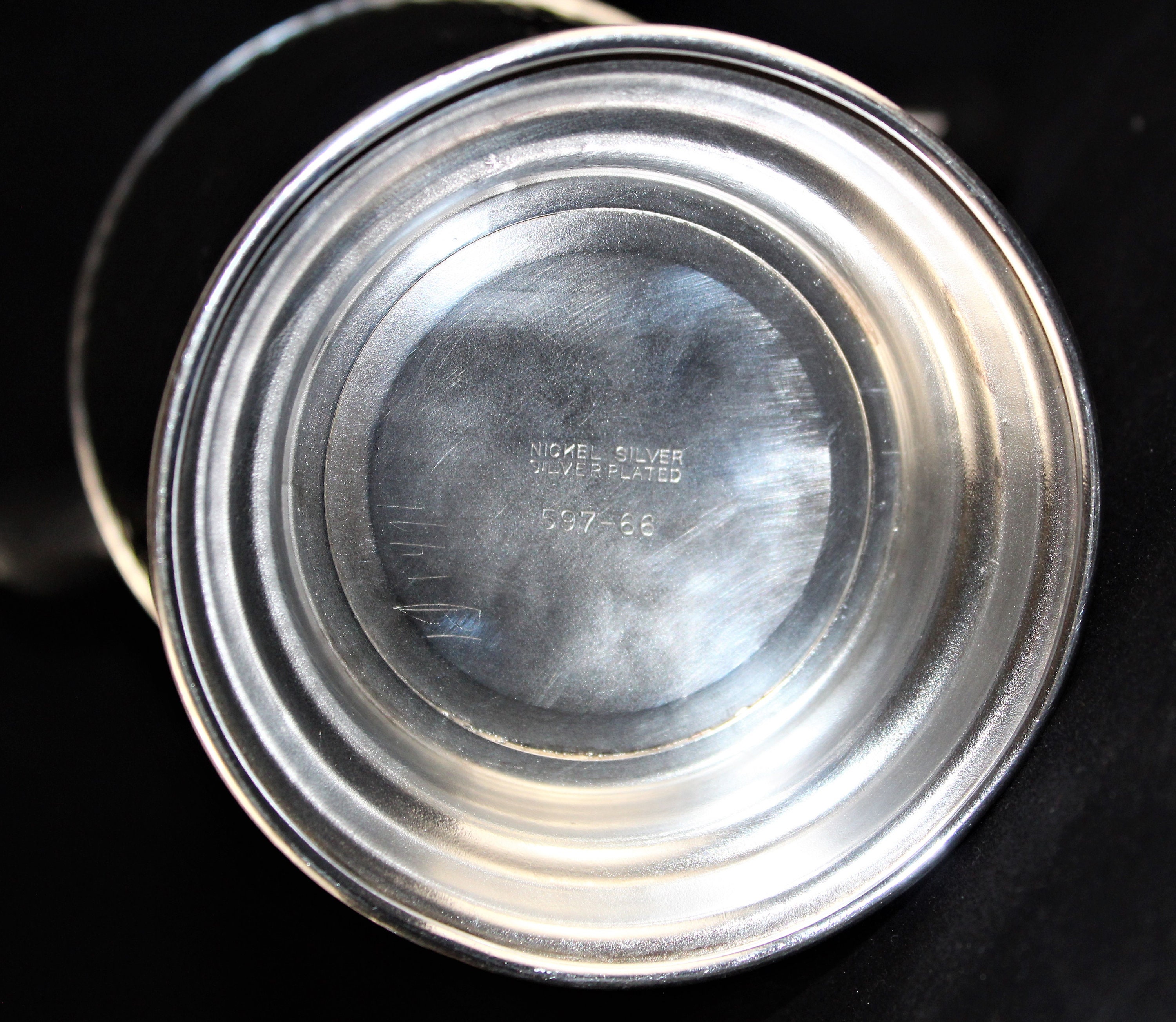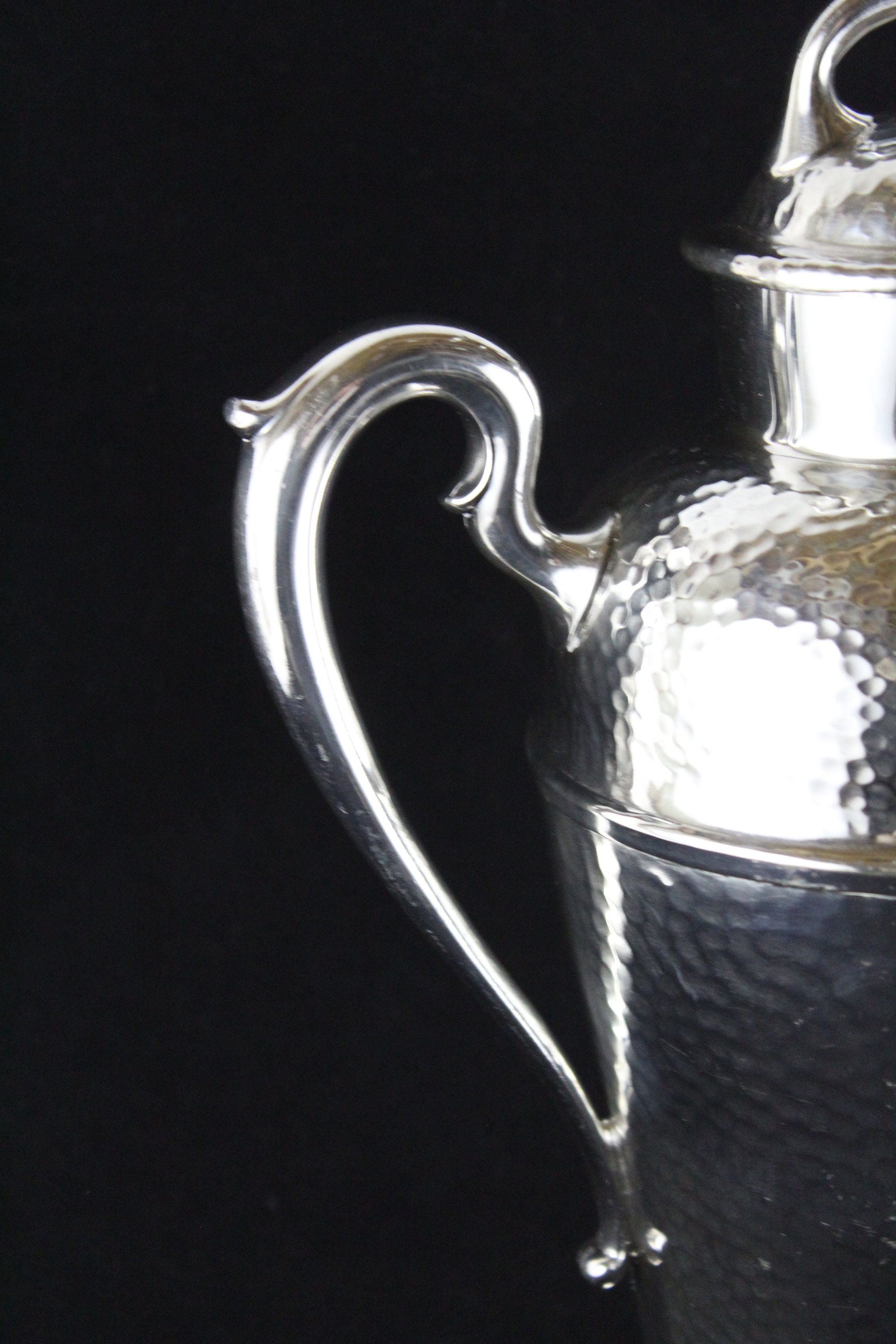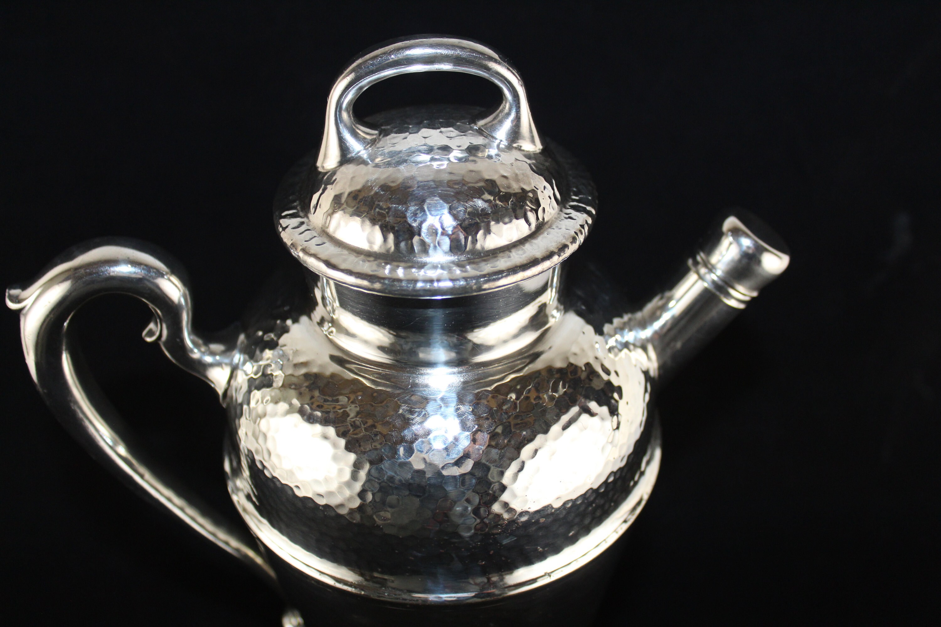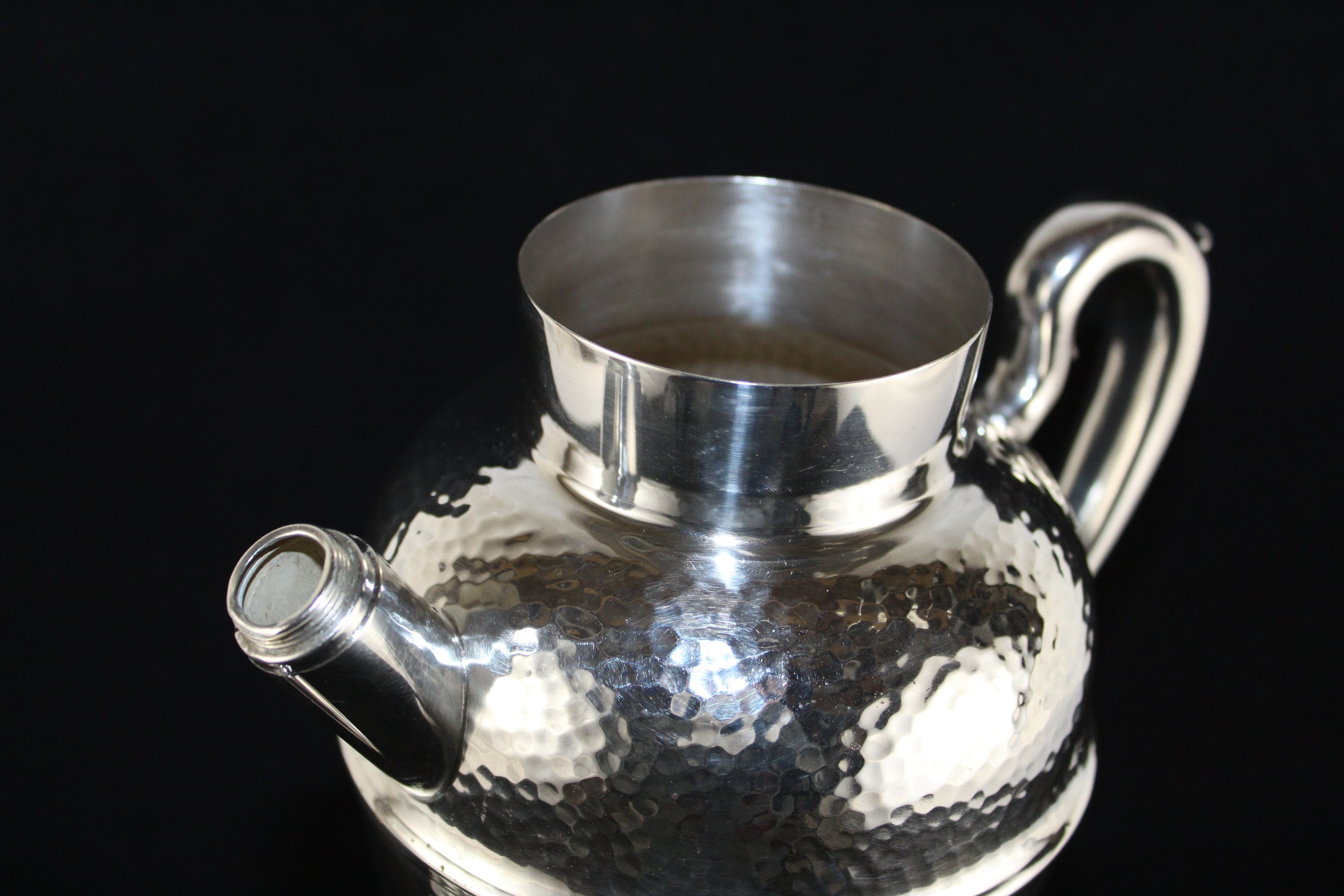 Wonderful Art Deco Style Martini Shaker, marked Nickel Silver Silver-Plated 597-66. The shaker is made of silver-plated brass / copper with a wonderful, hammered finish there is a band that circles the midsection, the top cap and spout cap have cork attached to the inside to seal the shaker when using, the spout cap unscrews, and the spout has a built-in screen to prevent ice from entering your drink.