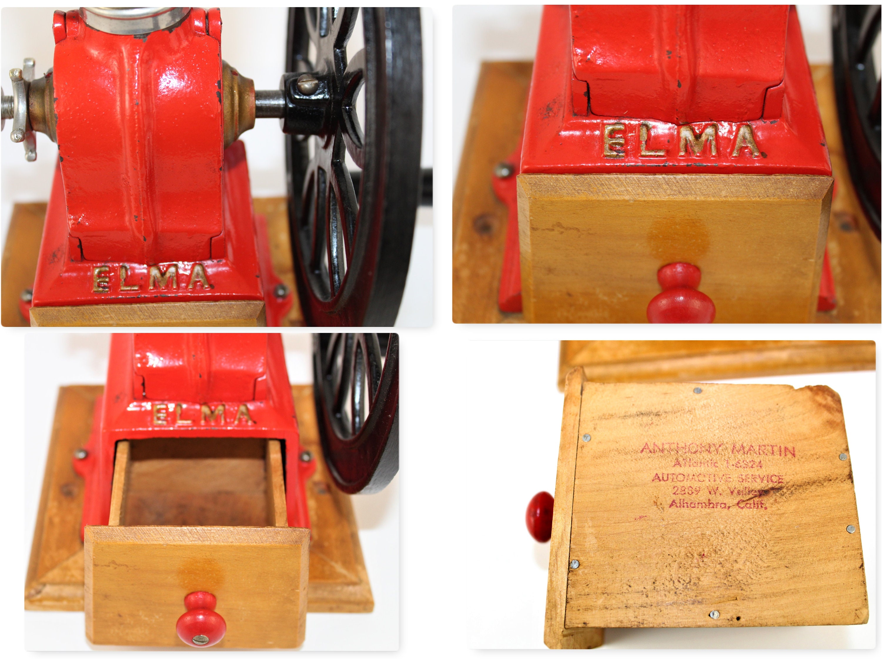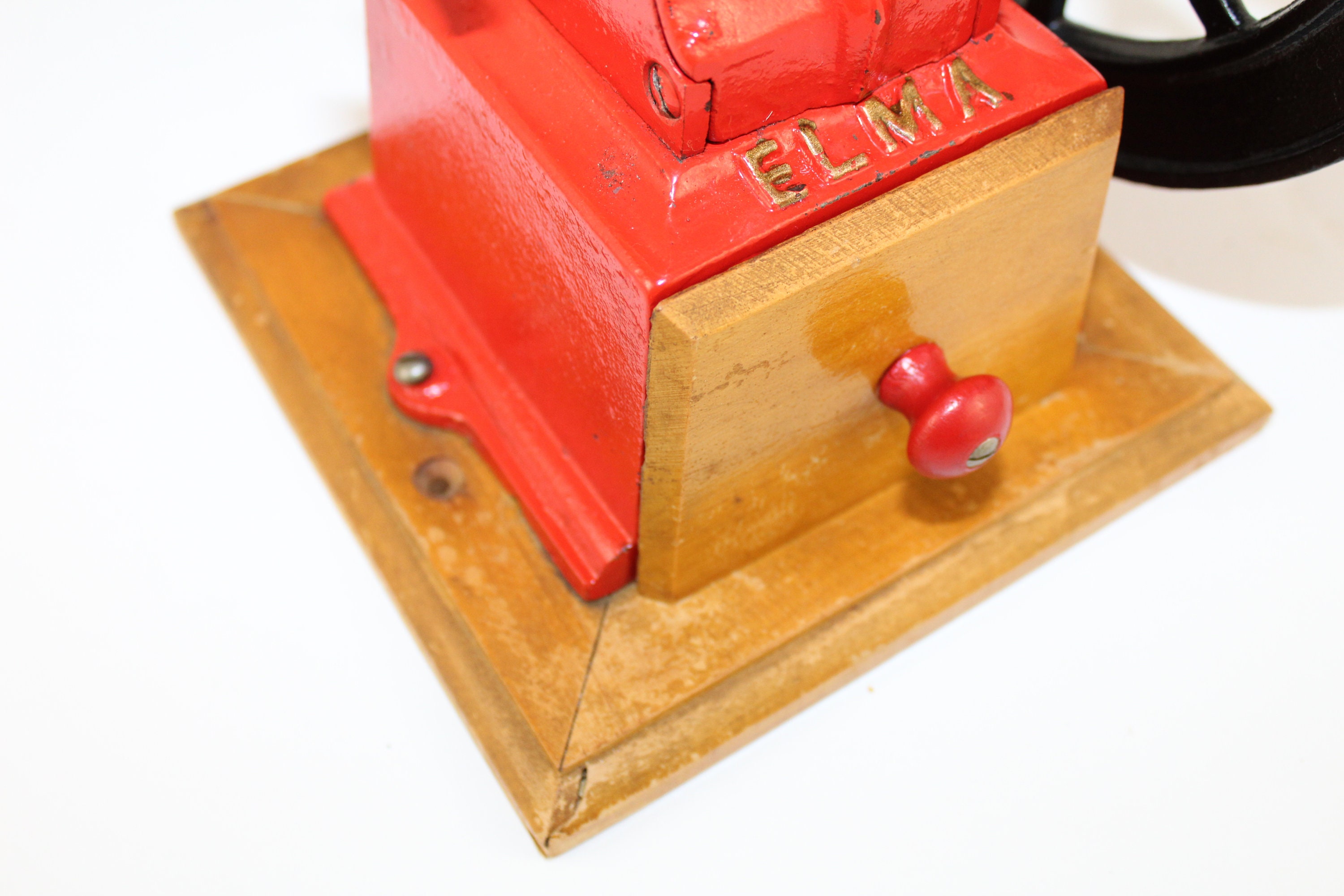 Wonderful find this early 1930s Elma Coffee Mill Manufactured in Spain by the Elma Mfg. Co. This mill is a work of art and a beautiful display piece ready to use daily or as an eye catcher when displayed. Made of cast iron body with wooden drawer and base. The removable hopper with lid is made of tin and painted gray. The mill is all original, the paint is original and in extremely nice condition for its age. This countertop Mill is adjustable to get the perfect grind by adjusting the screw on the side.