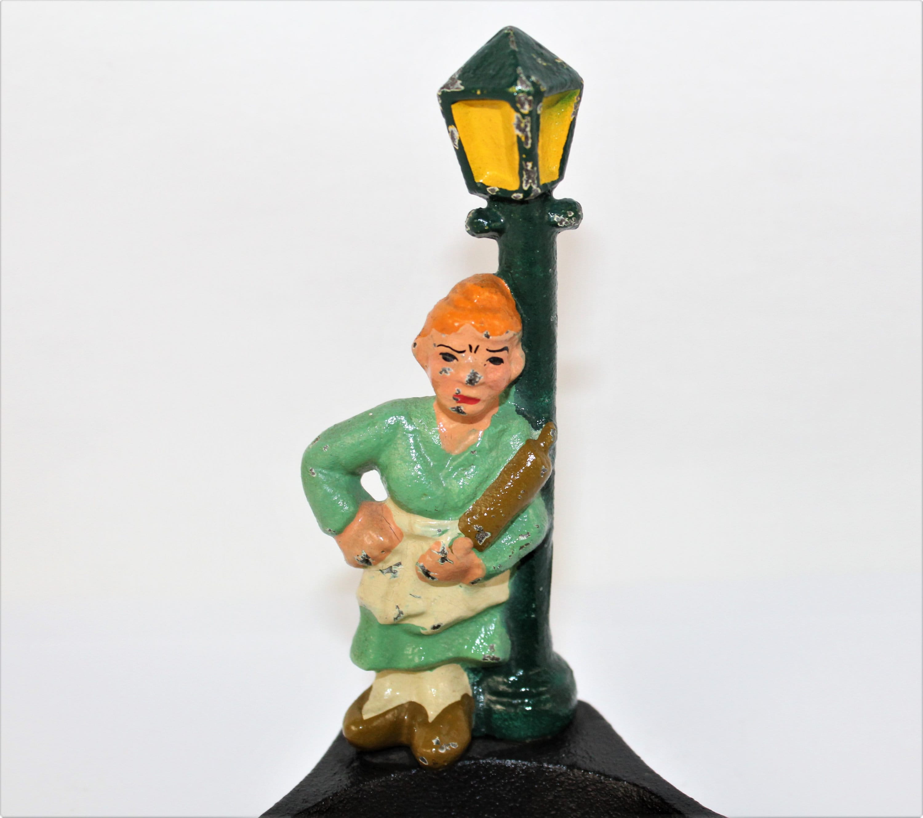 The character is a very upset lady holding a rolling pin and waiting for her husband.