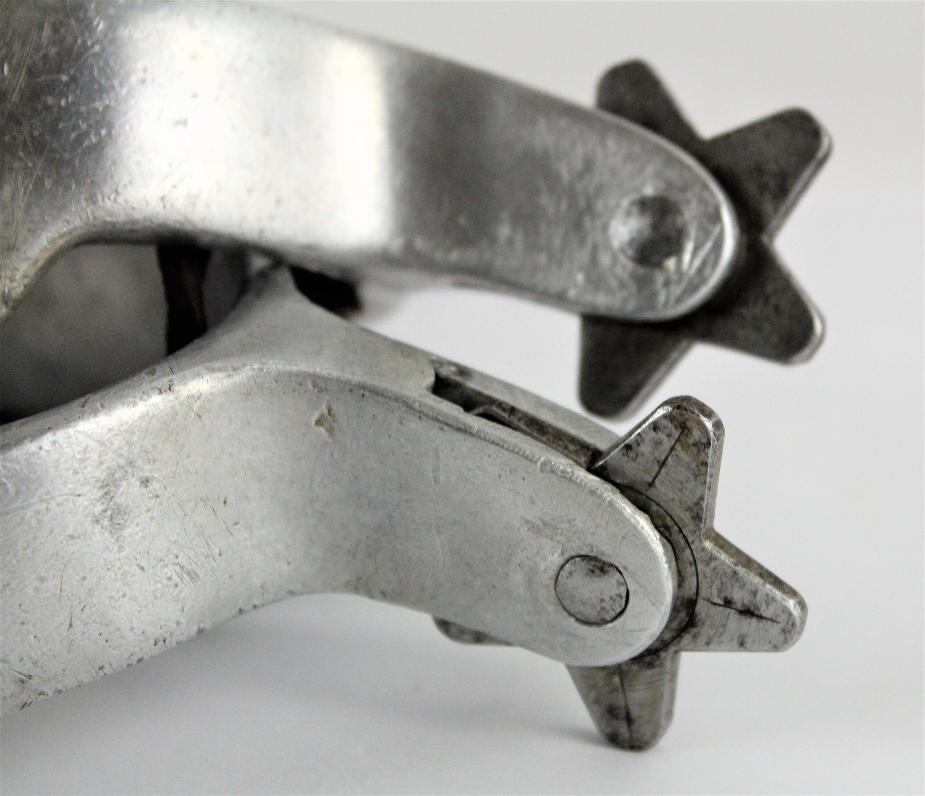 Straight off the cowboy this set of vintage Western Spurs made by Ricardo. This is a pair of aluminum frame spurs with a steel five-point rowel and tooled leather straps. Each spur is marked on the bottom of the shank.