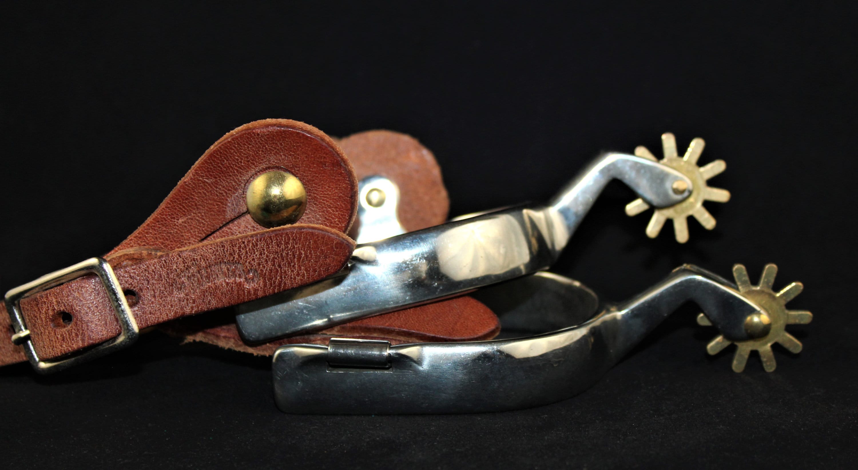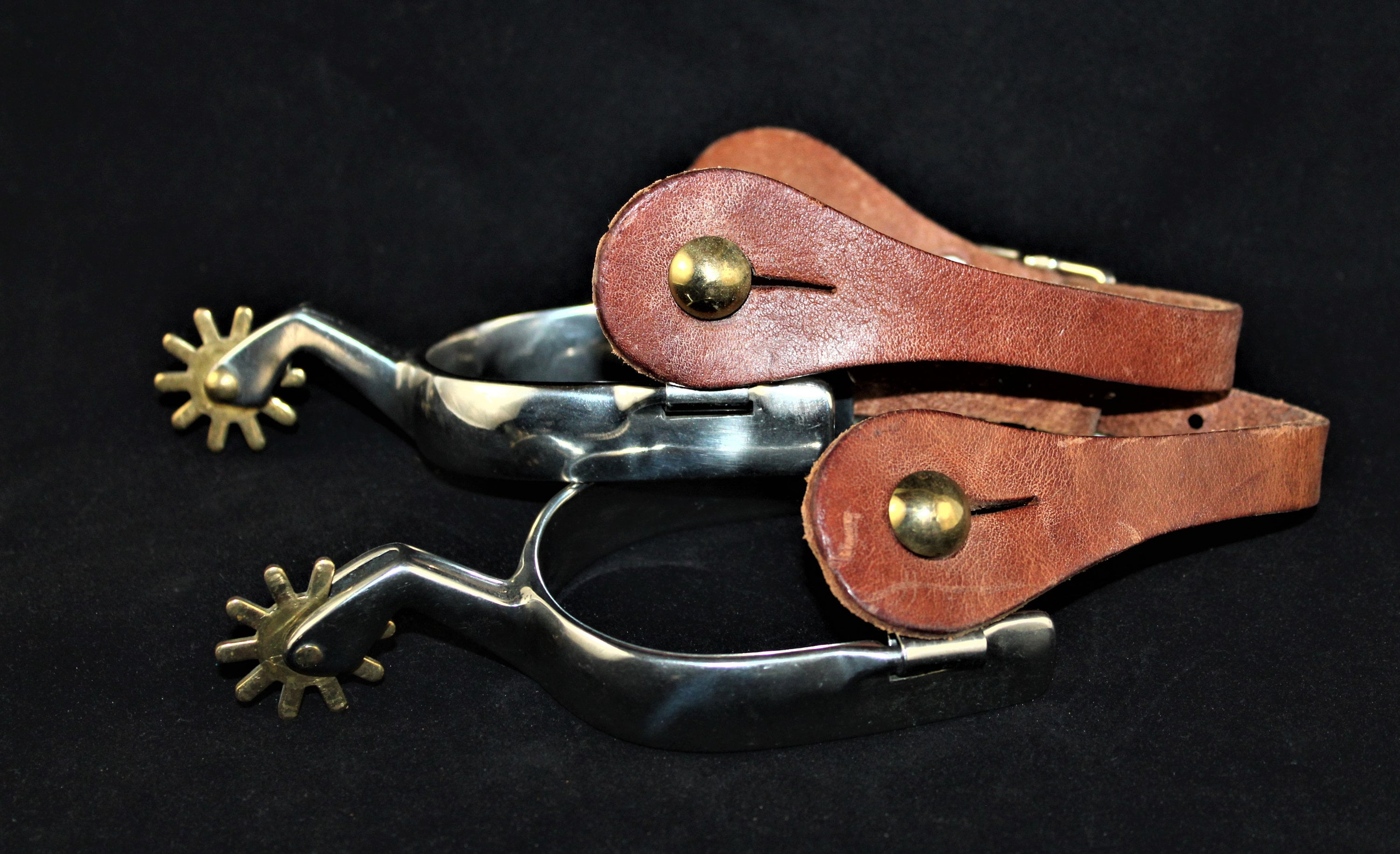 Pair of chrome plated steel spurs with 1 ¼” brass ten-point rowels and strap buttons with leather straps.