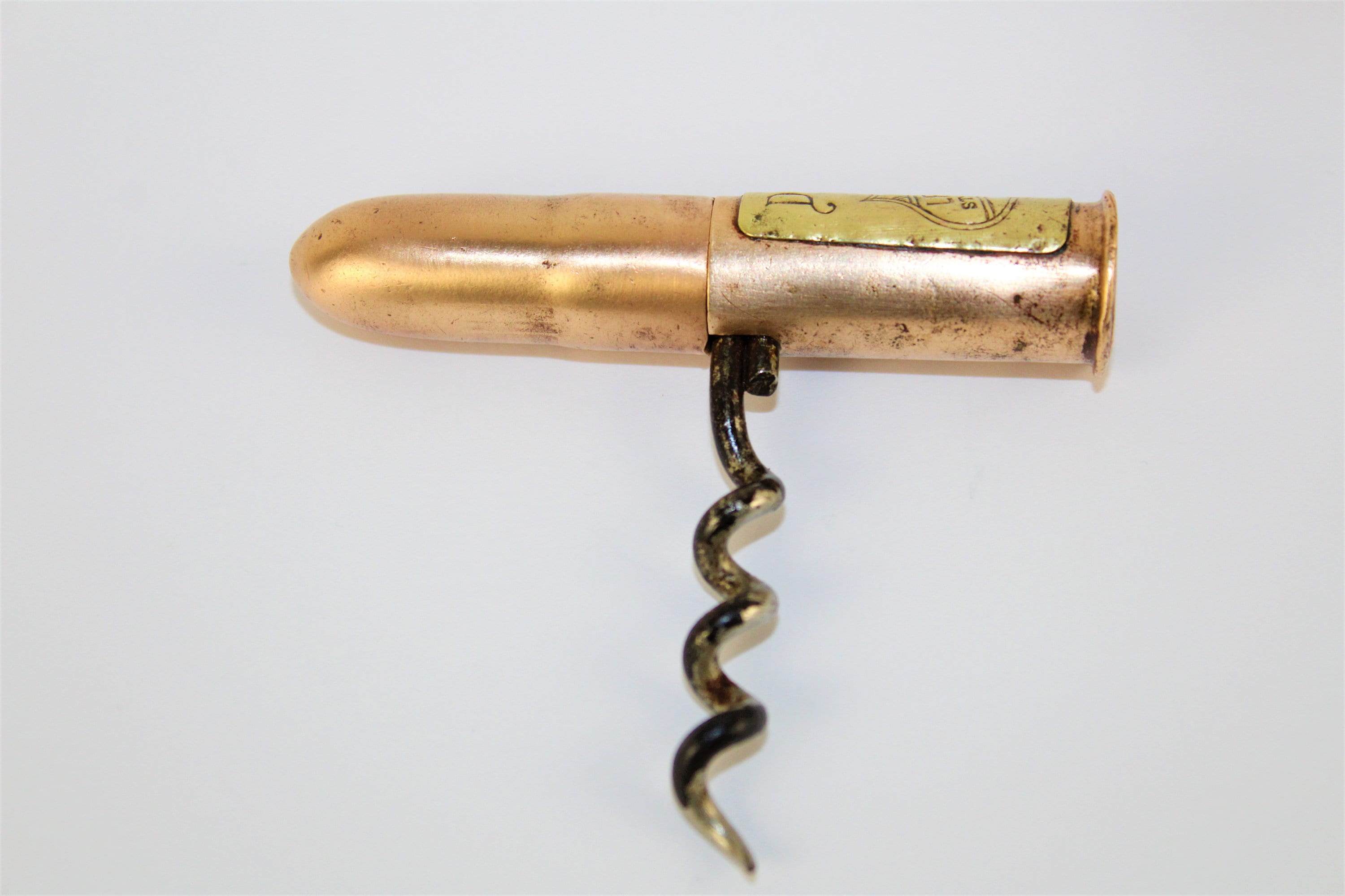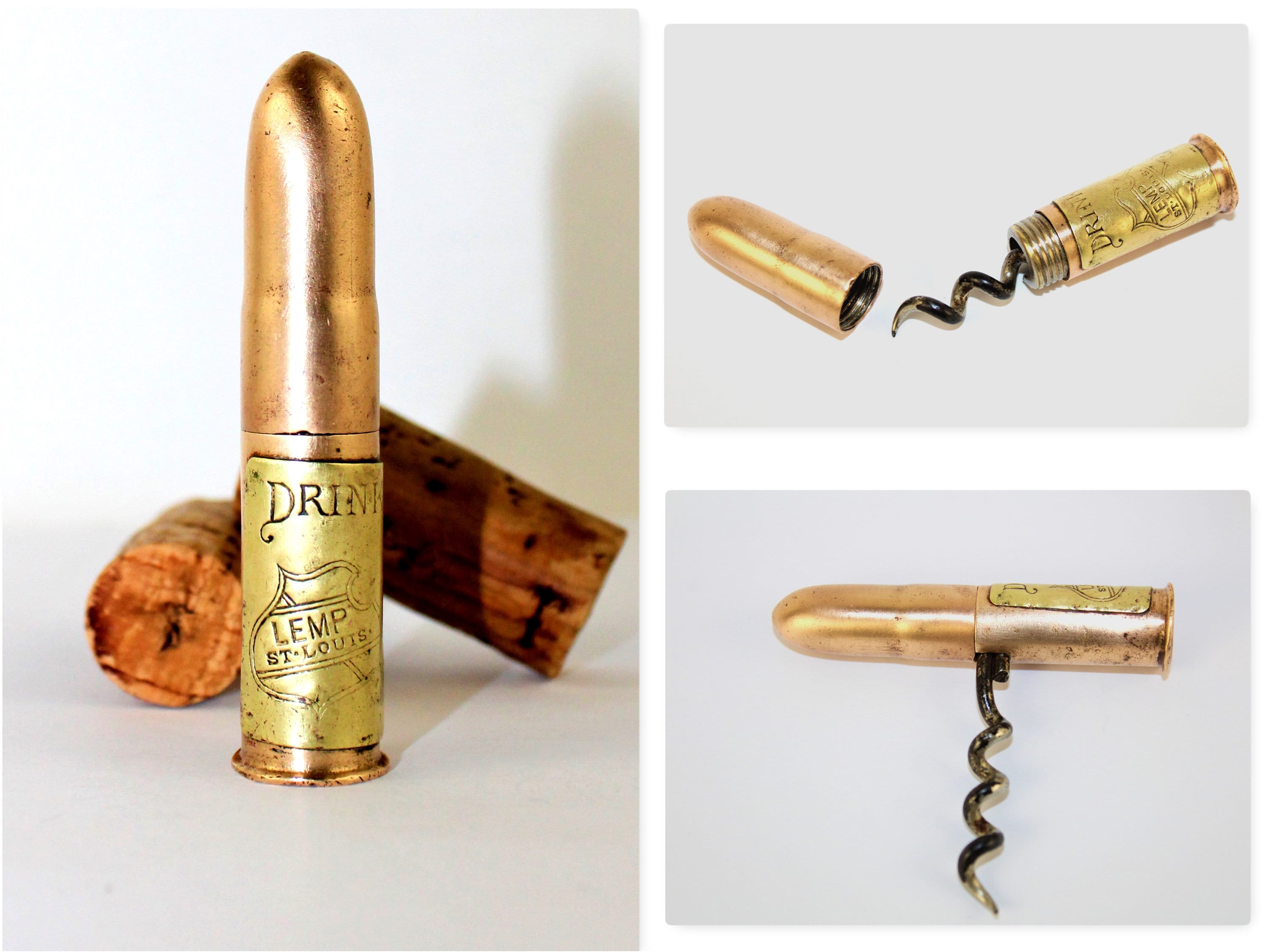 From back in the day when you needed a corkscrew to open a beer bottle this is from the late 1800s made by the Williamsons Co. of Newark N.J. The advertising is for the Wm J Lemp Brewing Co. of St. Louis Mo. for their Lemp Beer. The corkscrew is shaped like a bullet, unscrew the bullet in the middle section and pull out the hidden corkscrew, pivot the corkscrew and reattach the bullet to form a handle for the corkscrew. Made of brass with a corkscrew and slide mechanism.