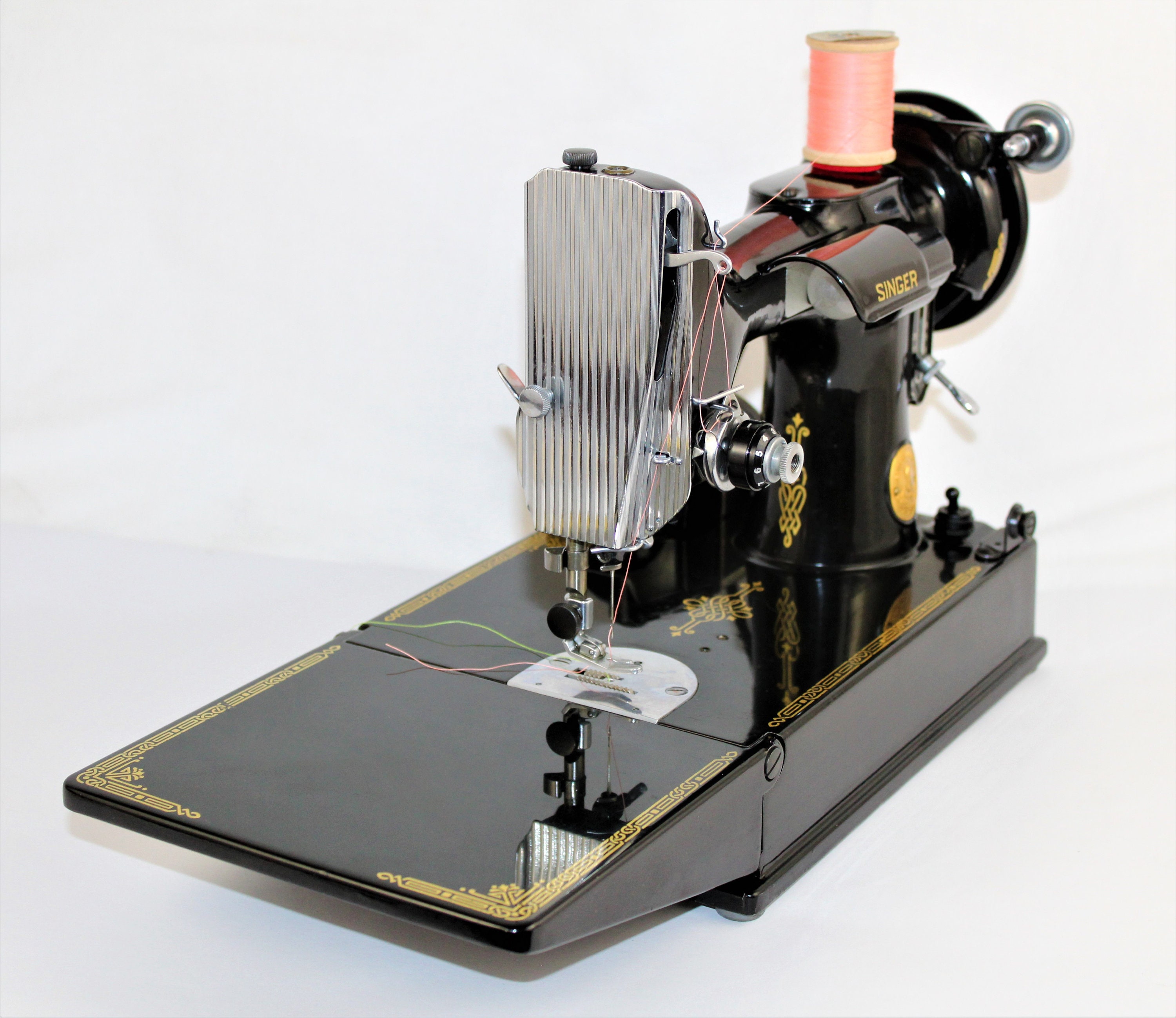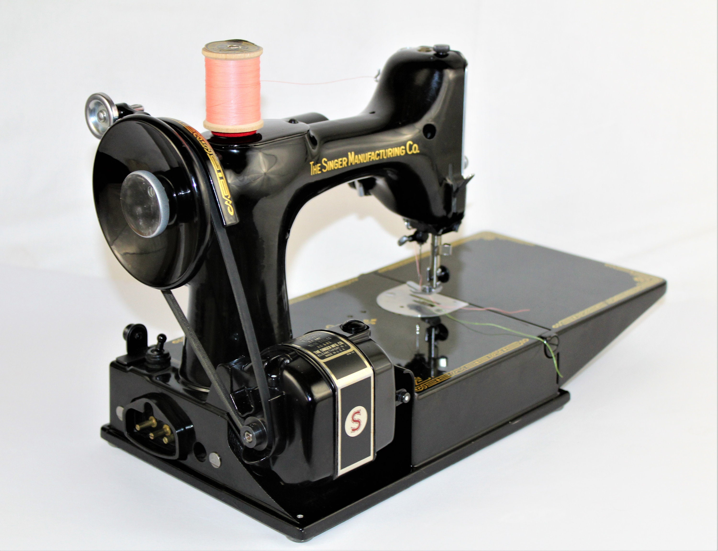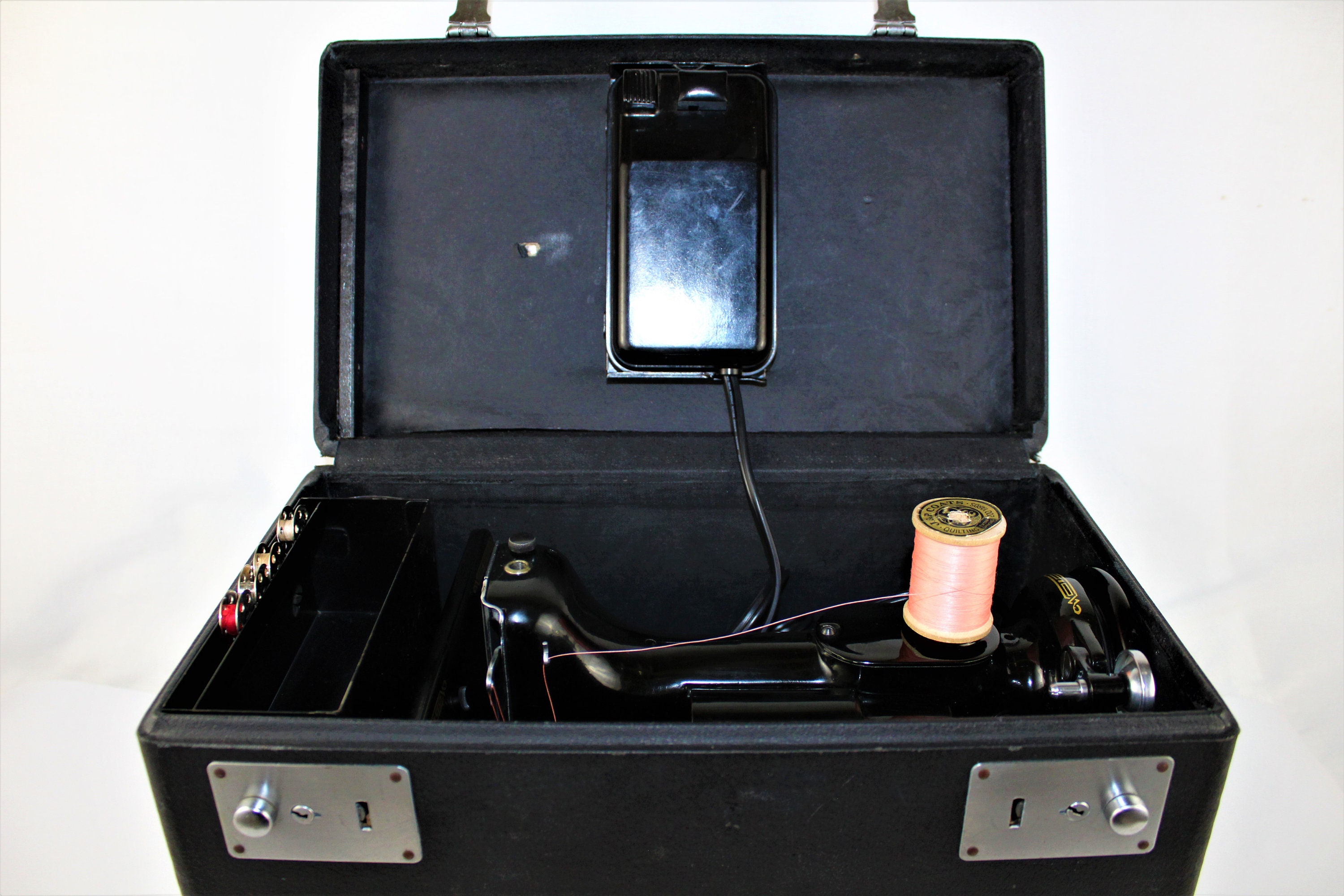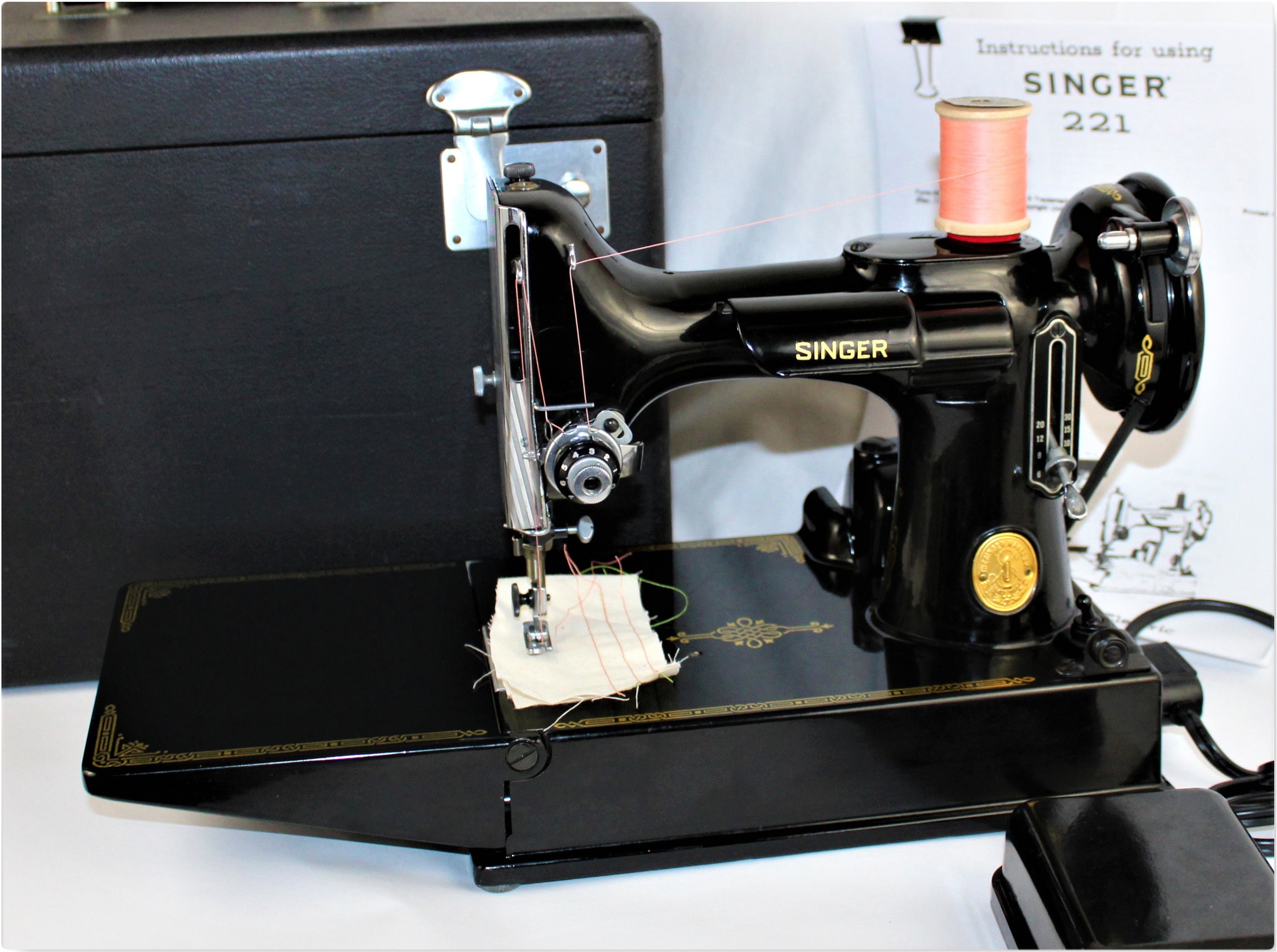 We have for sale a vintage Singer 221-1 portable featherweight sewing machine and carrying case. Serial # AK400245. The machine badge was issued on May 10, 1951, and was manufactured in Elizabethsport, NJ, USA. It has an original 110-volt motor and beautiful chrome trim. The machine, case, instruction book and attachments are all in good vintage condition. We’ve had several machines in the last few years and this one purrs. The case is in good vintage condition showing wear, consistent with age and use.
