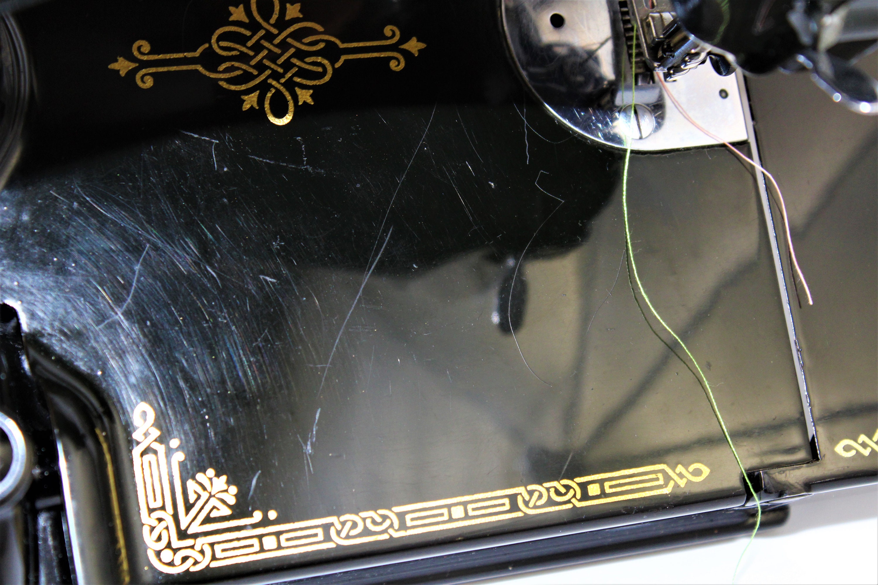 Overall Condition of the MACHINE, runs and operates smoothly, has wear from use on sewing bed, scuffs, and scratches, paint chips (as shown in pictures). The instruction manual is a copy of an original manual.