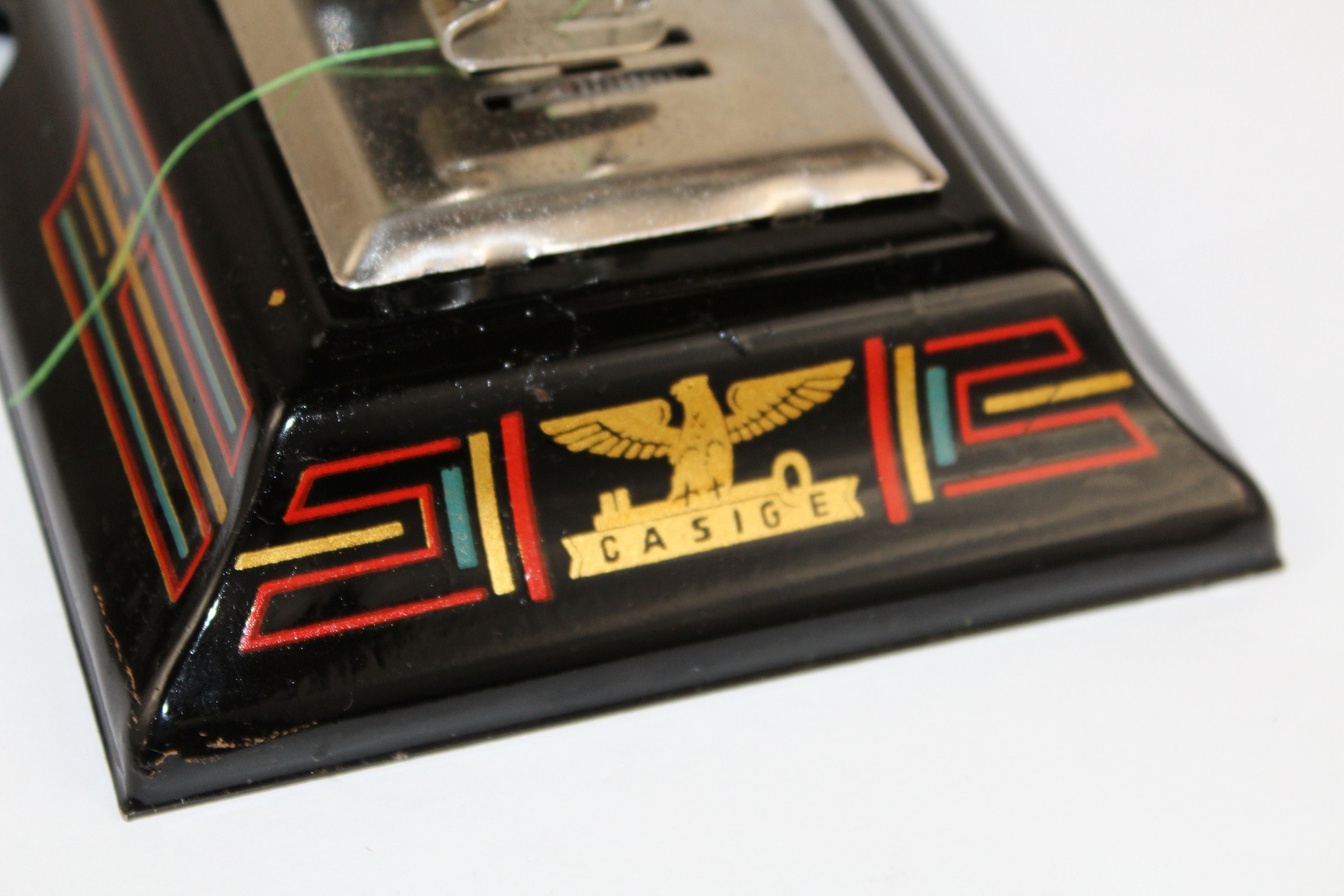 Engraved on the silver sewing plate is an eagle and Casige Made in Germany British Zone. Color is a gloss black and, on the base, has a wonderful art deco design.