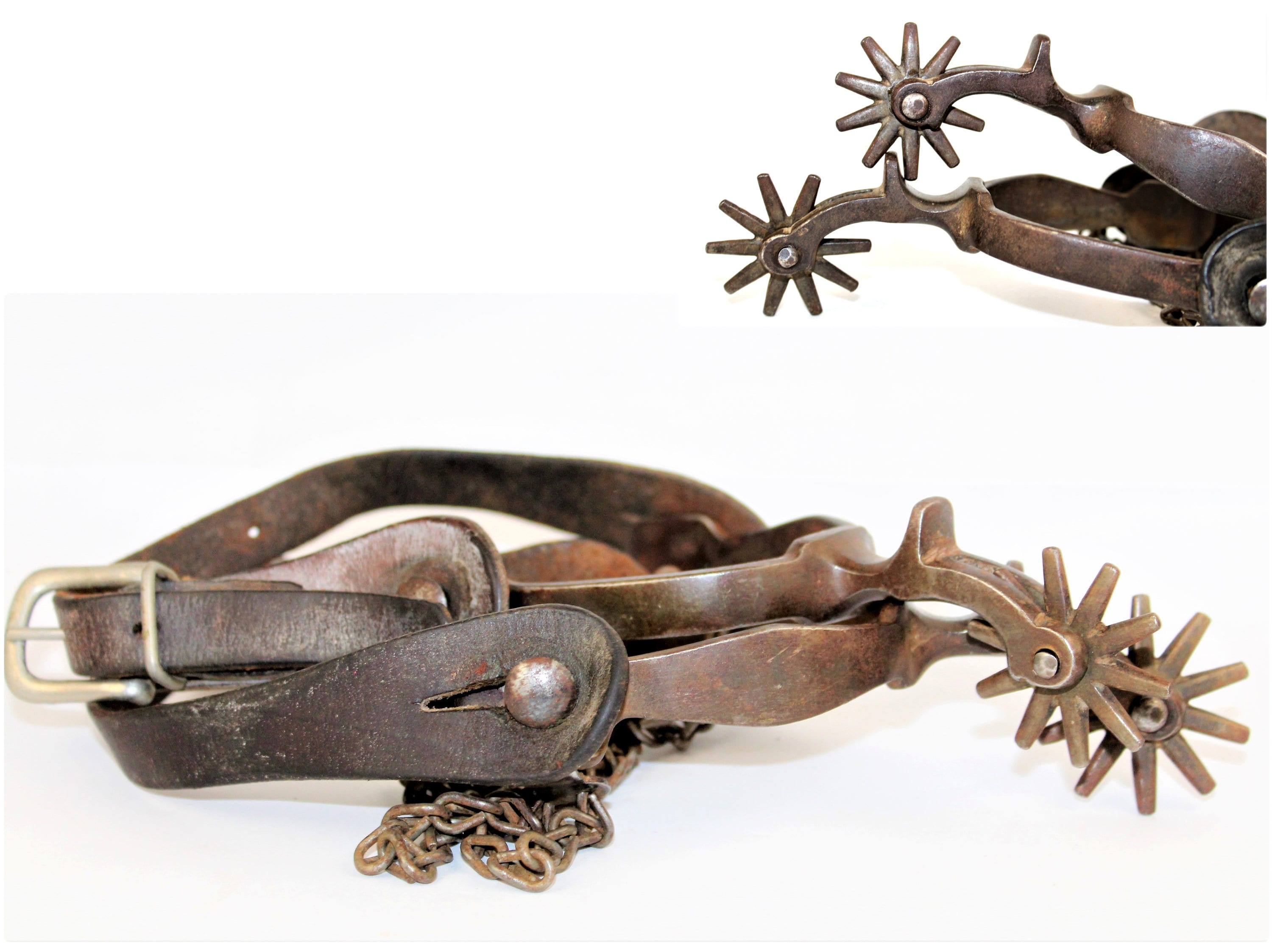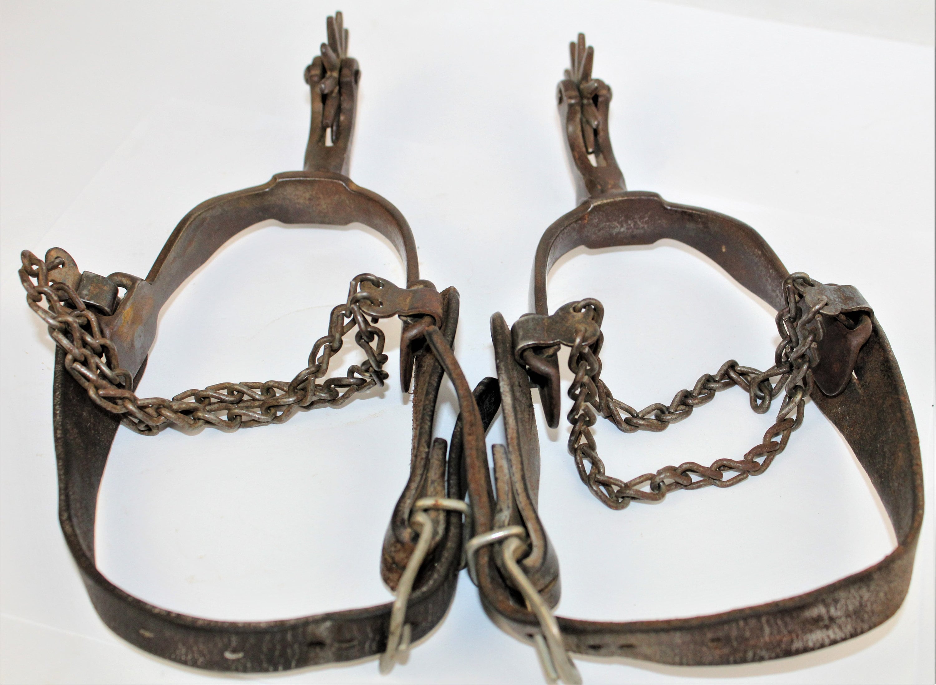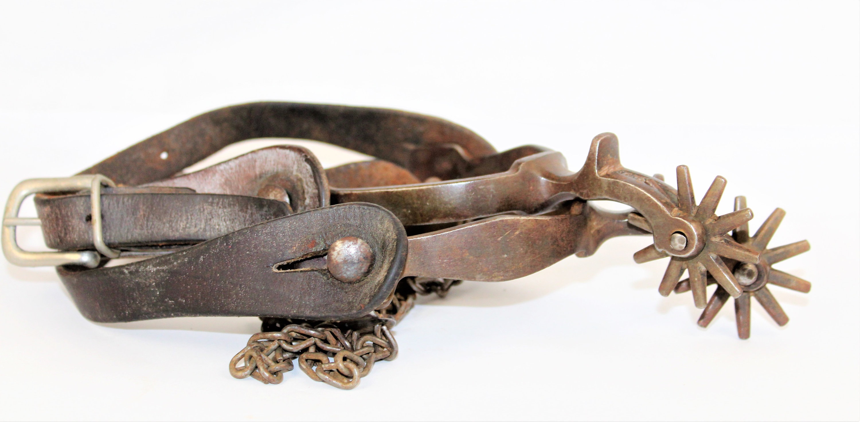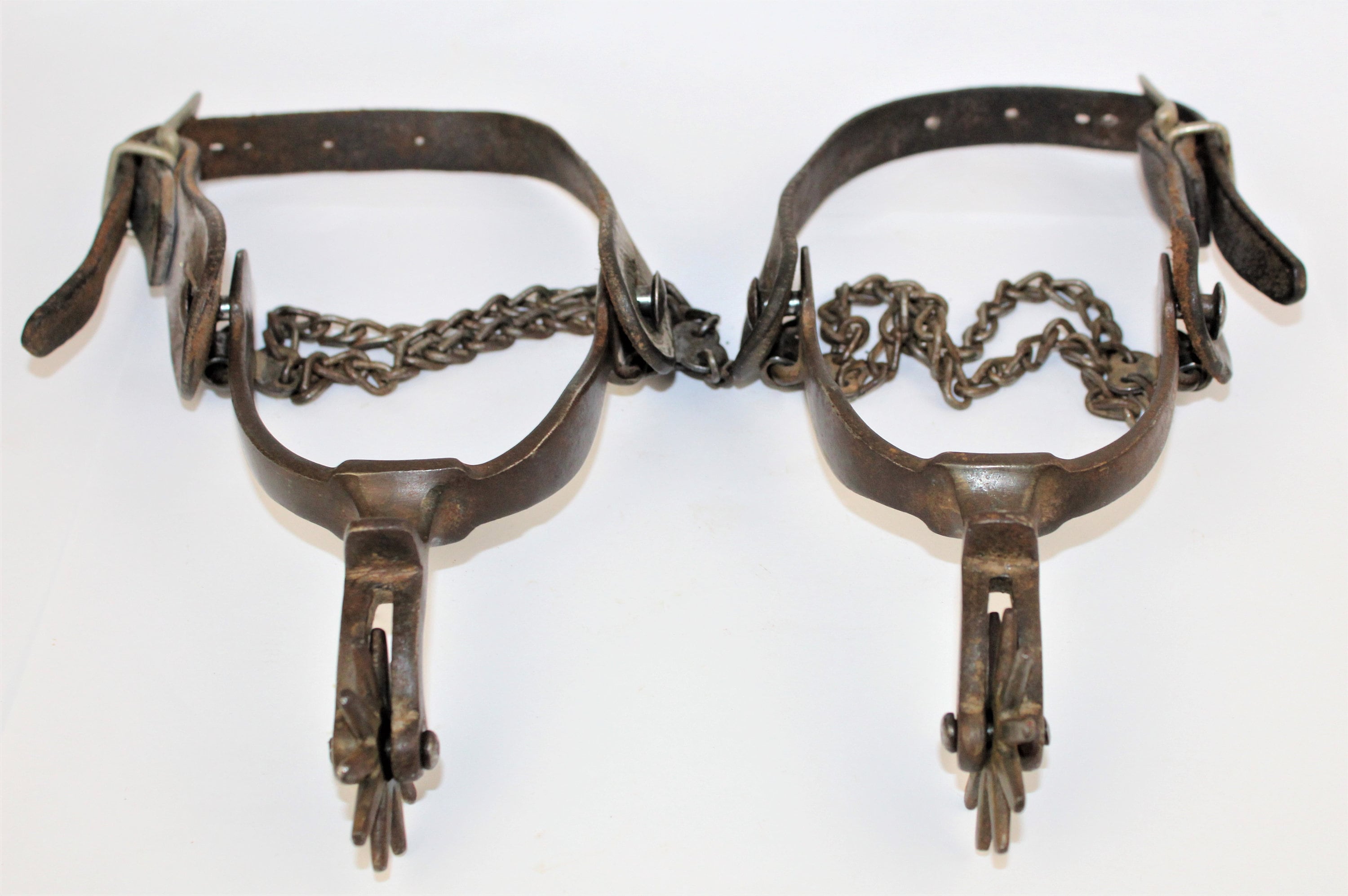 Wonderful pair of western spurs, the spurs are unmarked but have all the characteristics of North and Judd spurs made in New Britain, Connecticut. They are a forged spurs with chap guard and have a large 1¾” - 10-point rowel, they have a 2¼” shank and the heal band / yoke has about a 3” spread, spurs also have boot heal chains.