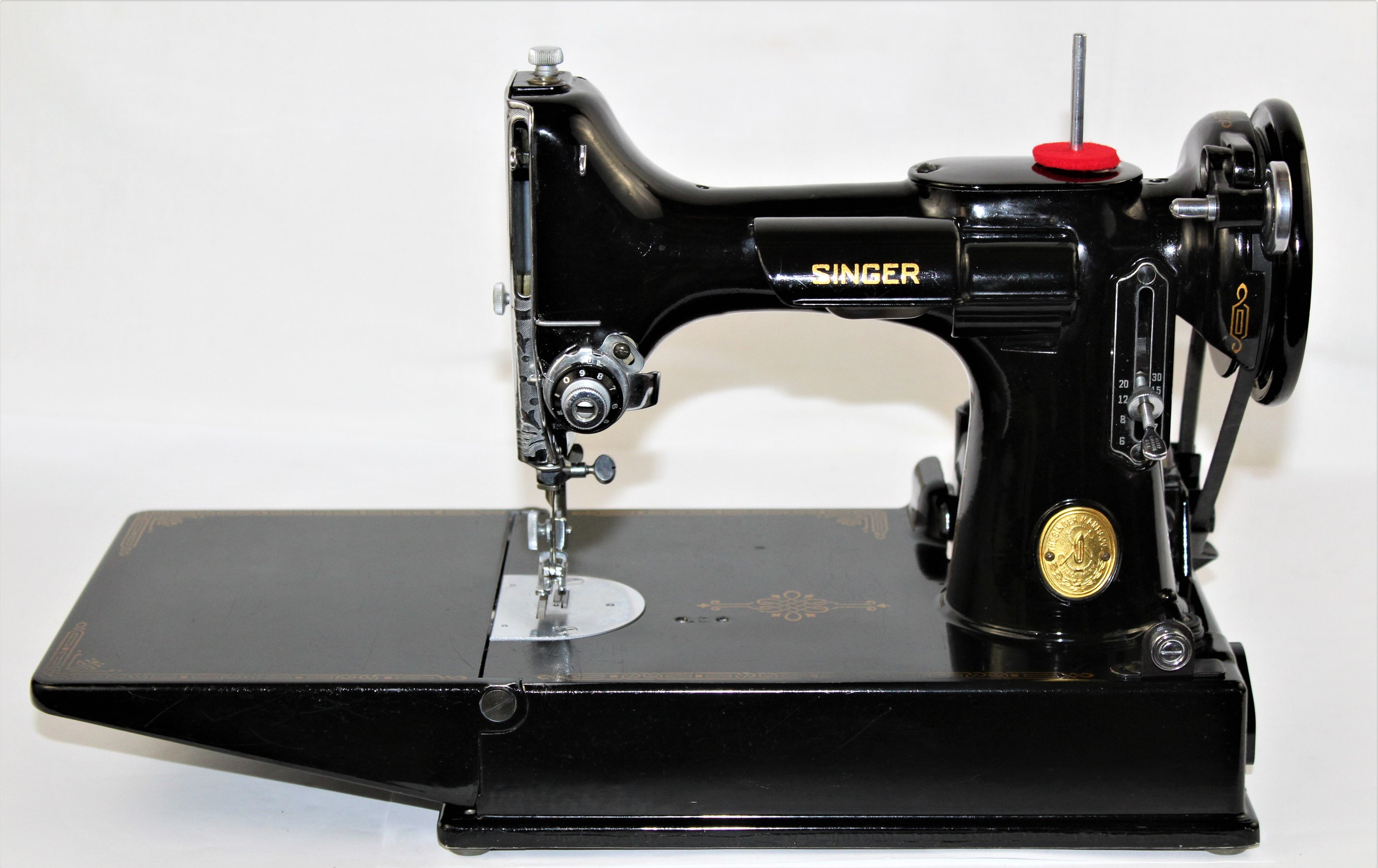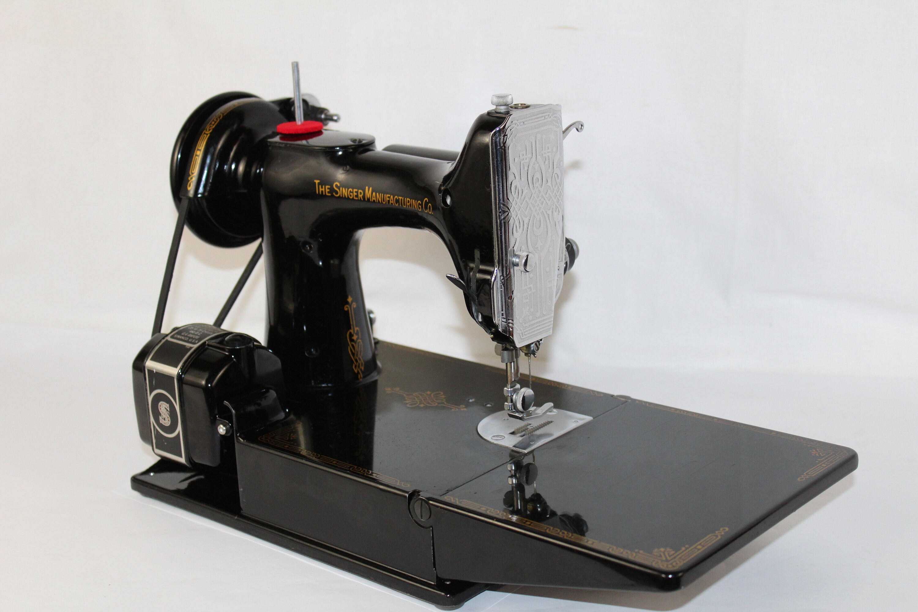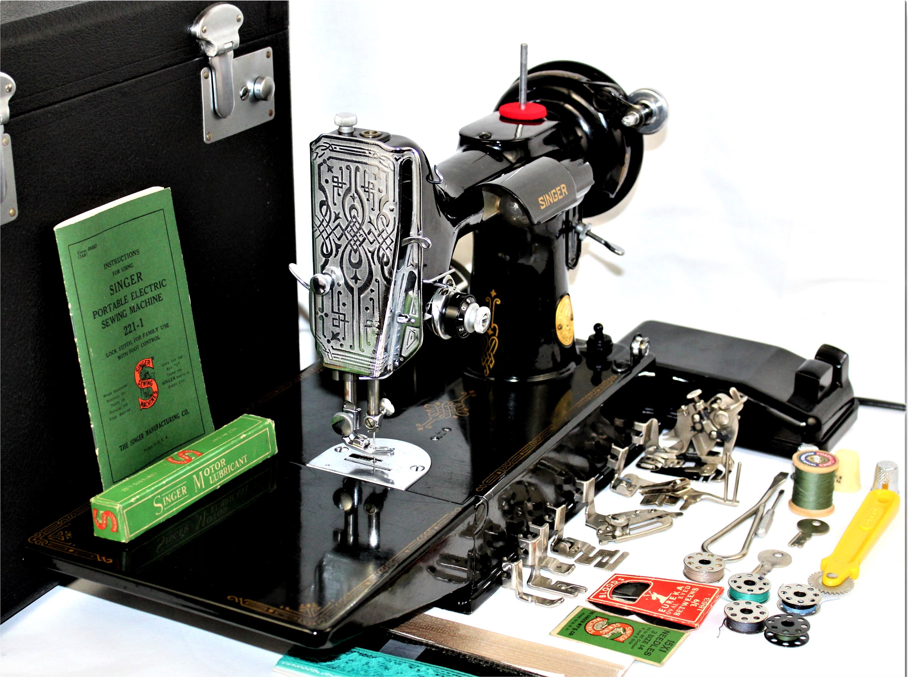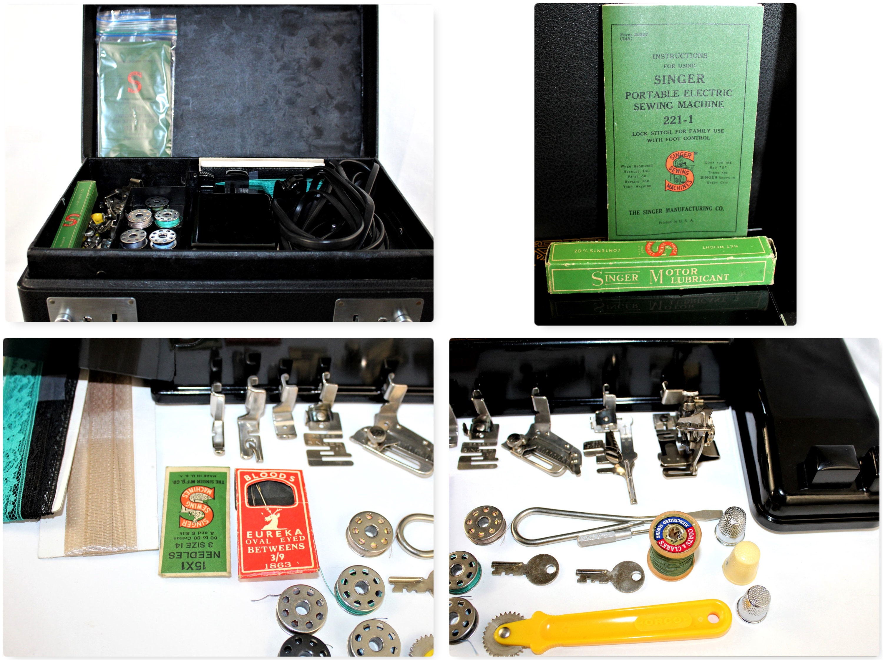 We have for sale a vintage Singer 221-1 portable featherweight sewing machine and carrying case. Serial # AH196550. The machine badge was issued on Aug 19, 1947, and was manufactured in Elizabethsport, NJ, USA. It has an original 110-volt motor and beautiful chrome trim. The machine, case, and attachments are all in good vintage condition. We’ve had several machines in the last few years and this one purrs. The case is in good vintage condition showing wear, consistent with age and use.