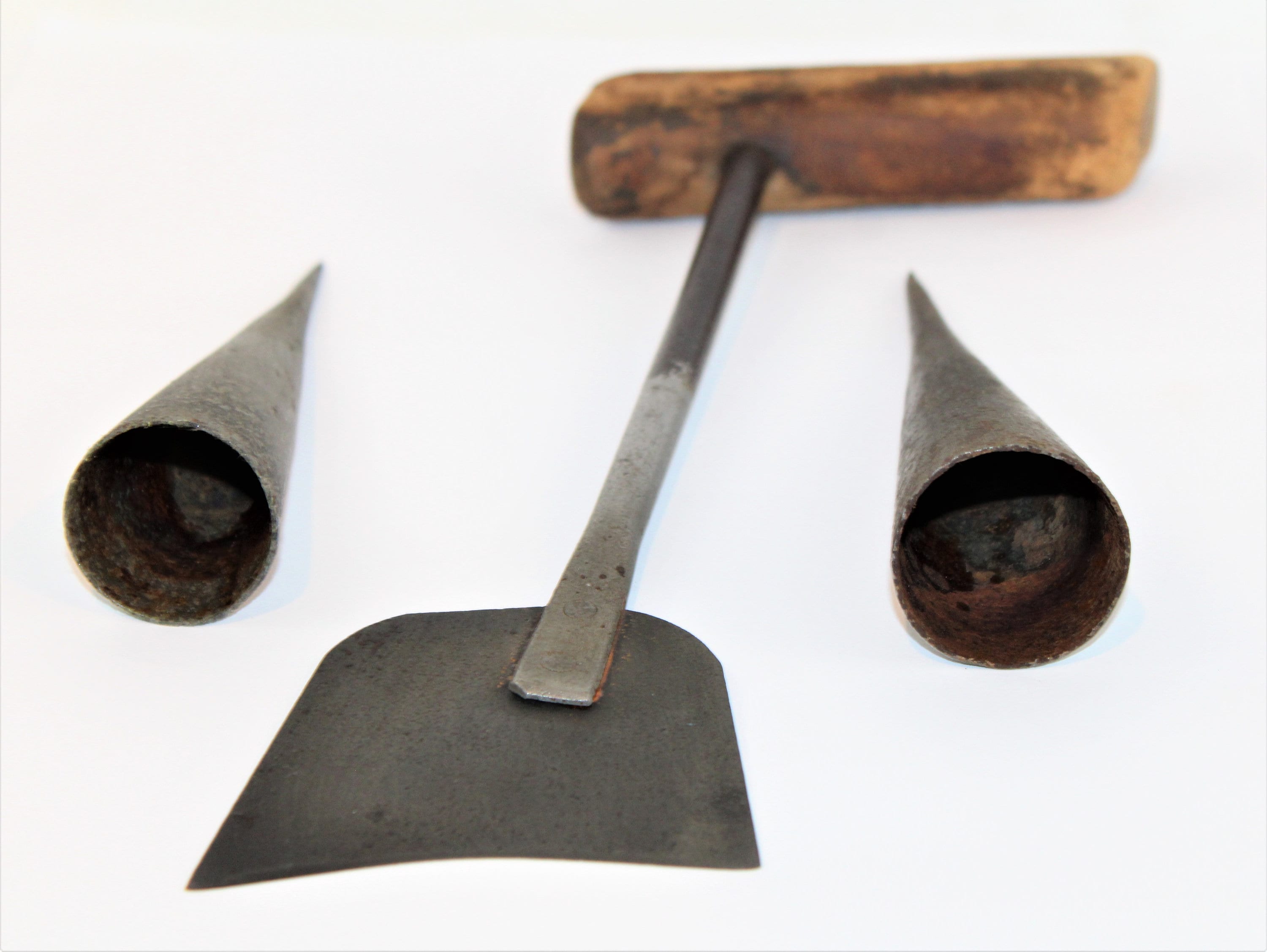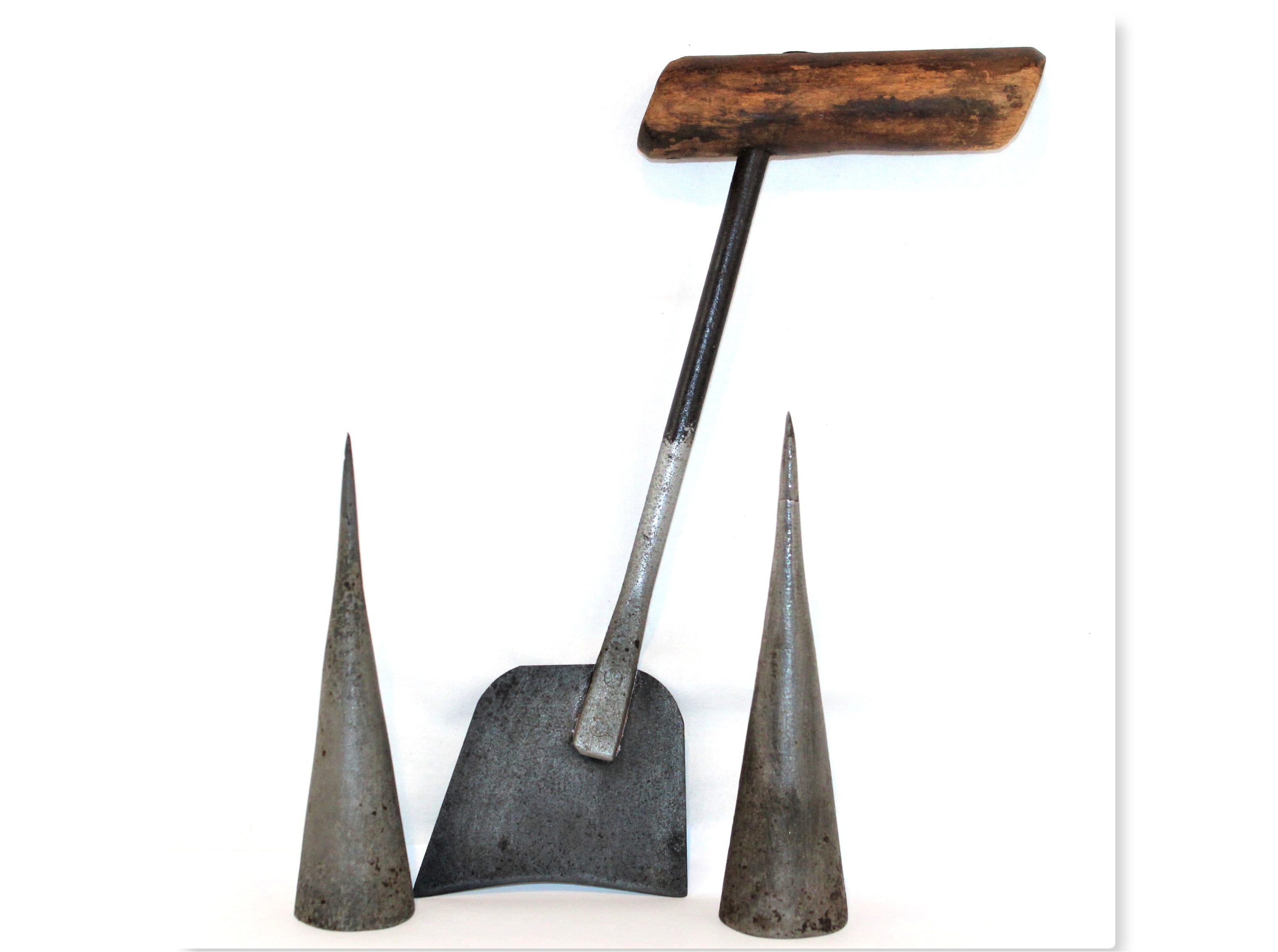 Wonderful 1800s Tobacco Harvesting Knife and two Sticking Spears. These were used to cut down the tobacco plants during harvesting, and the metal spike would have been placed on top of tobacco stalk hanging stick to ease in sticking the plants for drying in the tobacco barns. The cutting knife and spears are extremely sharp.