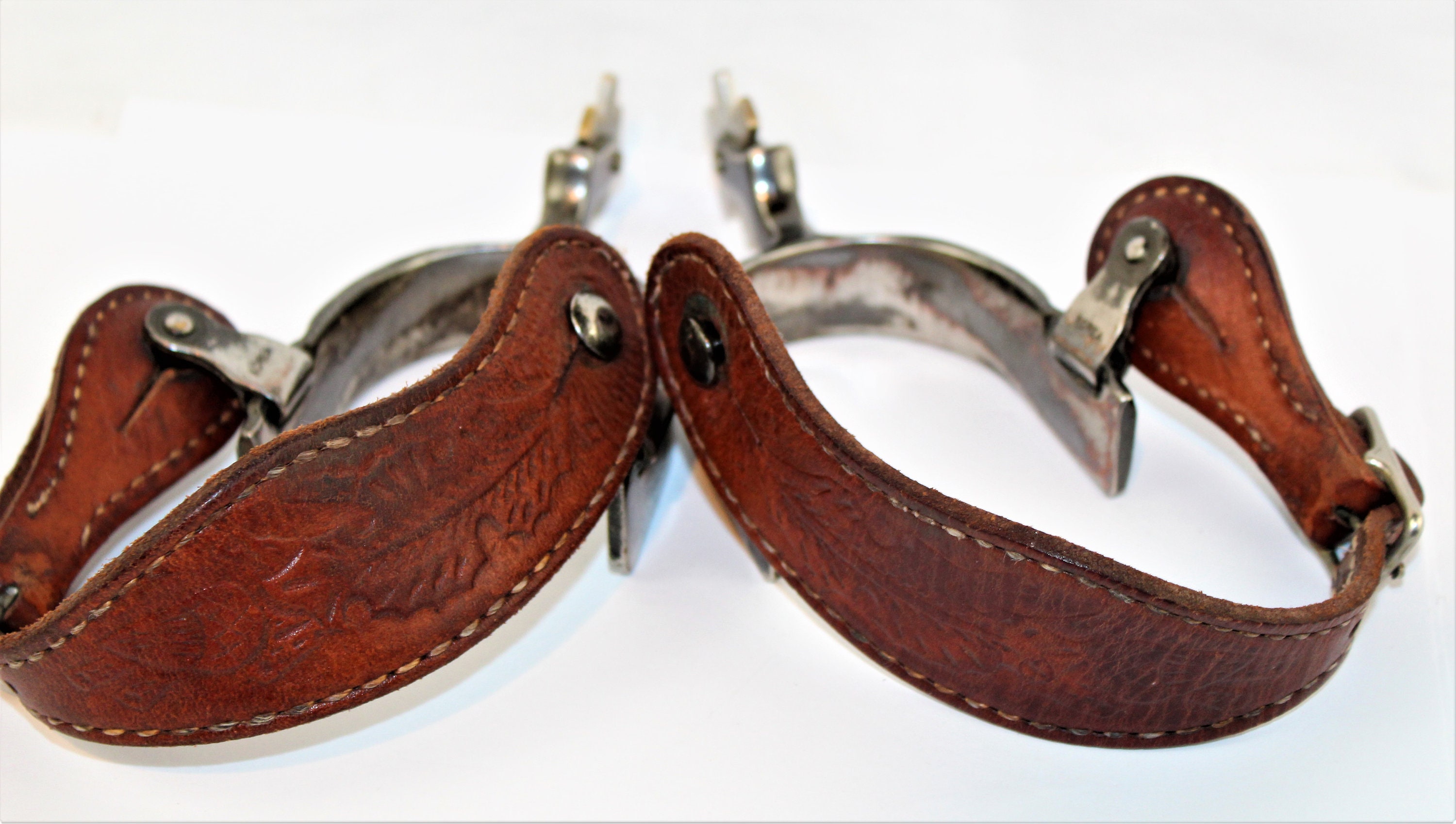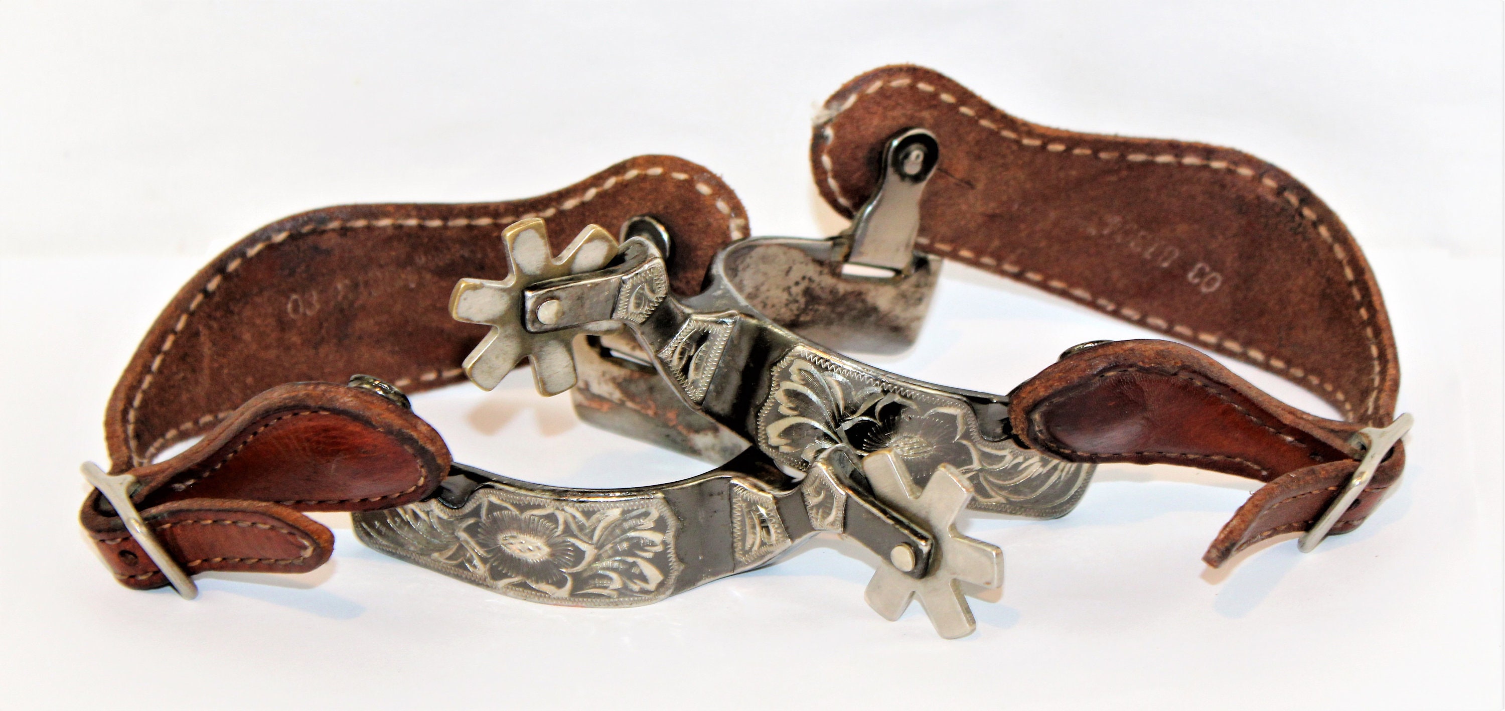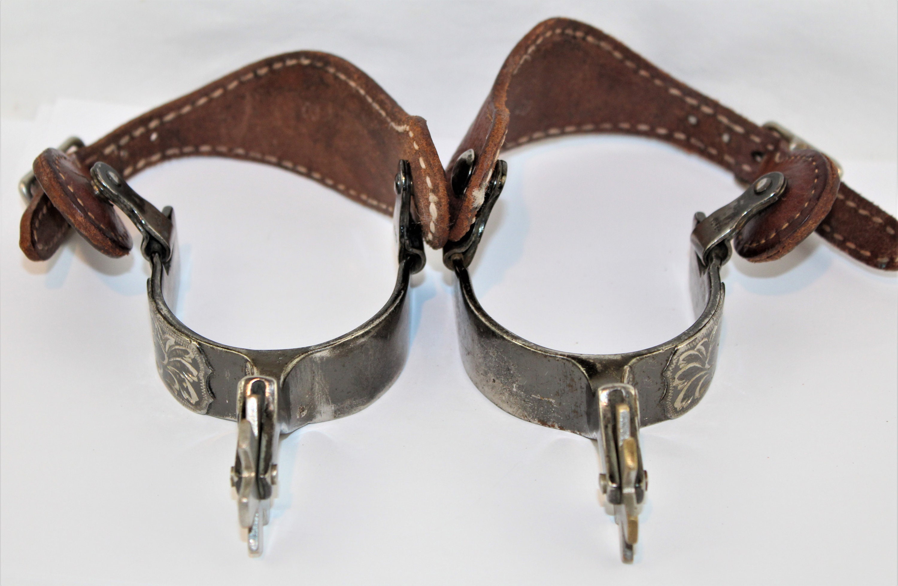 These are made of chrome plated steel with a decorative silver overlay on the outer band and shank. The shank has a built-in chap guard and carries a 1½ inch, 6-point chrome plated brass rowel. They have a 2” shank and the heal band / yoke has about a 2½” spread. The tooled leather straps are in very nice condition with a oak leaf pattern with silver buckles.