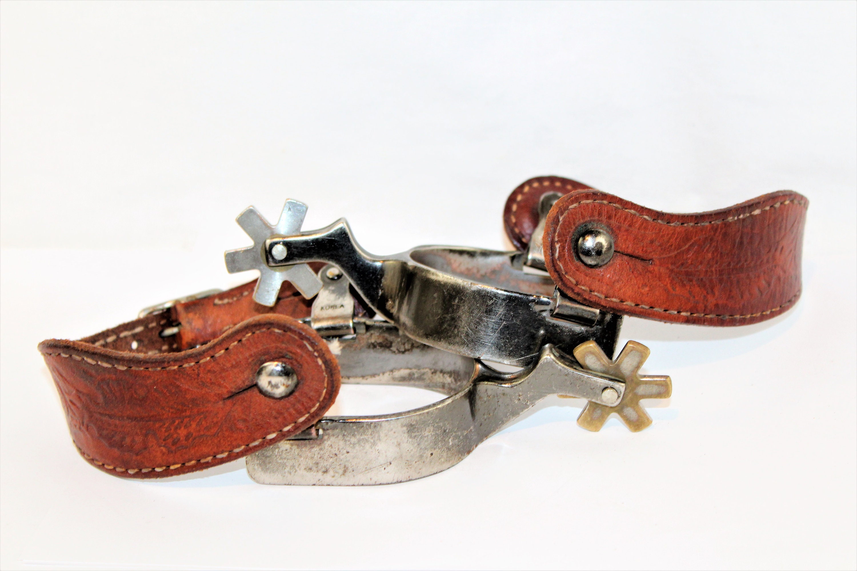 Wonderful western spurs with brown leather straps made in Korea. Before you stop reading, vintage Korean spurs are very well made and never thought to be inexpensive or cheap back in the day, they had to compete with the great American spur manufacturers in the 1950s and 60s, once you pick them up you realize the quality.
