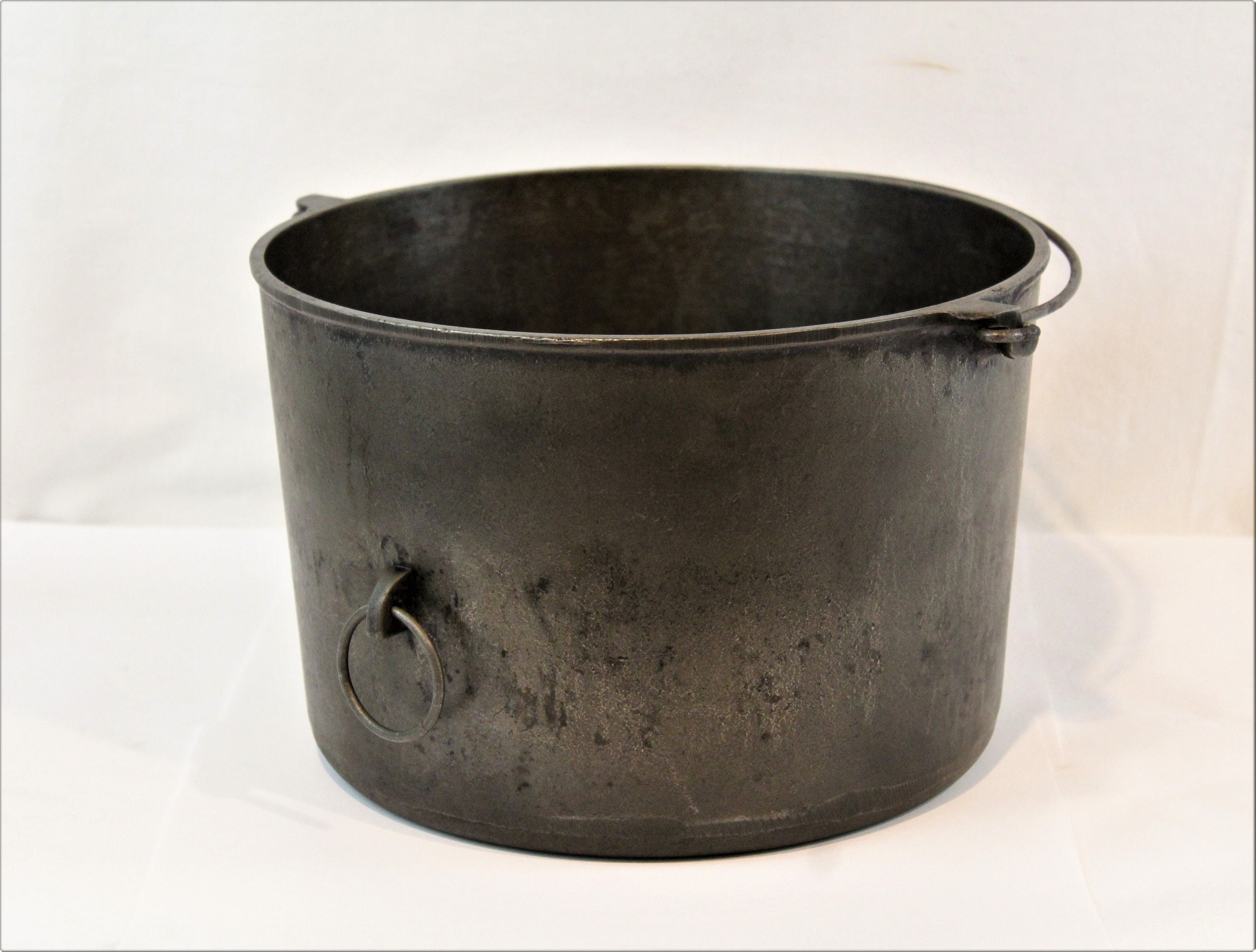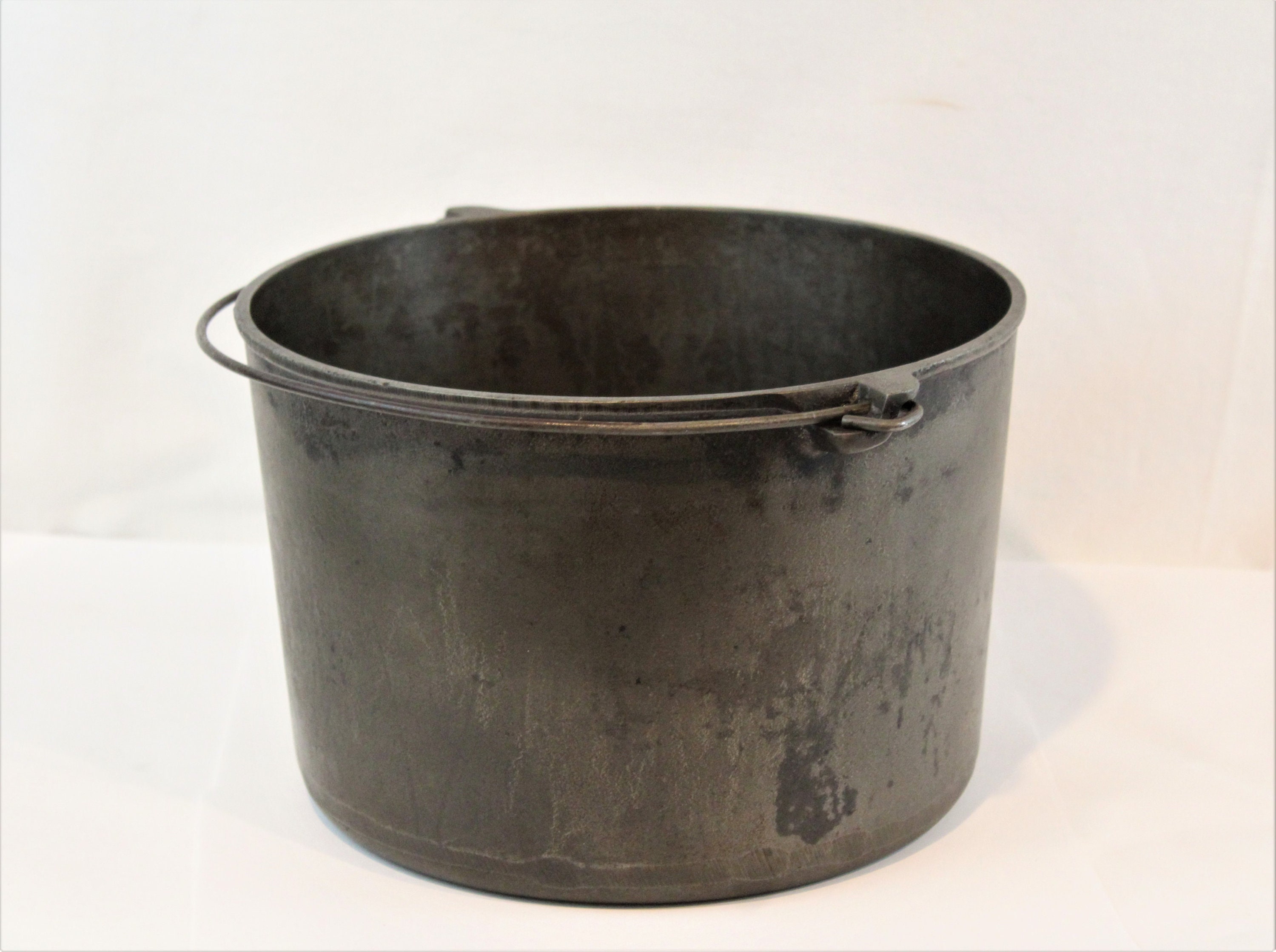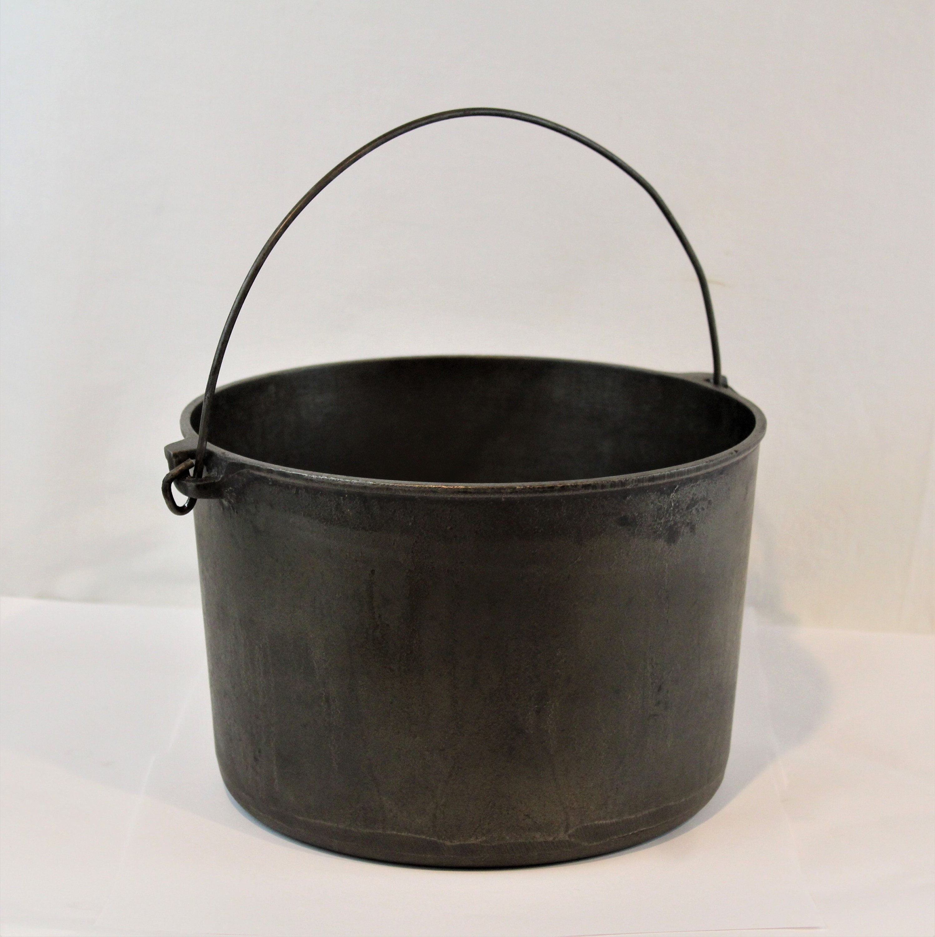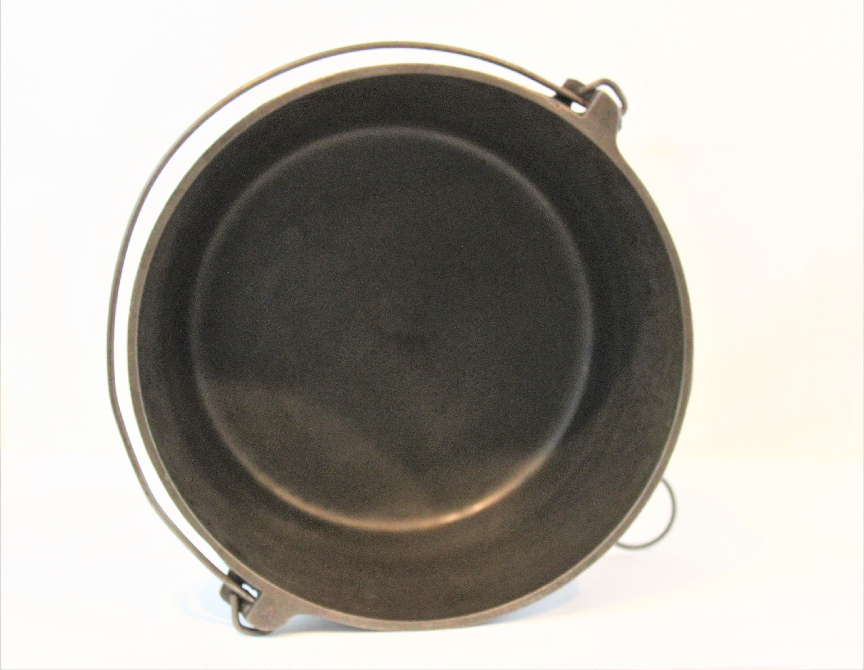 The Kettle has been cleaned and seasoned, ready to be used or displayed. The upper wire handle is designed to fold in only one direction, Kettle also has a ring side tipping handle, Kettle is in wonderful, no cracks or chips.