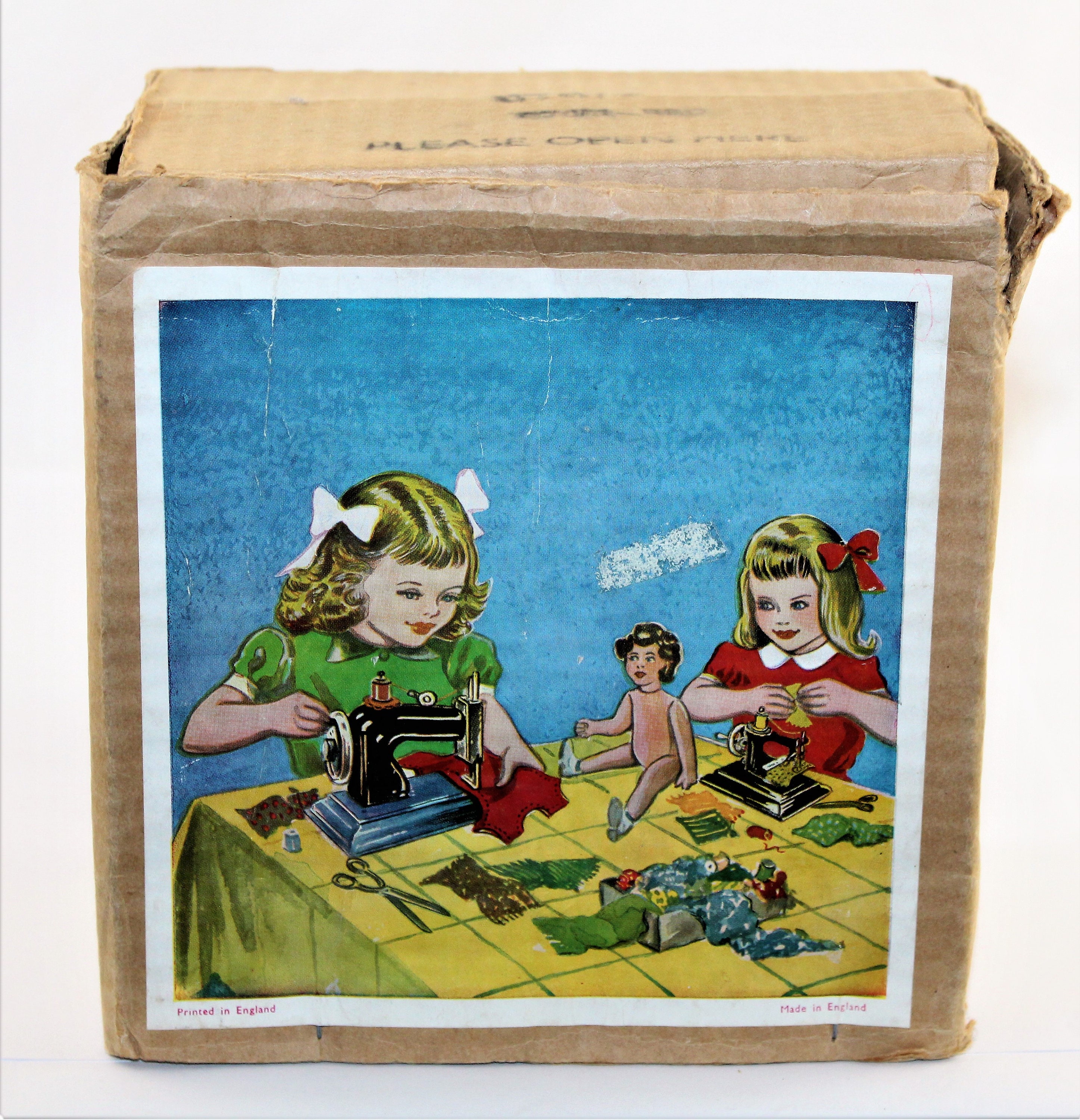 It was manufactured after WW2 and made between 1948-1950 they came in a variety of colors with the most collectable being red, blue and green. This machine comes in its original cardboard box, instructions, one extra needle and wood spool with black thread.