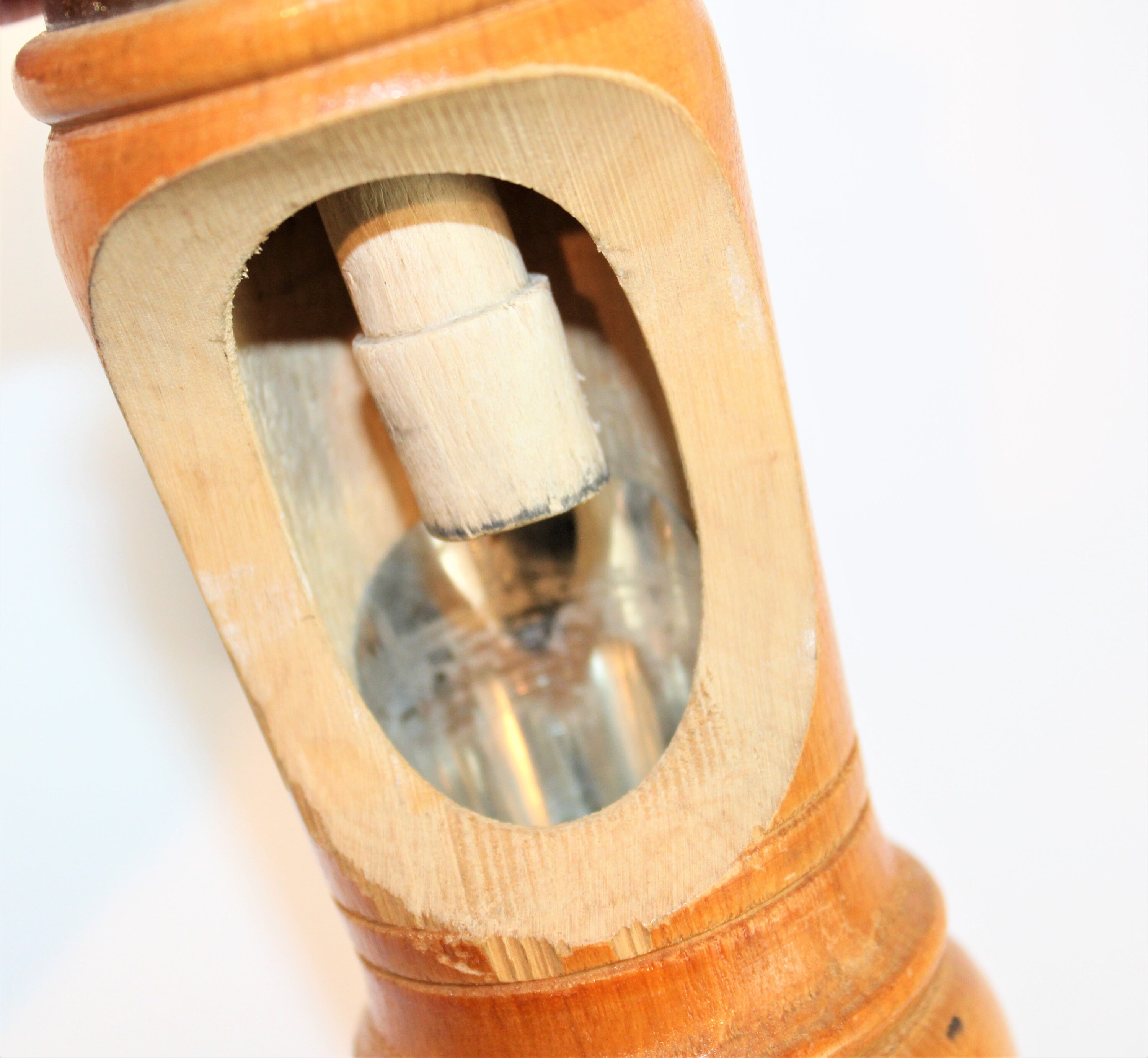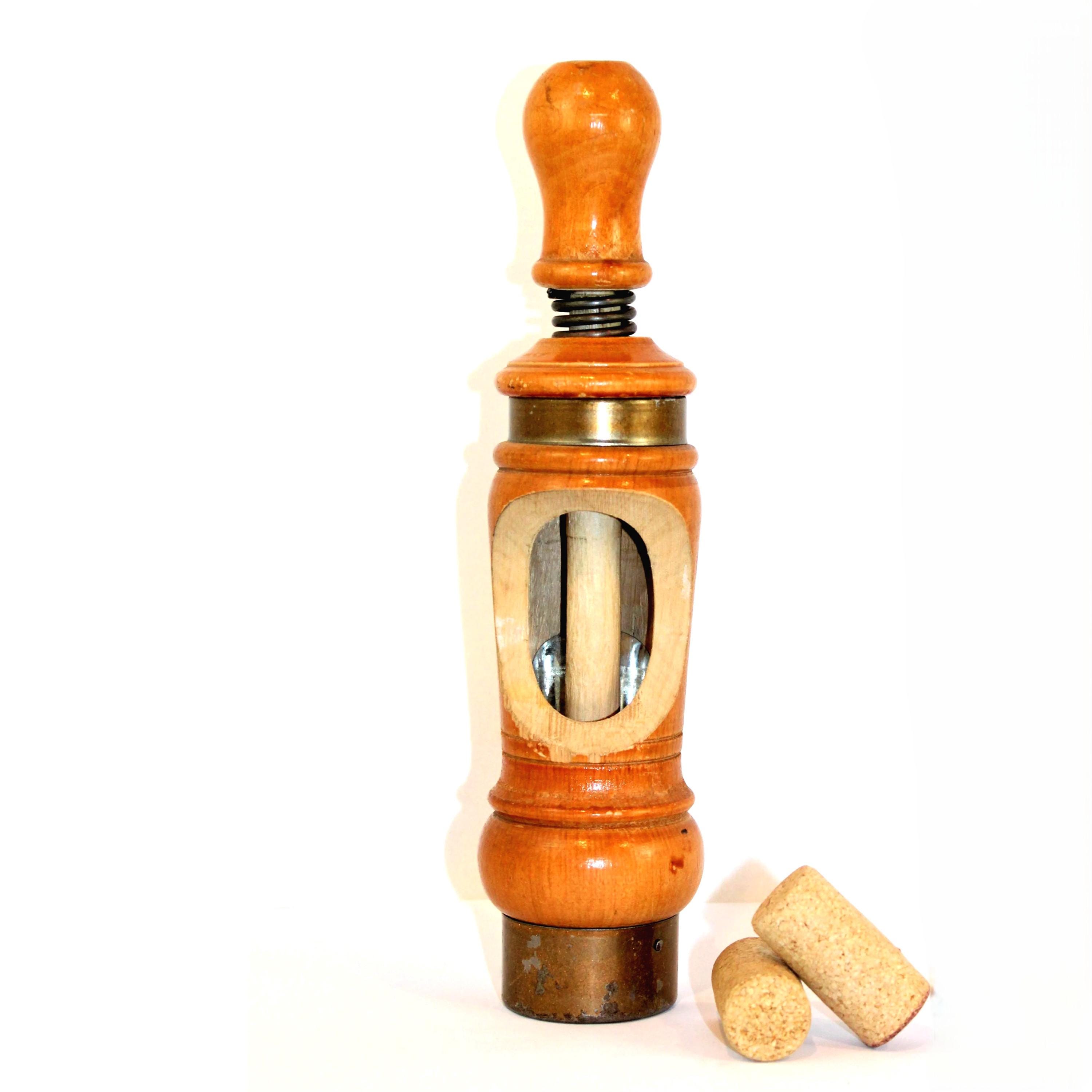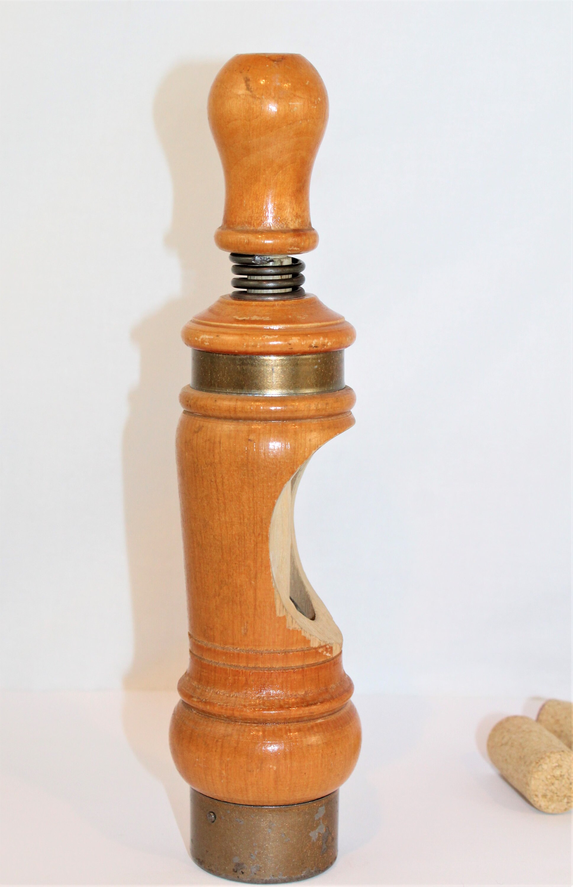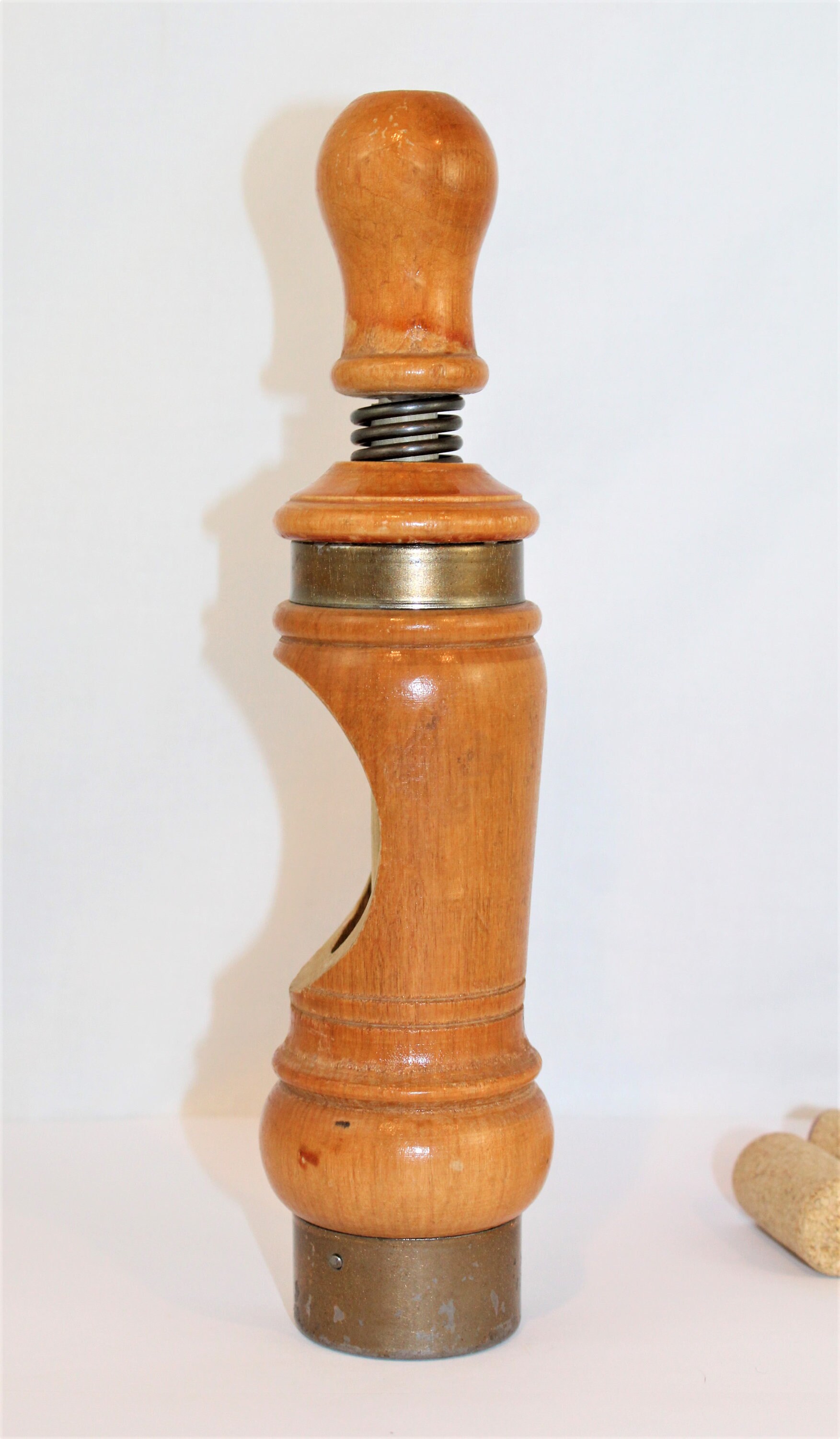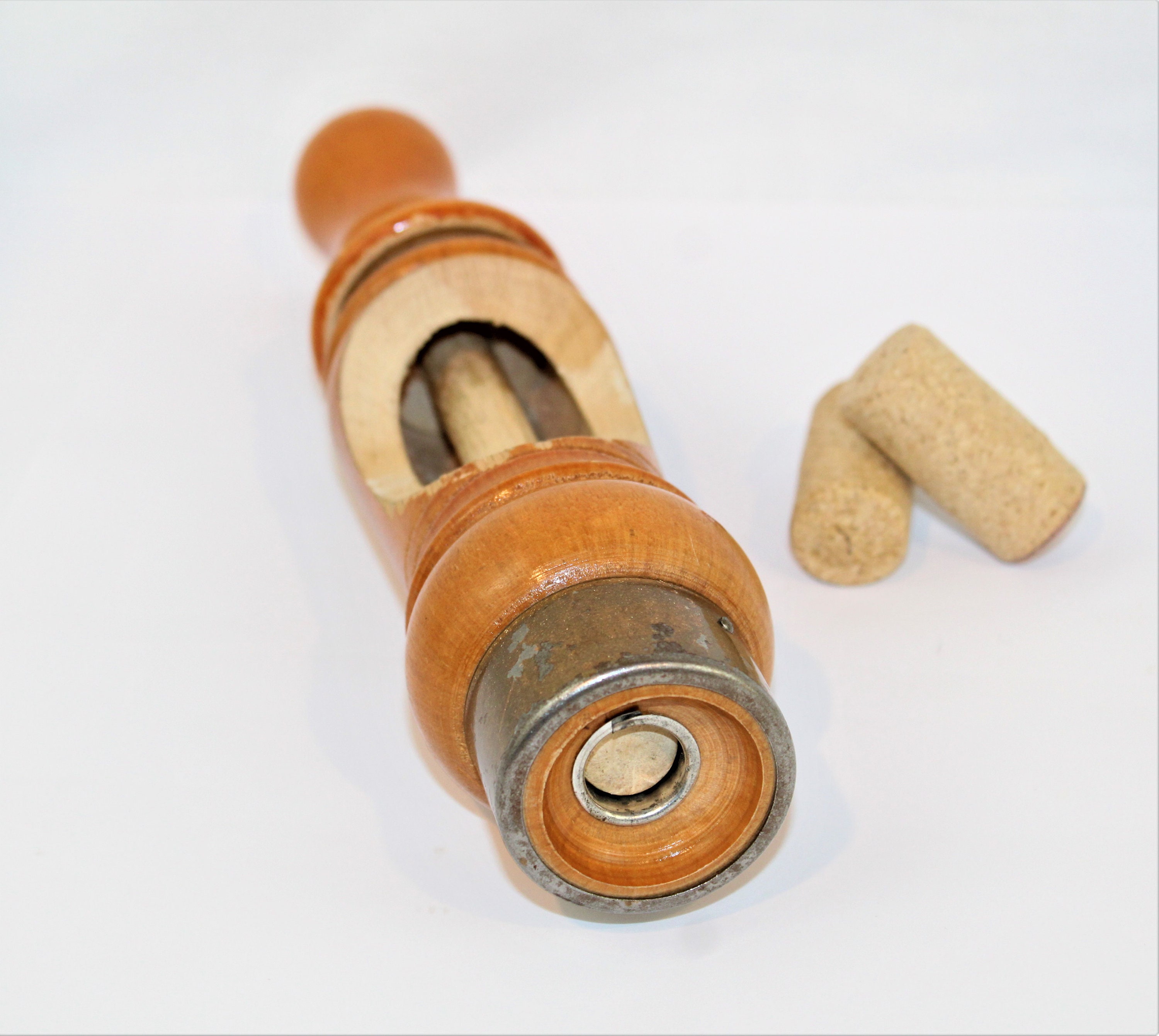 This unusual tool is a cork inserter used to insert corks into bottle, (mainly wine bottles). If you brew and bottle your own wine at home this is a must have time saver. By raising the handle at the top and lifting the plunger you place a new cork into the opening and set the corker atop a bottle and press the cork into the bottle.
