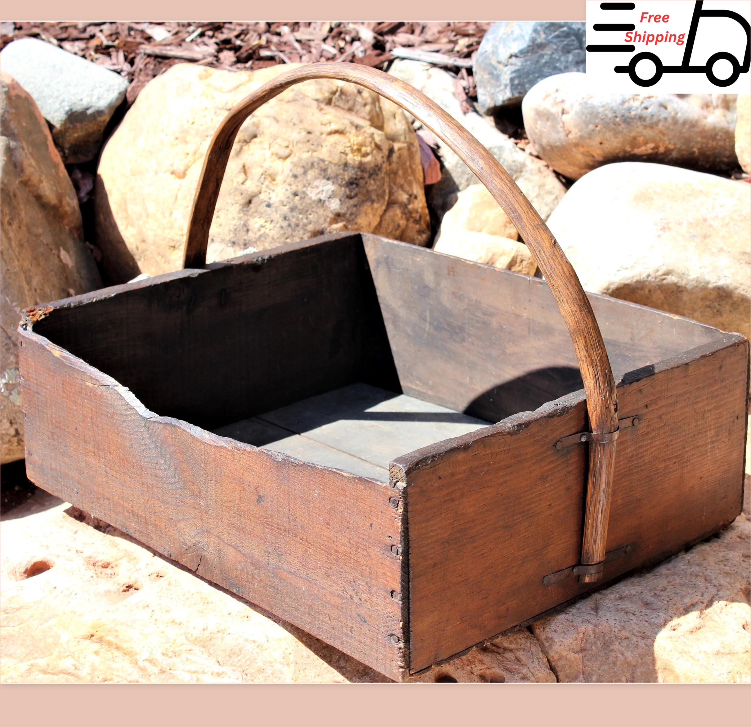 Wonderful find this late 1800s wooden gathering basket, made of solid wood with bend wood handle. Handle is from one piece of wood, bent and held in place with two metal straps at each end attached with nails.