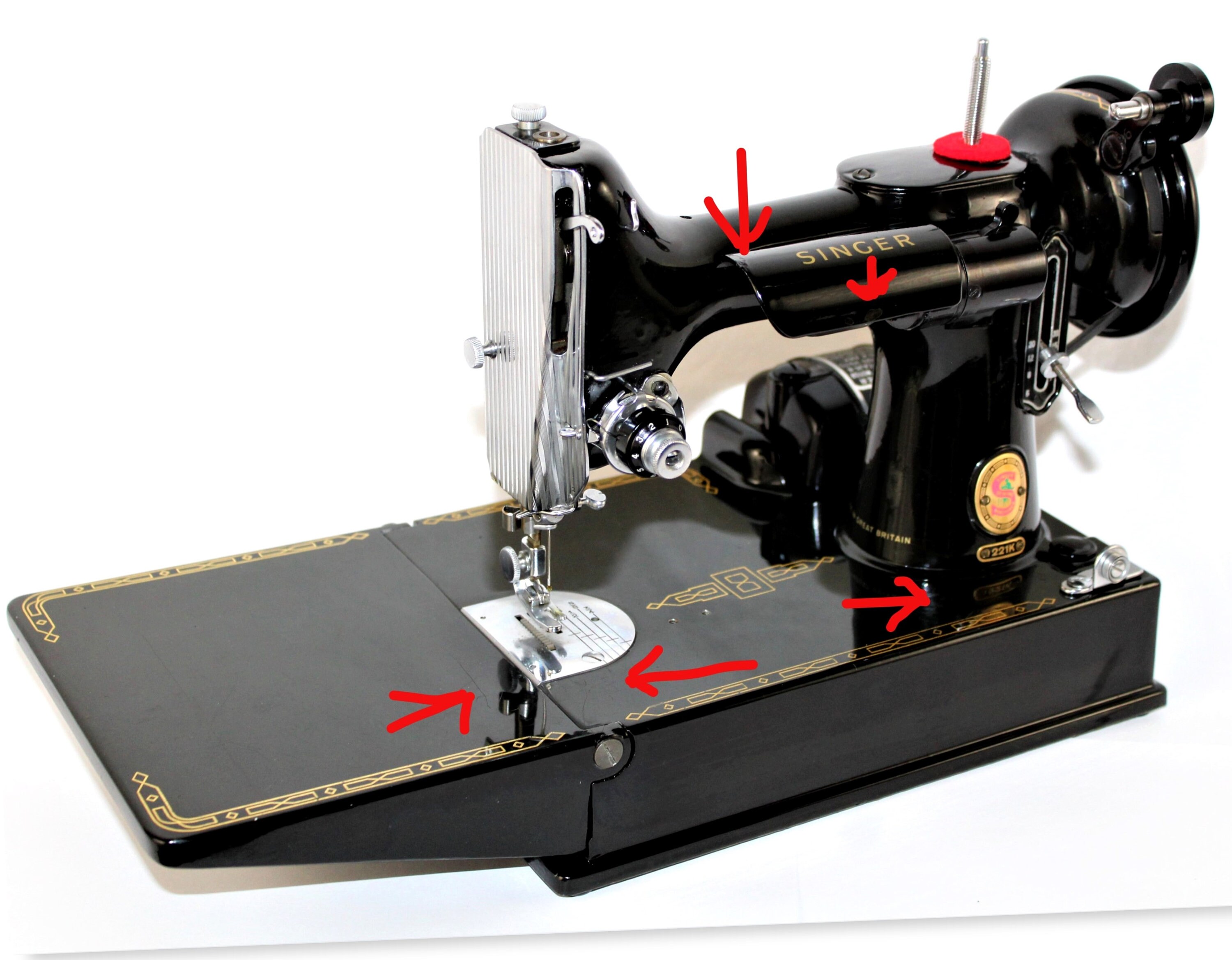 MACHINE, runs and operates smoothly, does show light wear for age, sewing bed shows light scuffs, and scratches, spots (as shown in pictures).