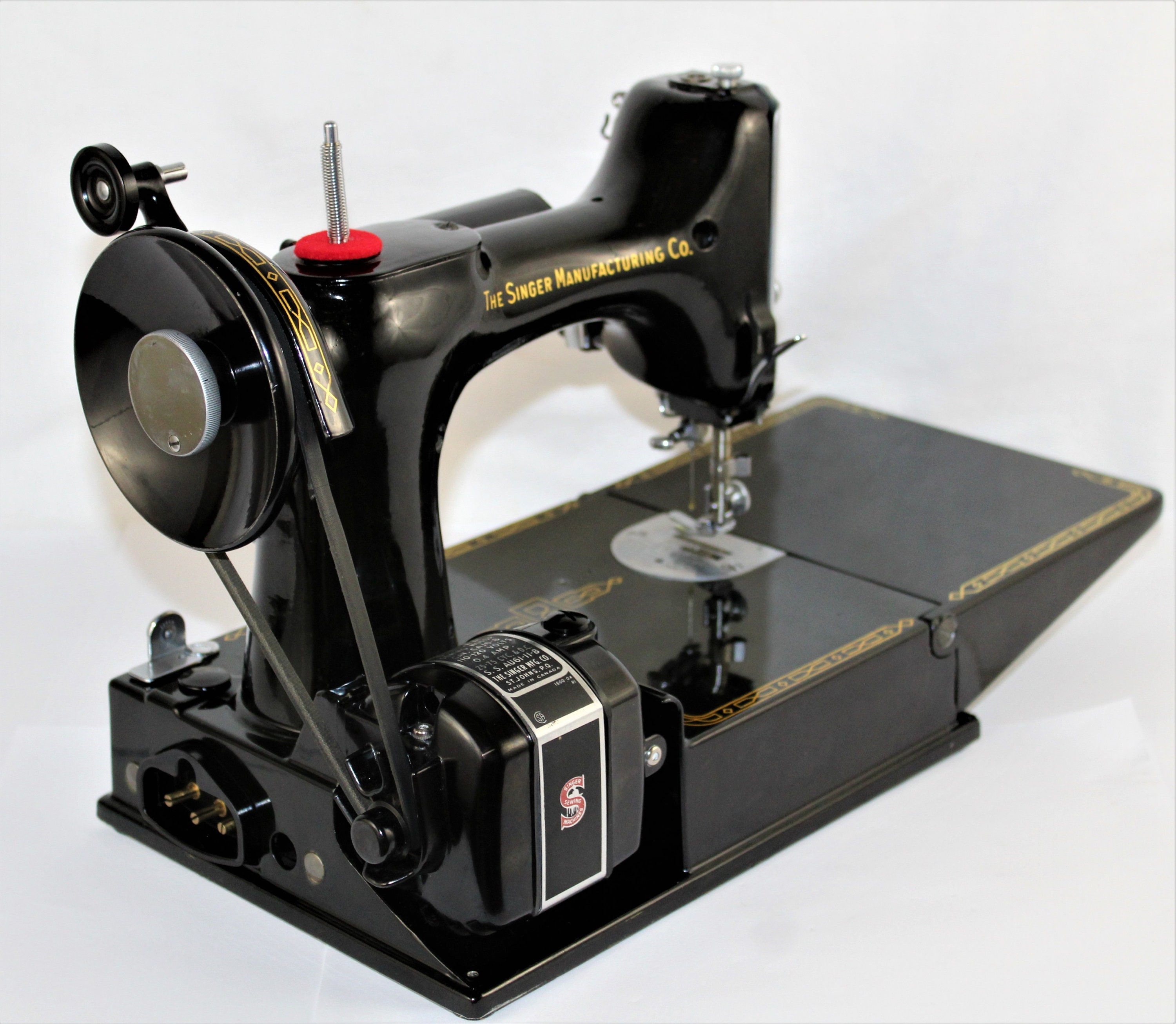 This is a nice machine finished in that classic deep black featherweight paint, gold Art Deco decals and chrome trim. Please see all photos as they are part of the item’s description.