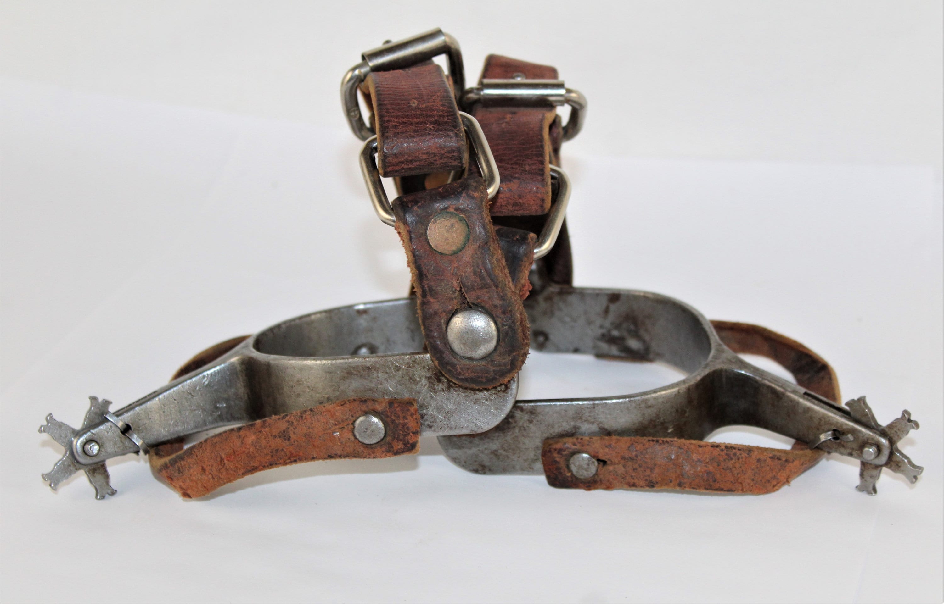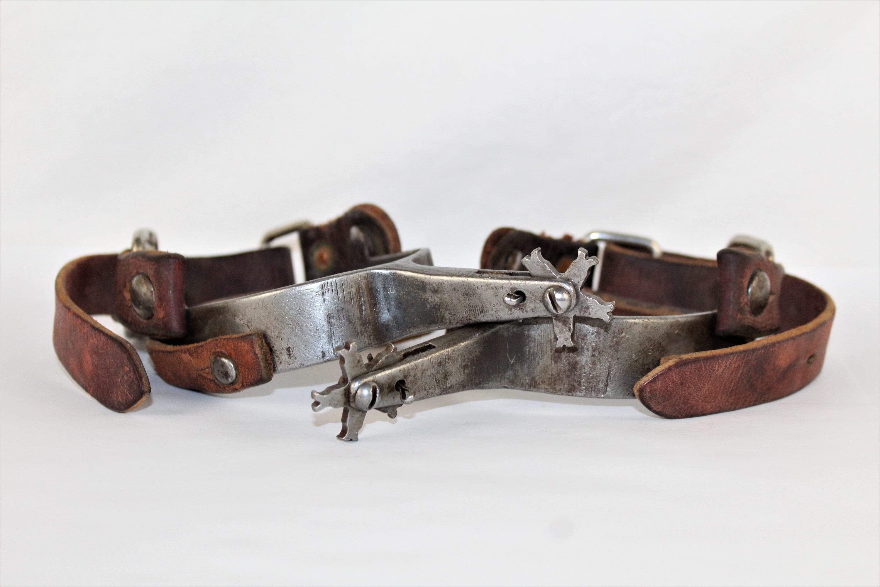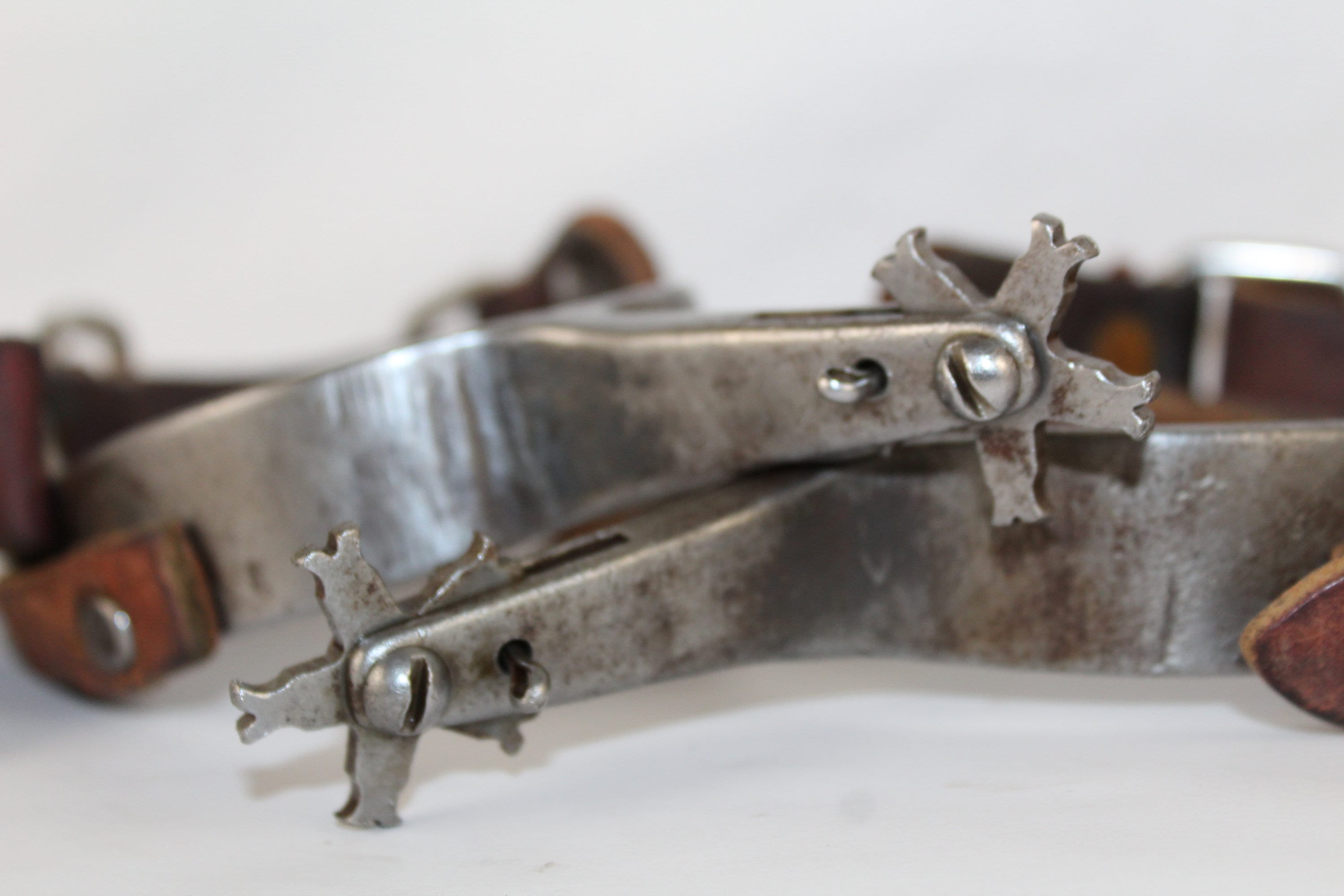 The spurs have a 1¼”- 5-point steel rowel, they have a 2¼” shank and the heal band / yoke has about a 3” spread. The leather straps including heel bands are lightly worn, but in good solid condition.