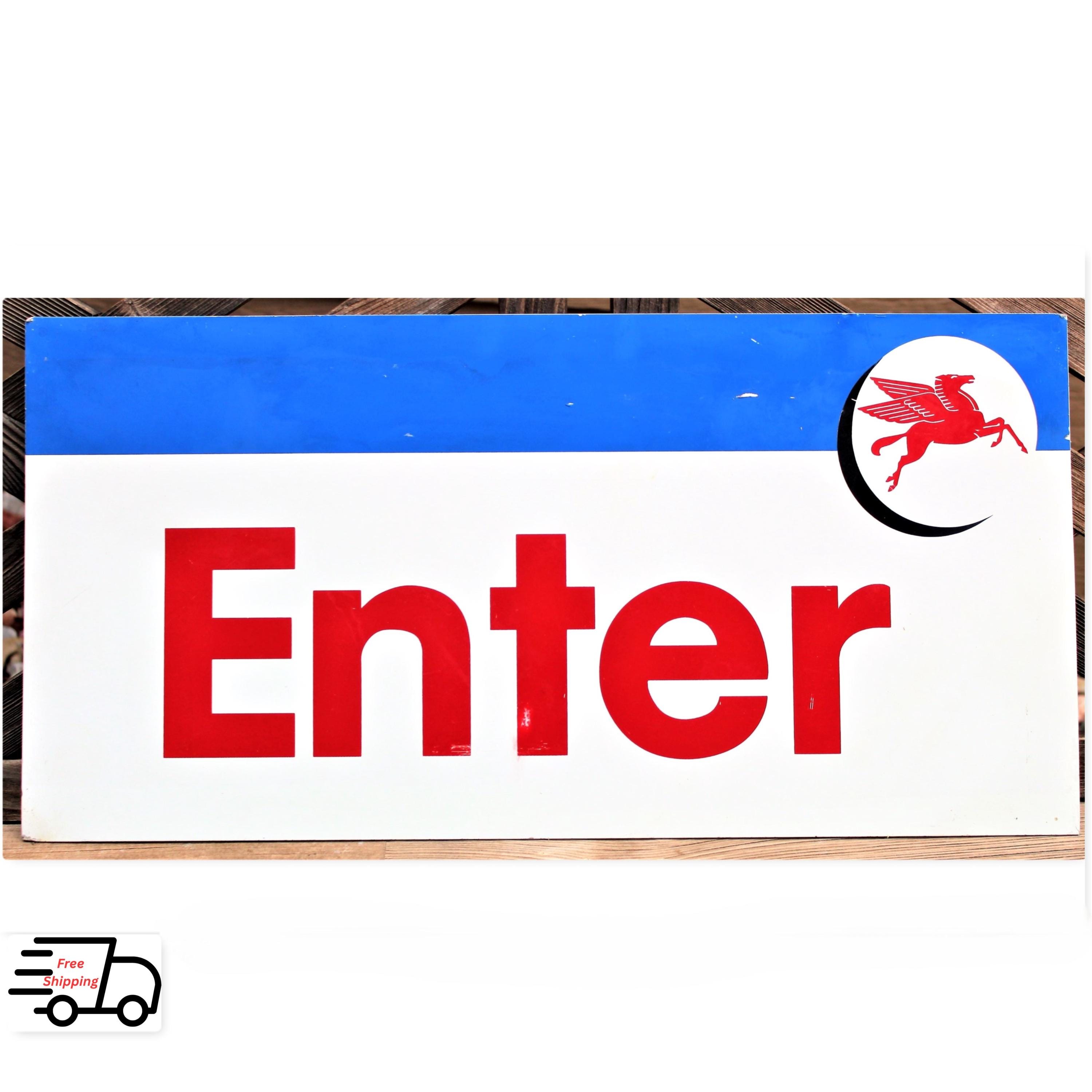 This is an original Mobil Station Entrance Sign with the Mobil Pegasus in the upper corner. The sign is two-sided and on heavy gauge aluminum.