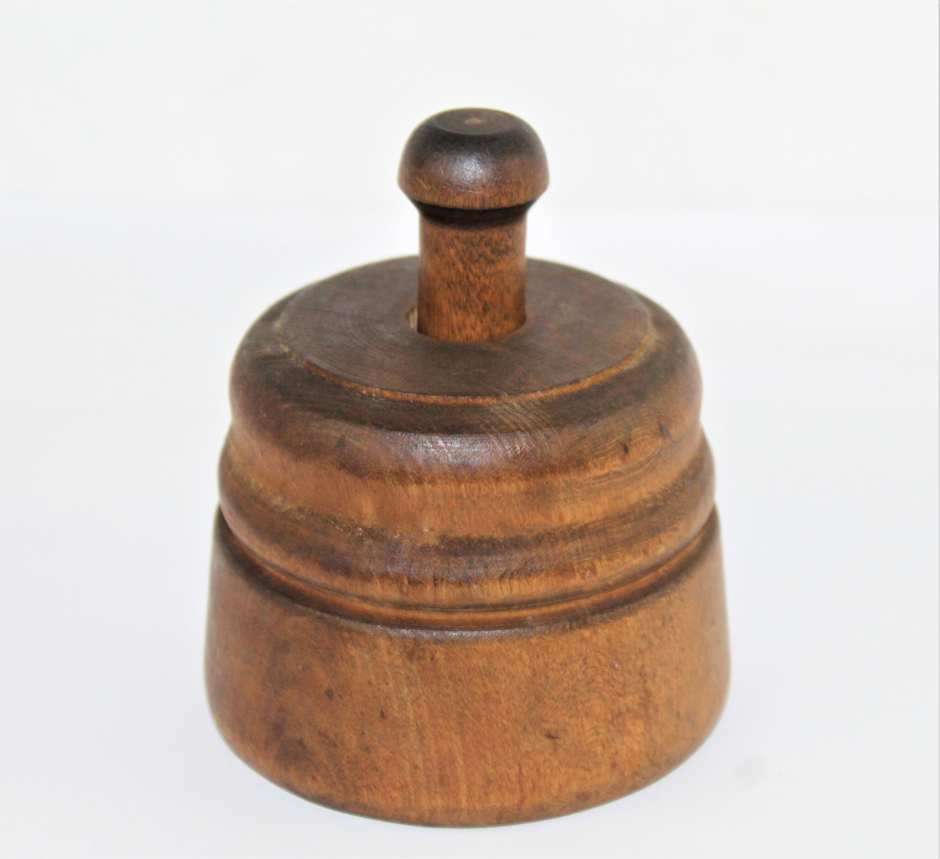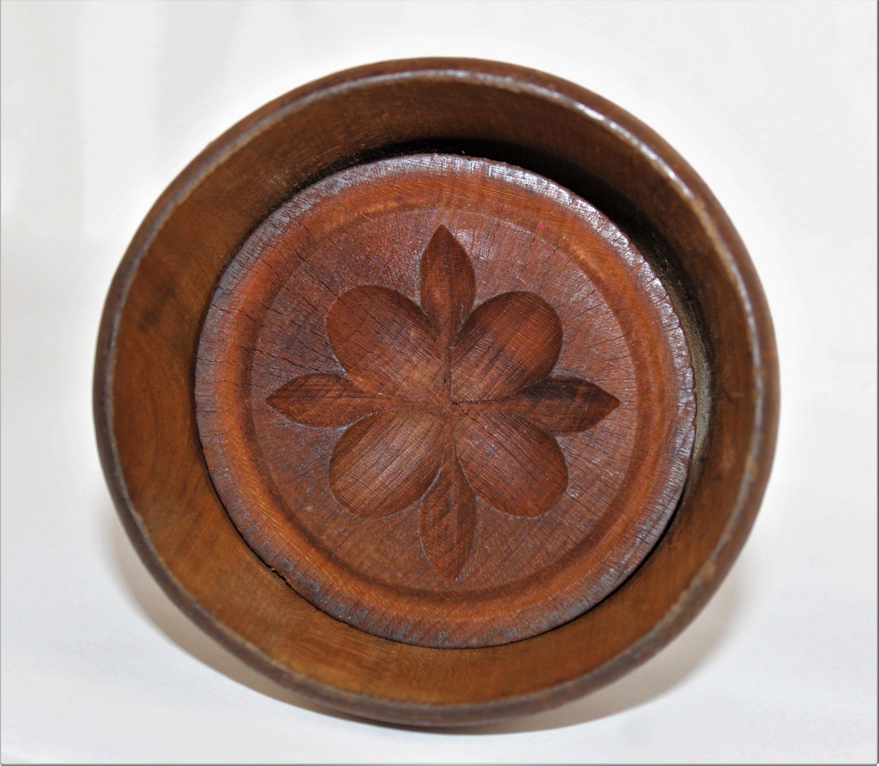 Wonderful Half Pound Butter Press Mold with a flower pattern design. This was a very decorative way to dress up your table in the after churning the butter you would place approximately one-half pound of butter into the press and push the handle down to reveal the round shaped butter with a design on the top.