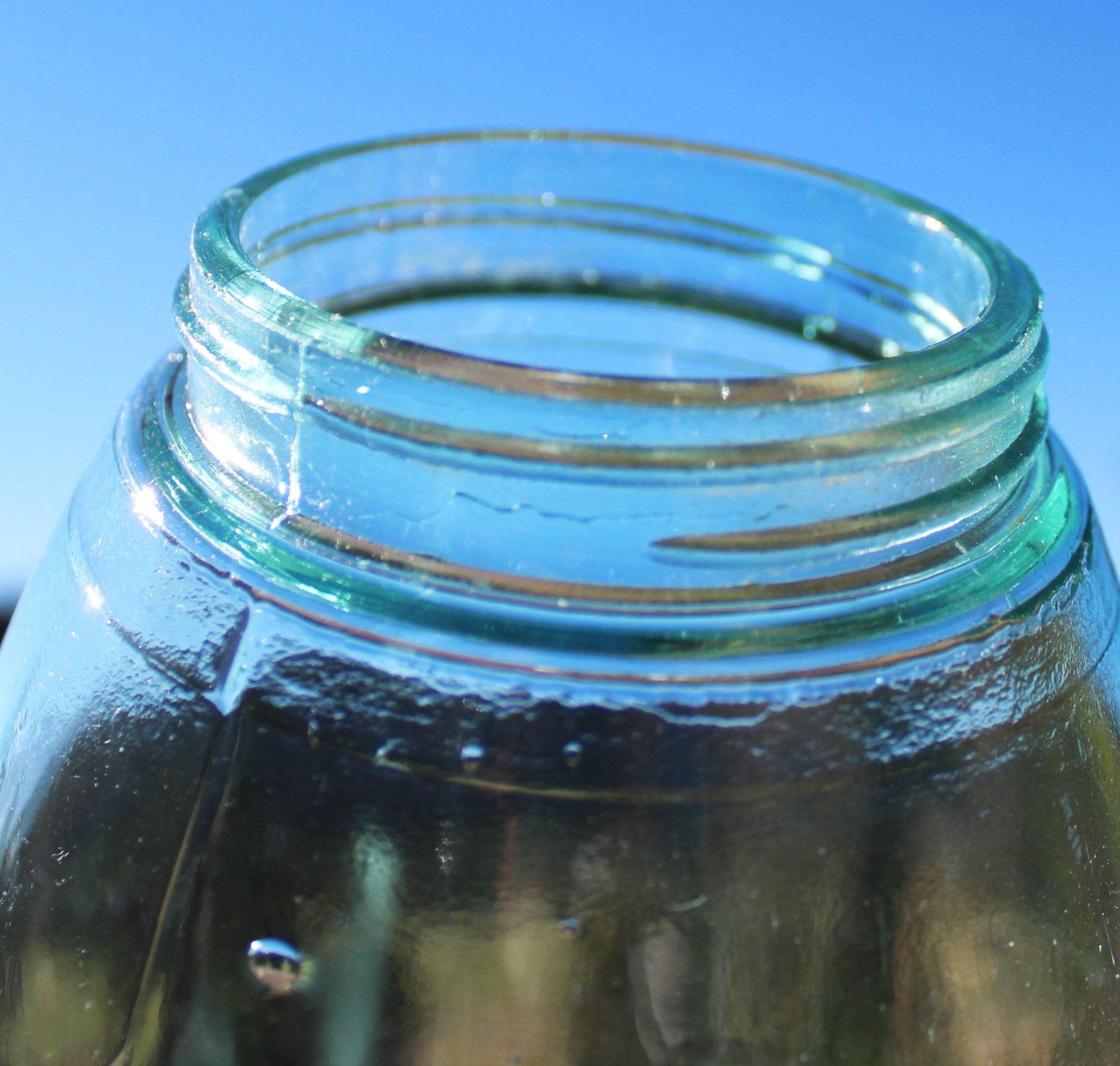 These jars were molded using a two-piece manufacturing method, the top rim was placed onto the base while it was still molten glass. Also note this a low shoulder jar which also dates it pre-1900. The base on the jar is marked IV (Roman #4).