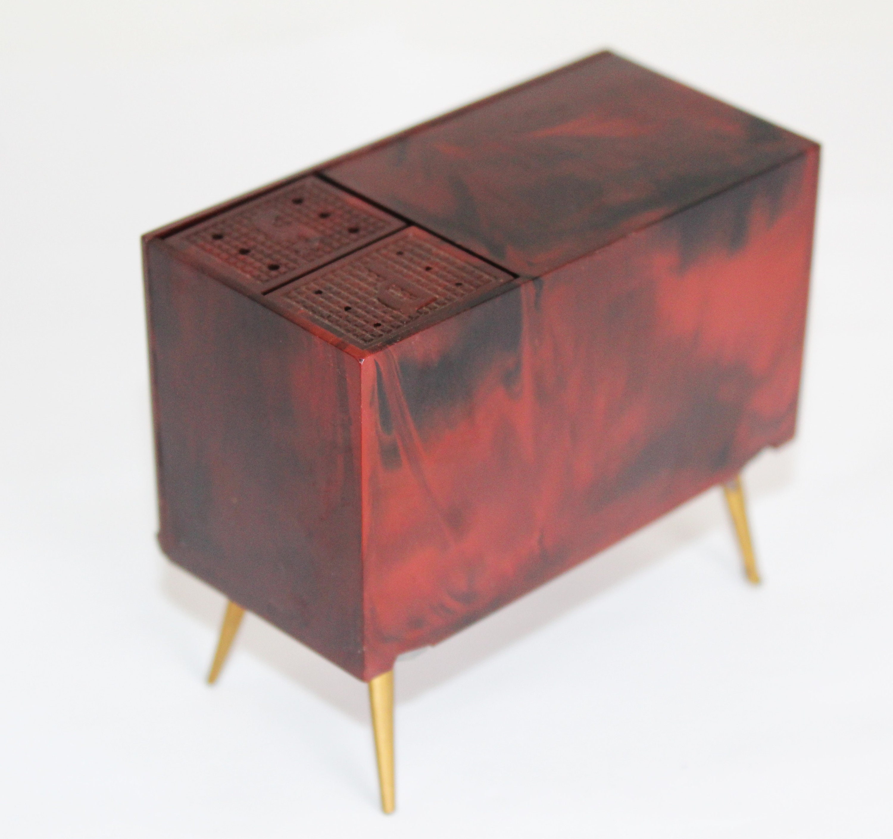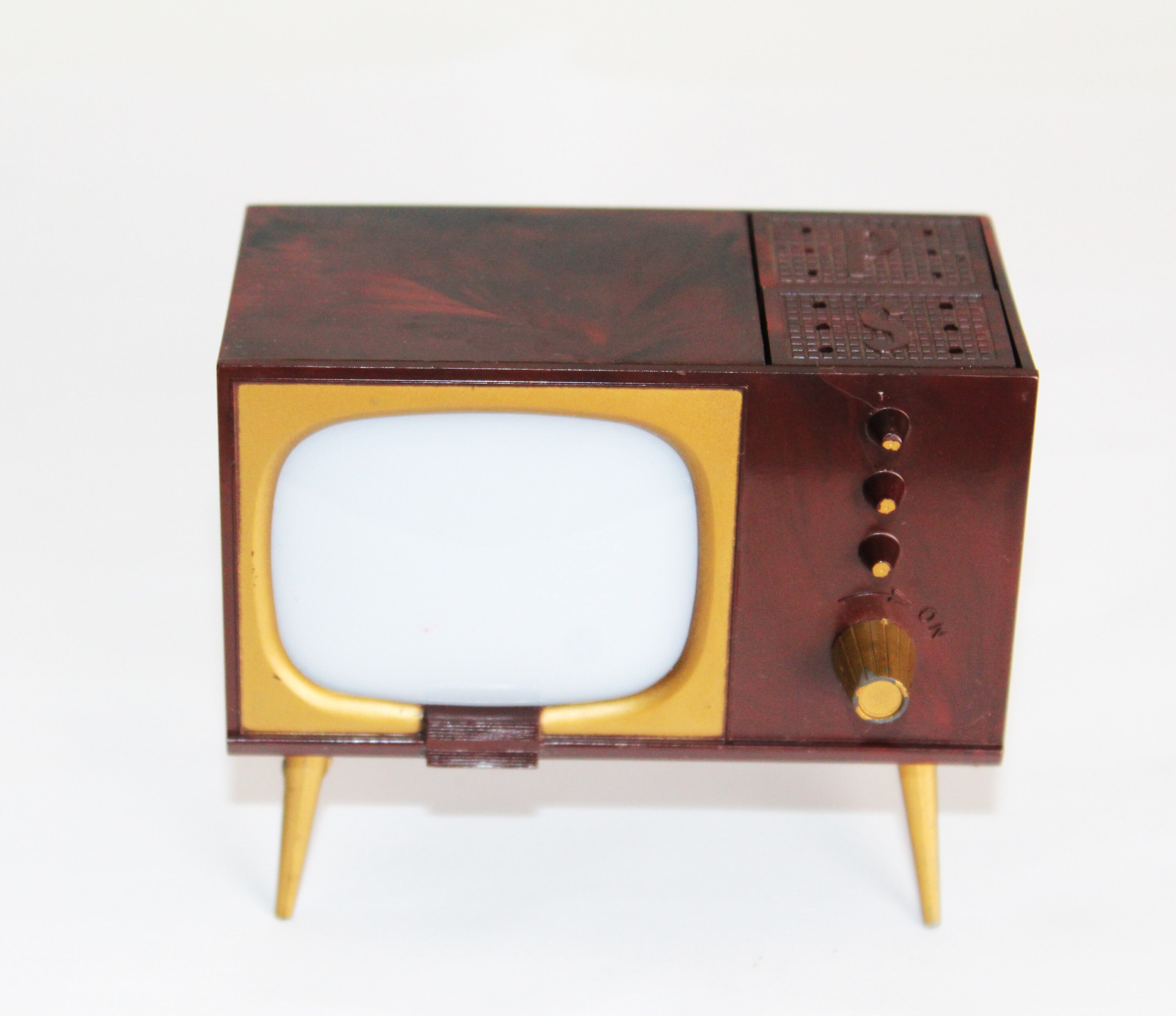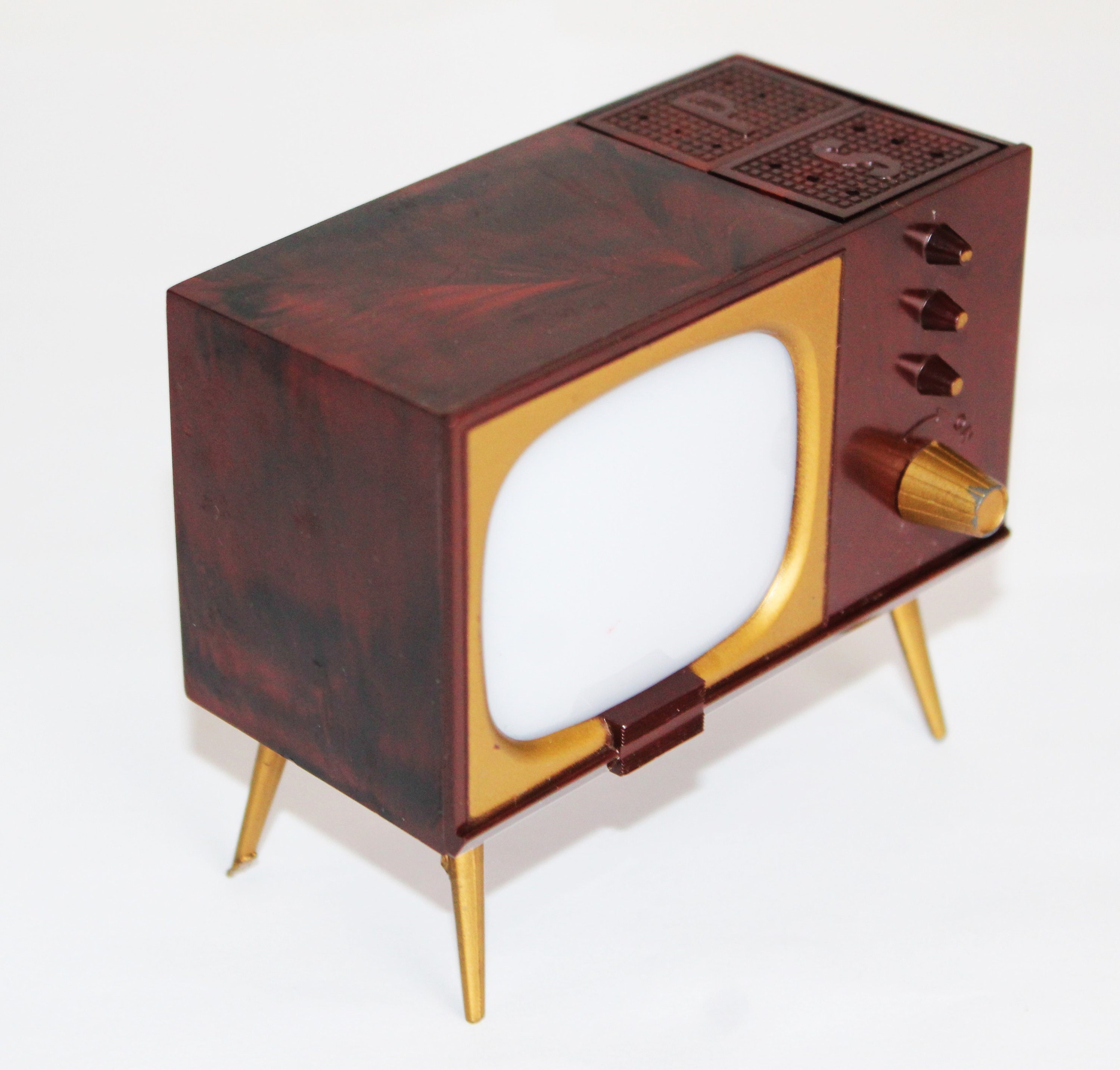 Classic 1950s console TV with pop-up shaker set, turn the larger knob on the front of the television and the salt & pepper shakers will raise up out of the television, the back shaker raises a little higher than the front shaker for easier access.