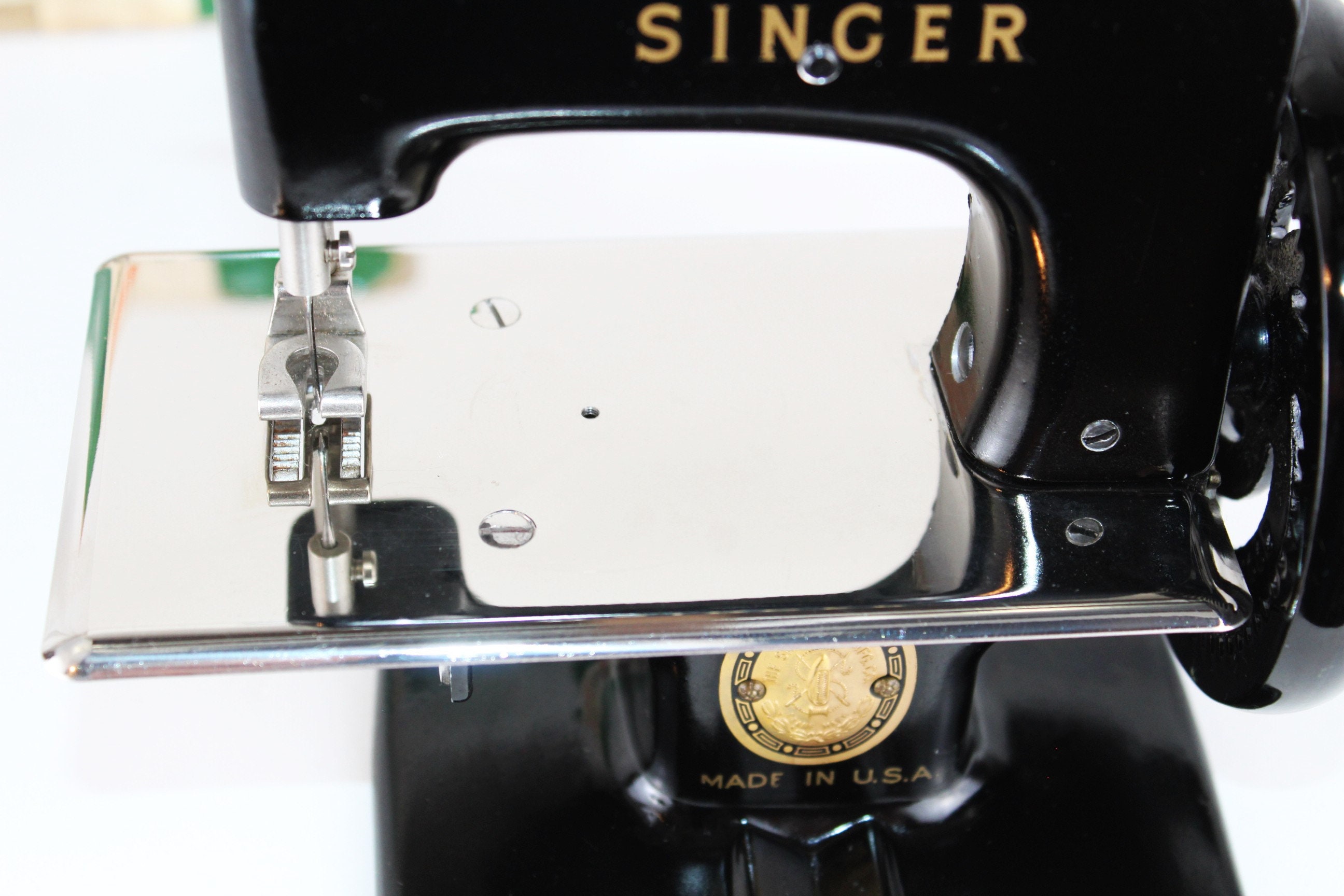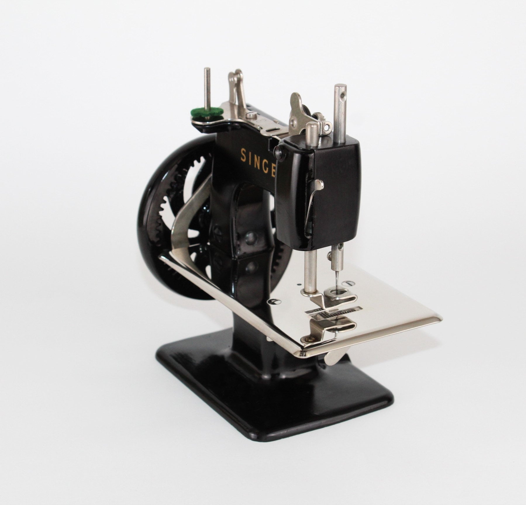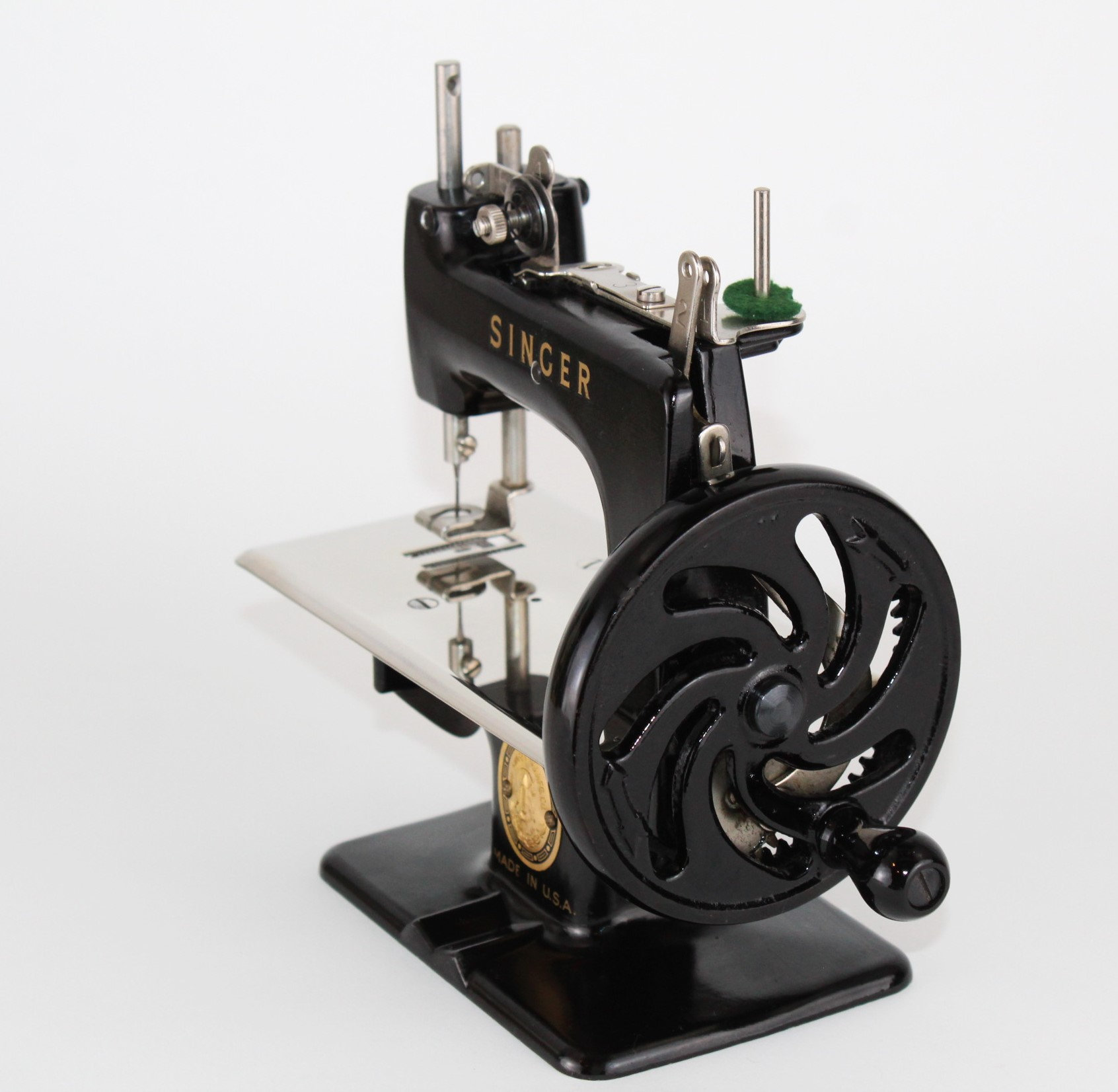 Beautiful little sewing machine made by Singer. This is a fully Functional Hand Crank Sewing Machine in toy size. Originally patented in 1910 and manufactured until 1975, these were known as the most popular toy sewing machines ever made. This is the 1950s model which has a thicker base column although it still uses the same mechanics as its predecessor of 1910.
