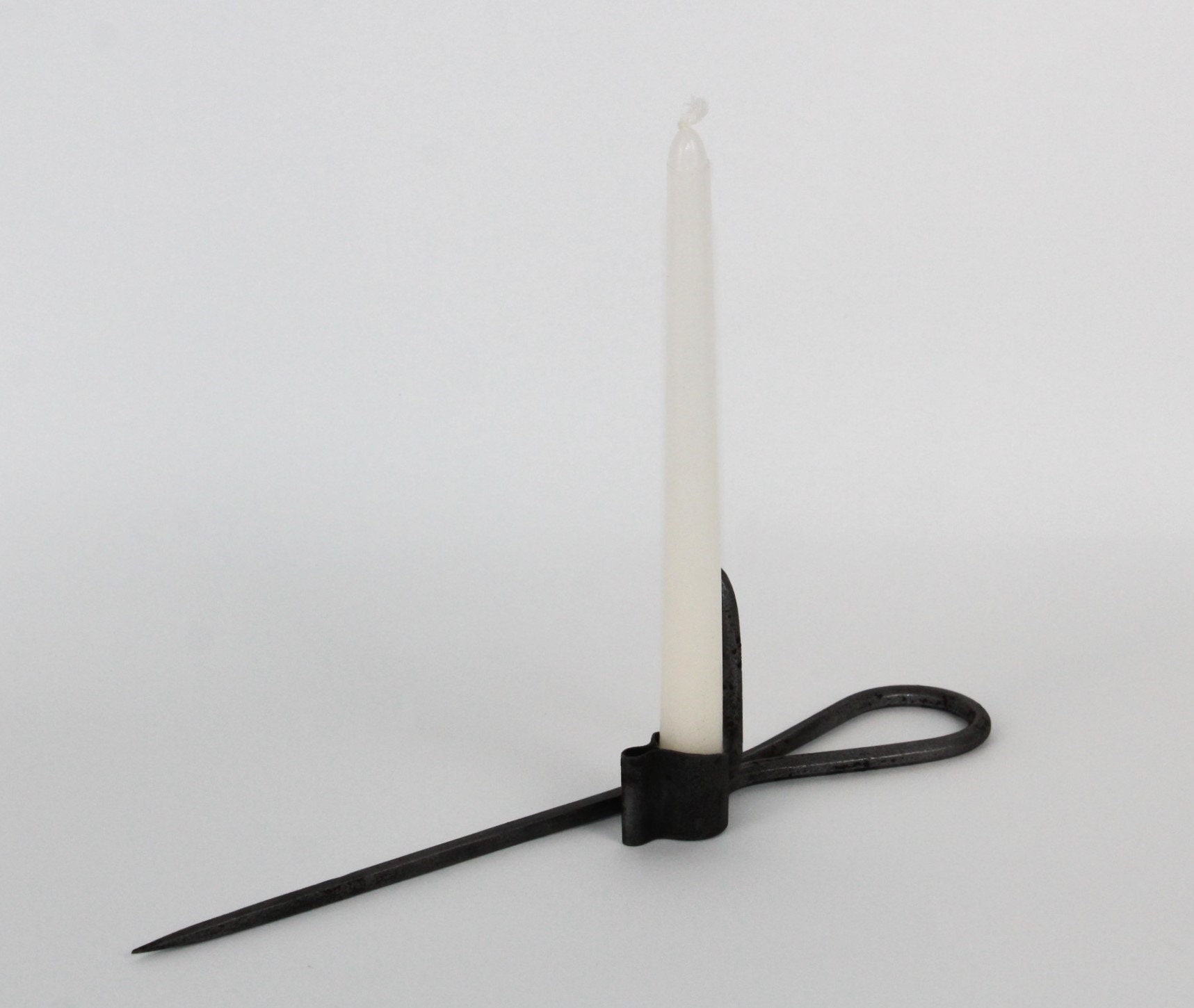 This is an original piece from the 1800s It is designed with a molded area for a candle stick to be placed and held securely with the tension of the spring metal, the spike is square wrought Iron formed into a very sharp spike.