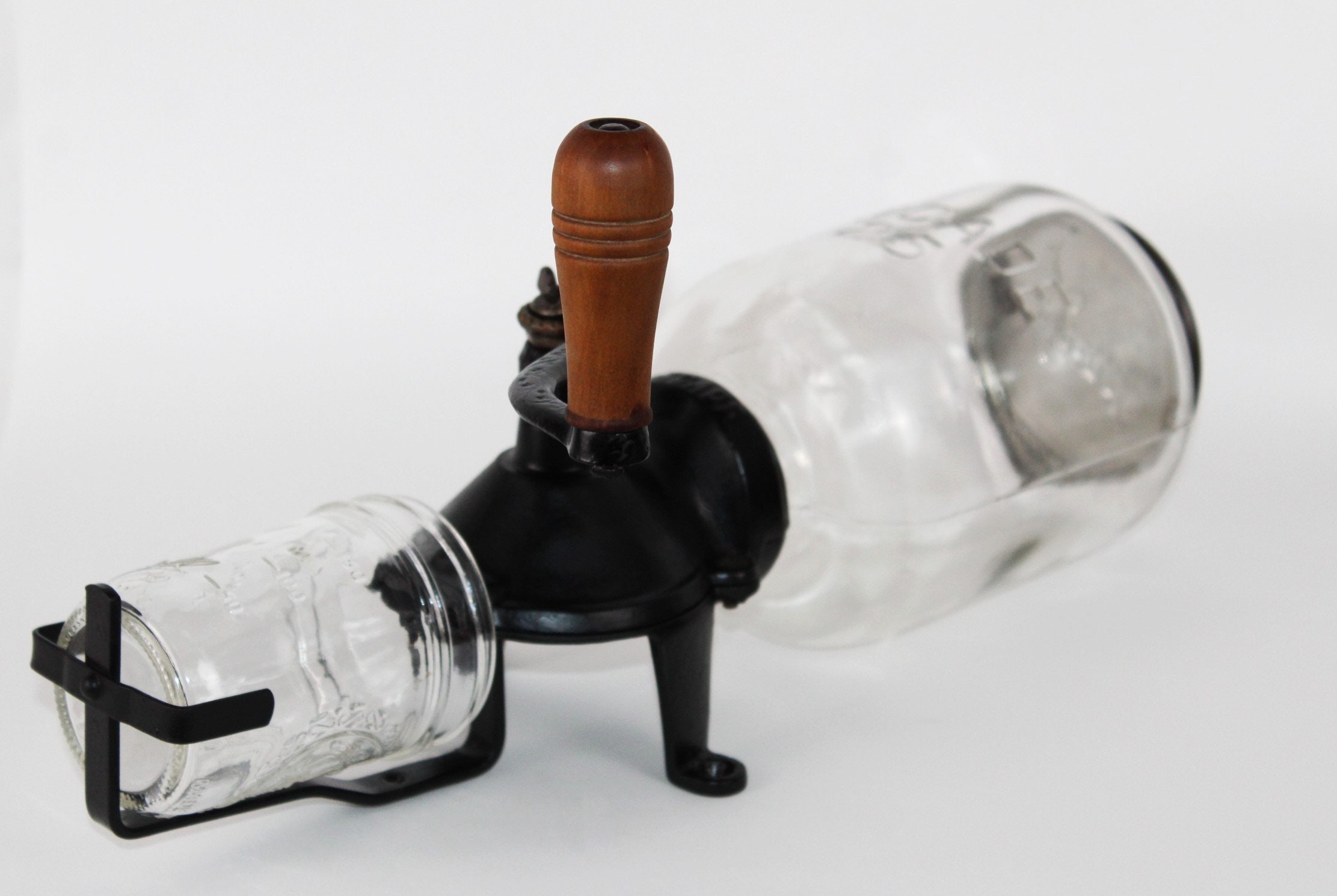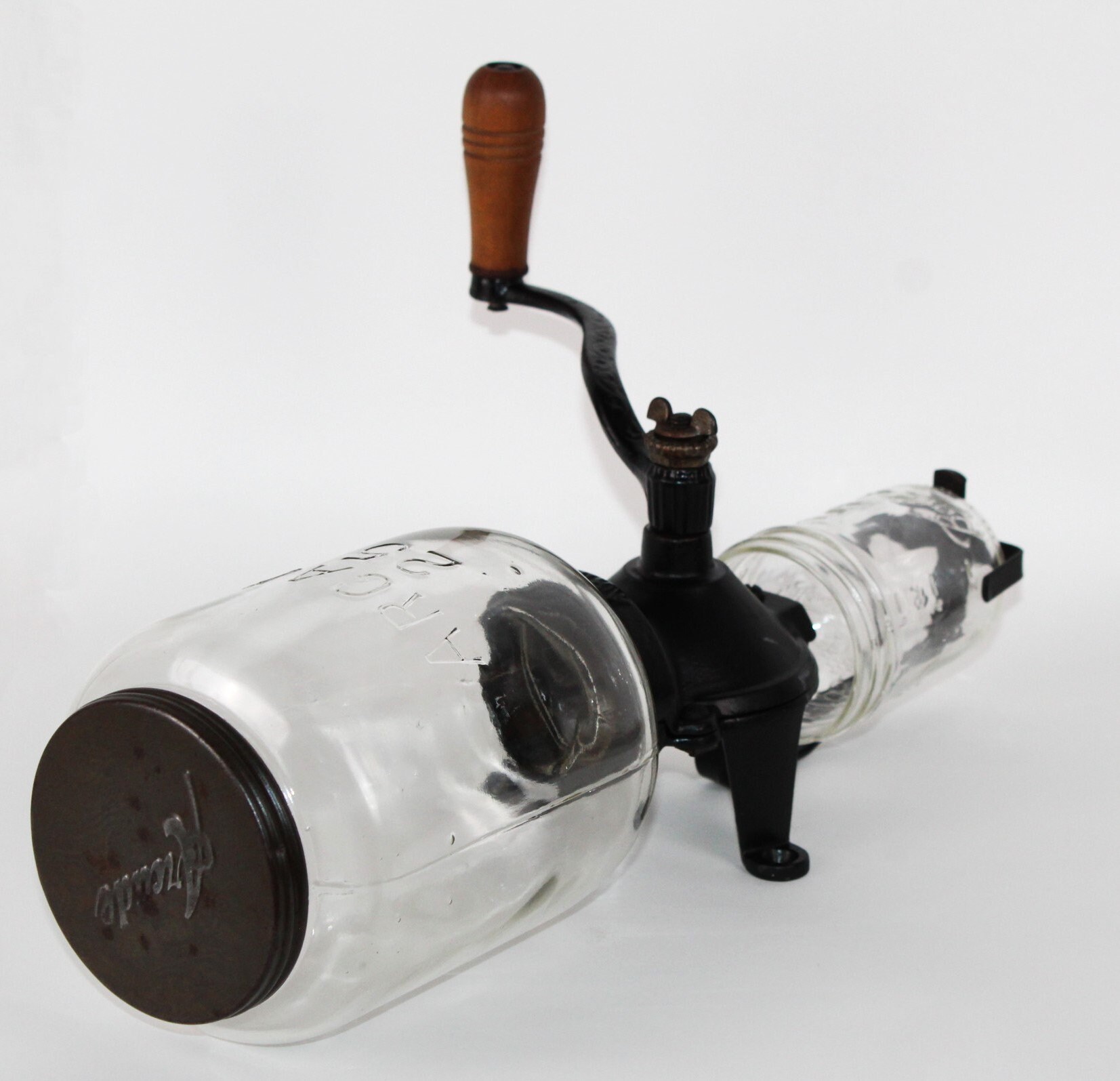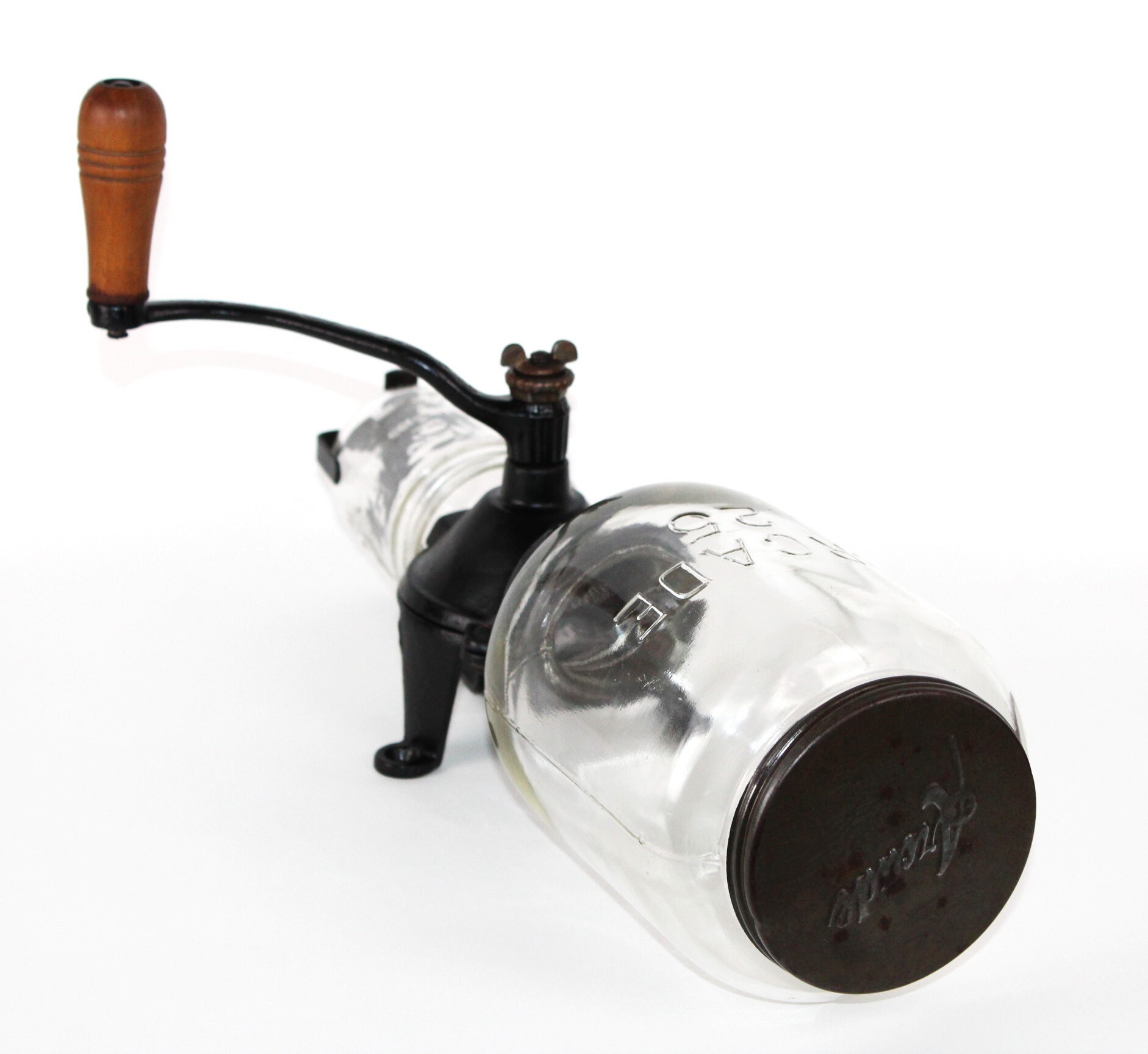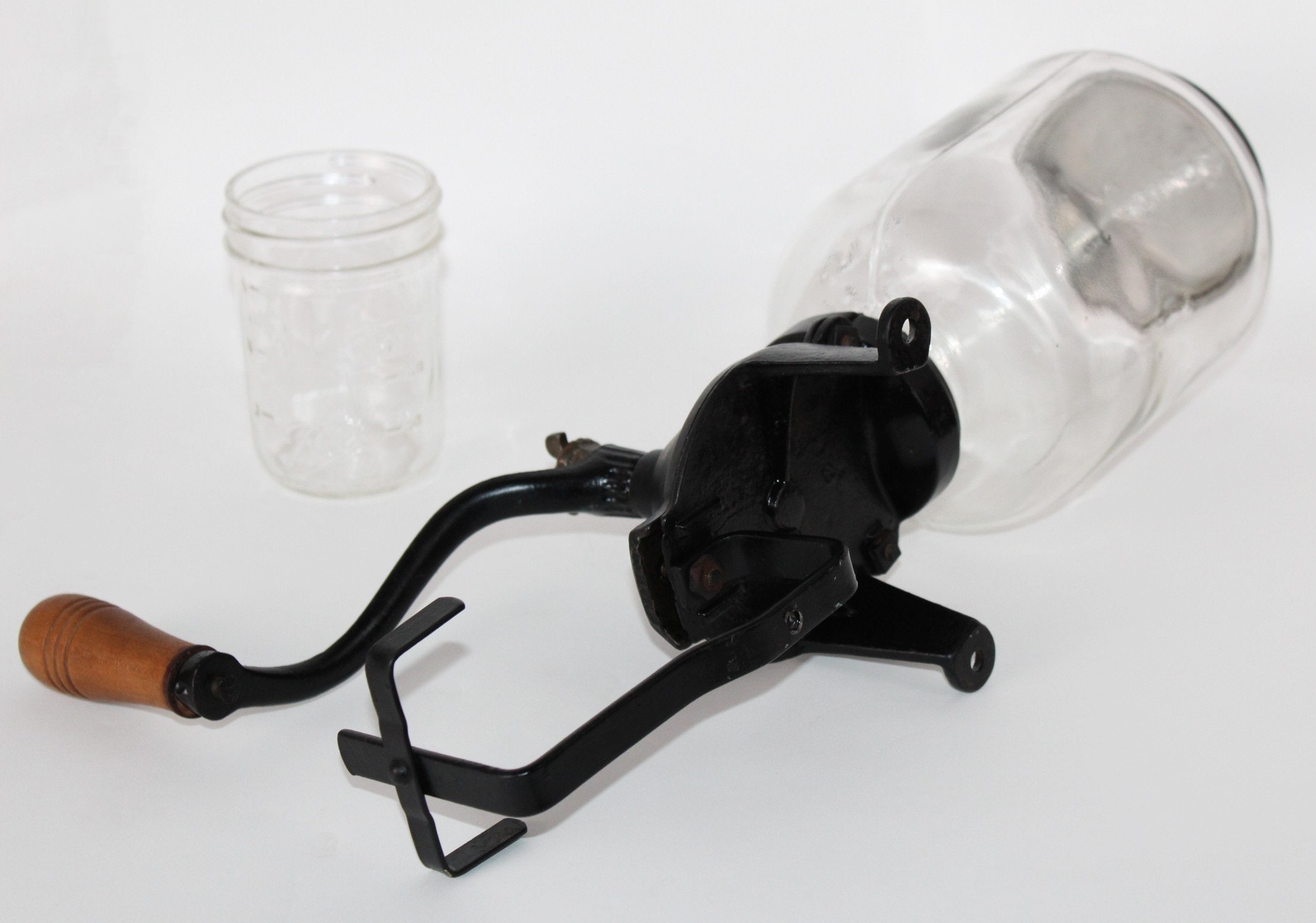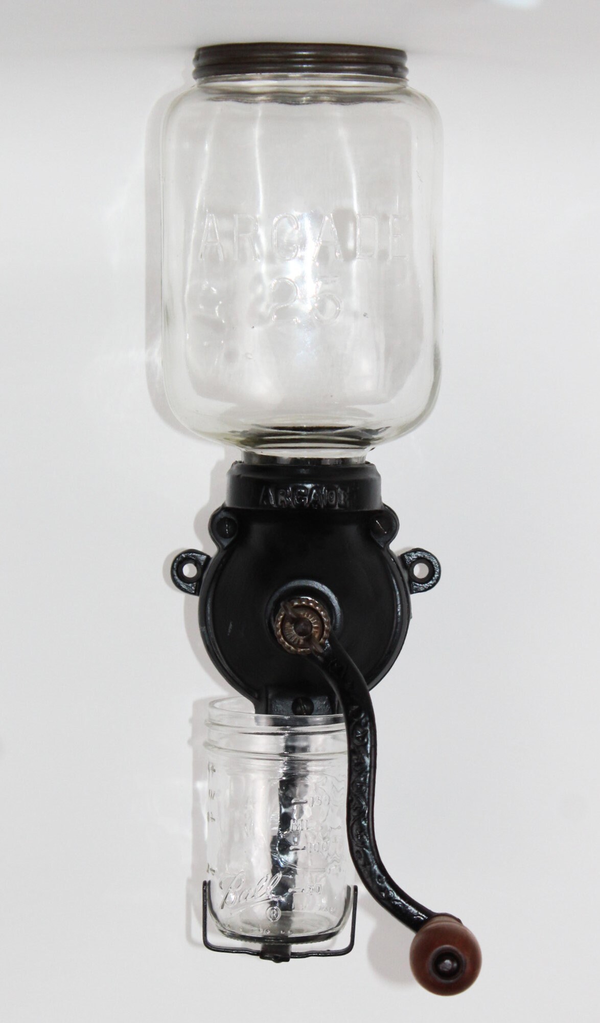 Wonderful early version of the Arcade Coffee Grinder, this is a No.25 which was produced between 1910 & 1930 manufactured by Arcade in Freeport, Illinois. It has a cast iron body with Arcade embossed on the neck and Arcade 25 embossed on the glass hopper also has scrollwork on the arm of the crank handle. The lid is original and embossed Arcade, the catch cup was broken a long-time age as usual and replaced with a Ball jelly jar. The glass hopper is a fixed hopper and does not remove, it is held in place with a rubber gasket which is original and in good condition.