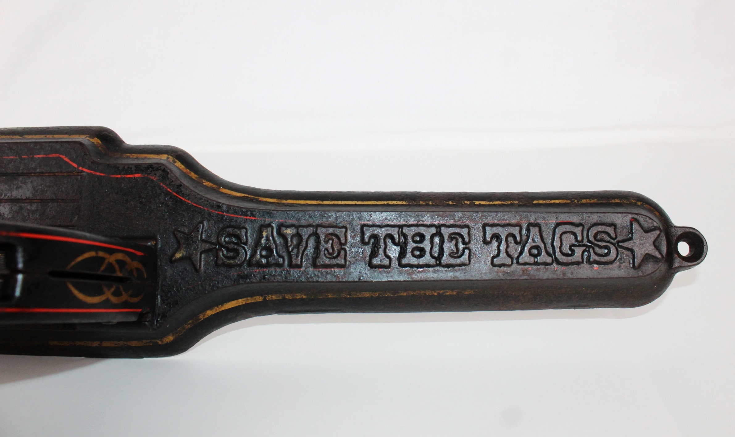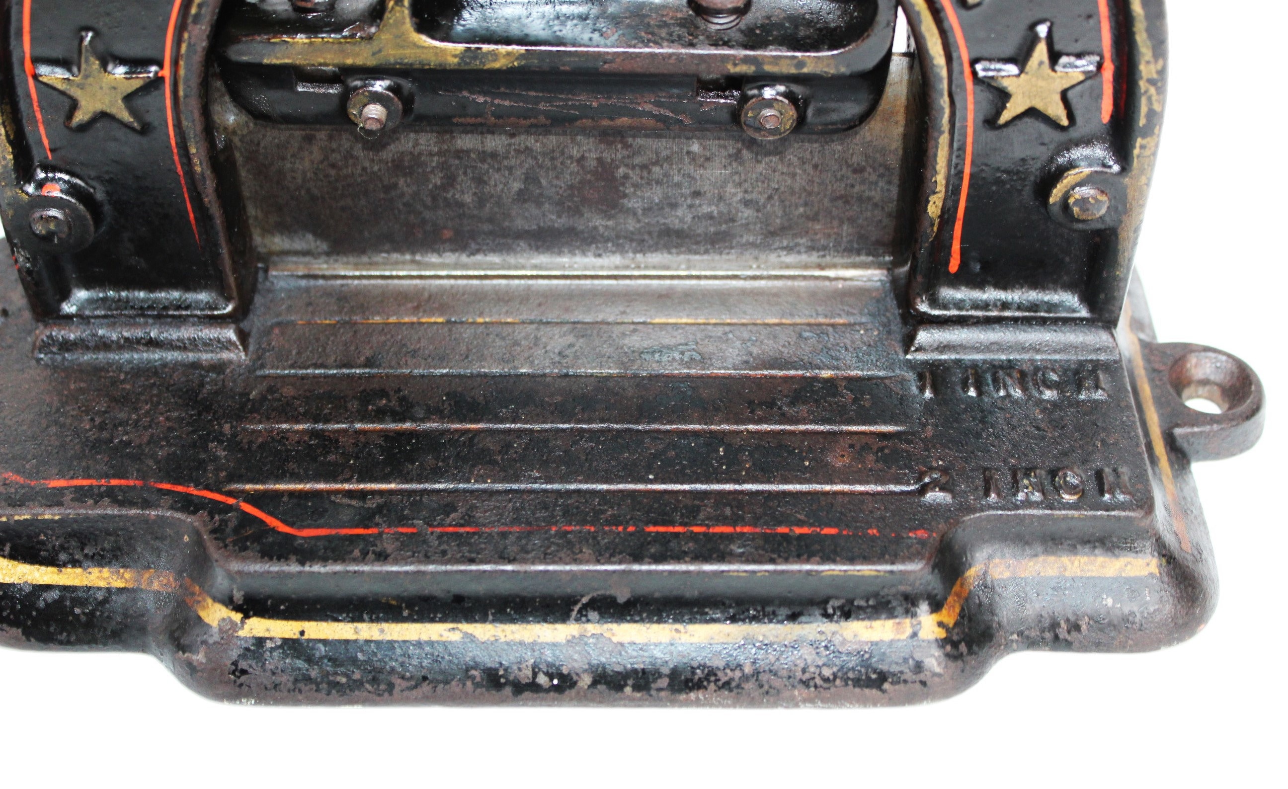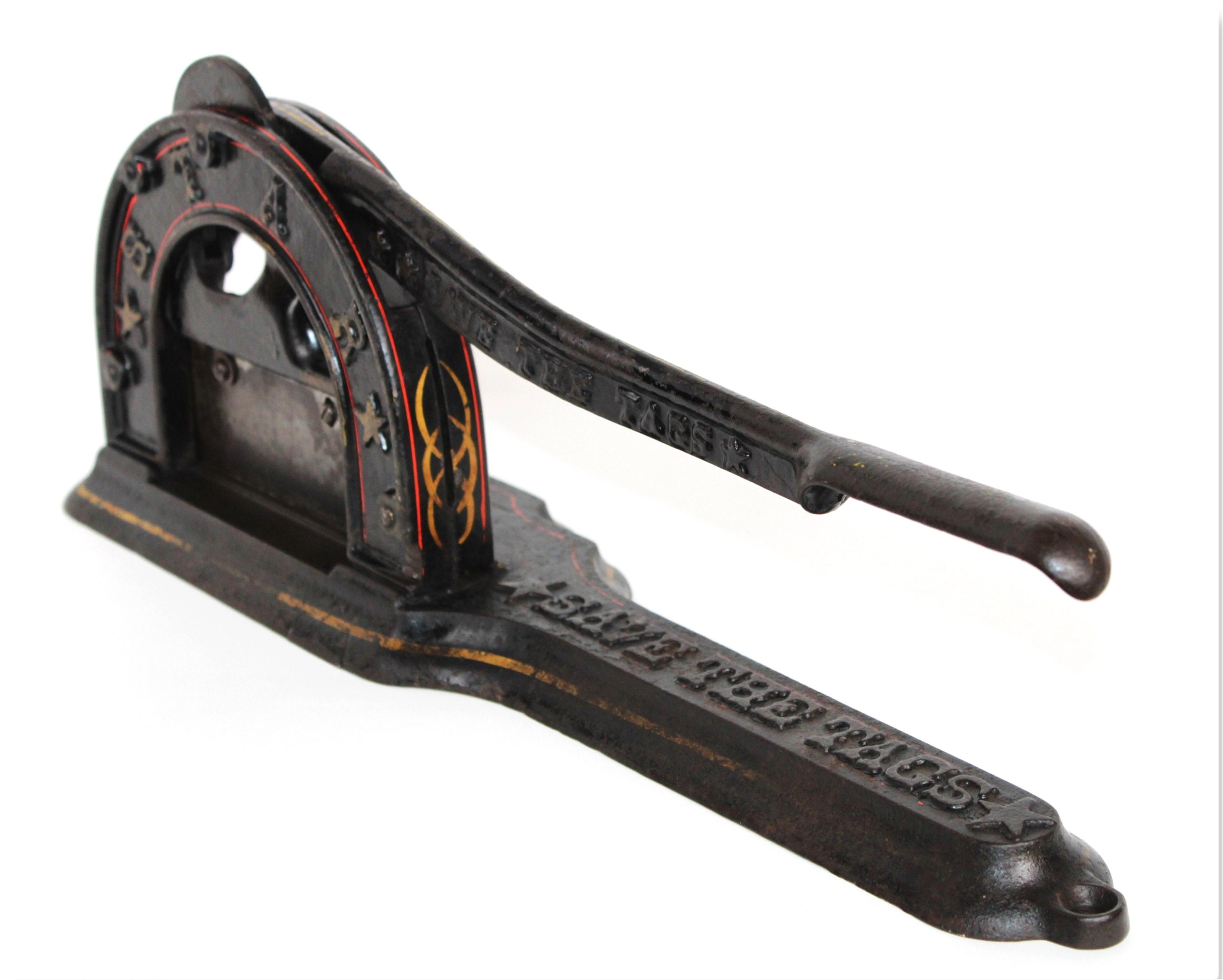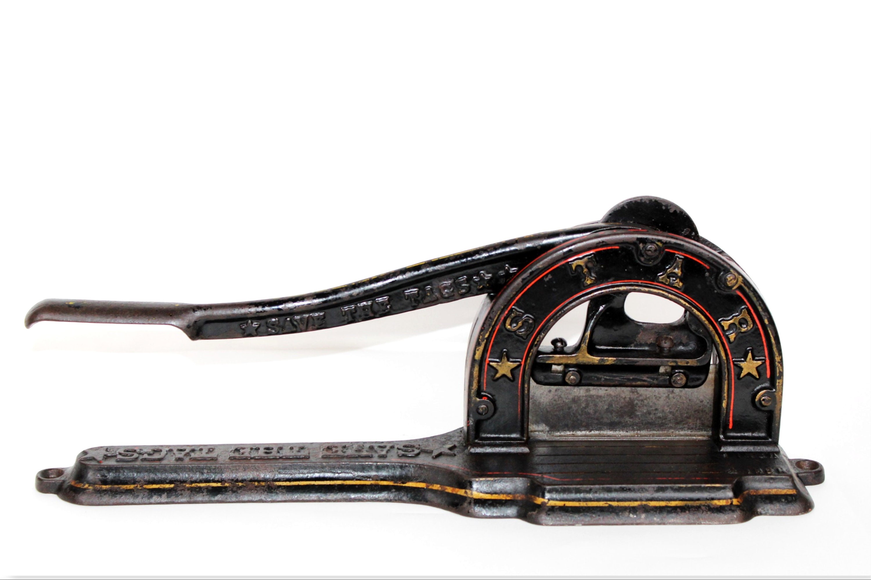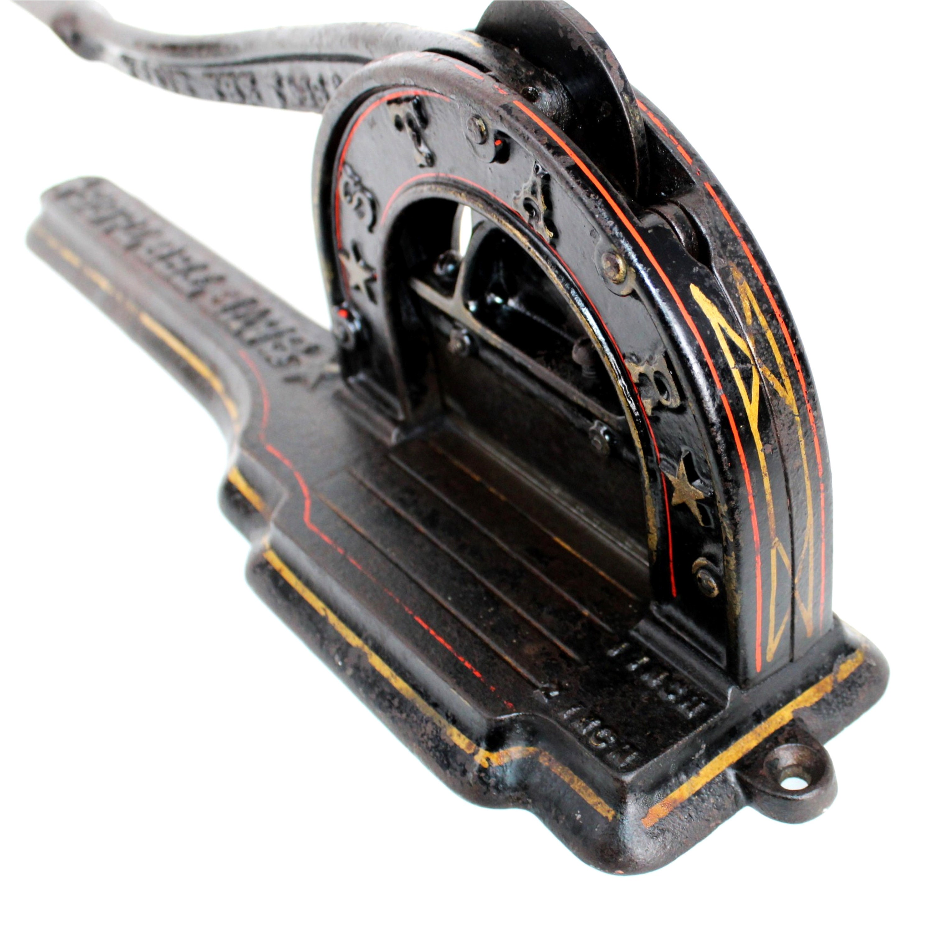 Made of cast iron with a steel cutting blade the condition is fair, having lots of its original paint and pinstriping in yellow and red over black.