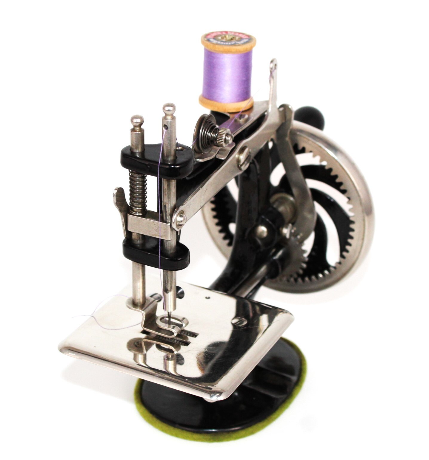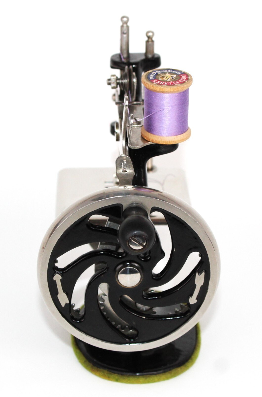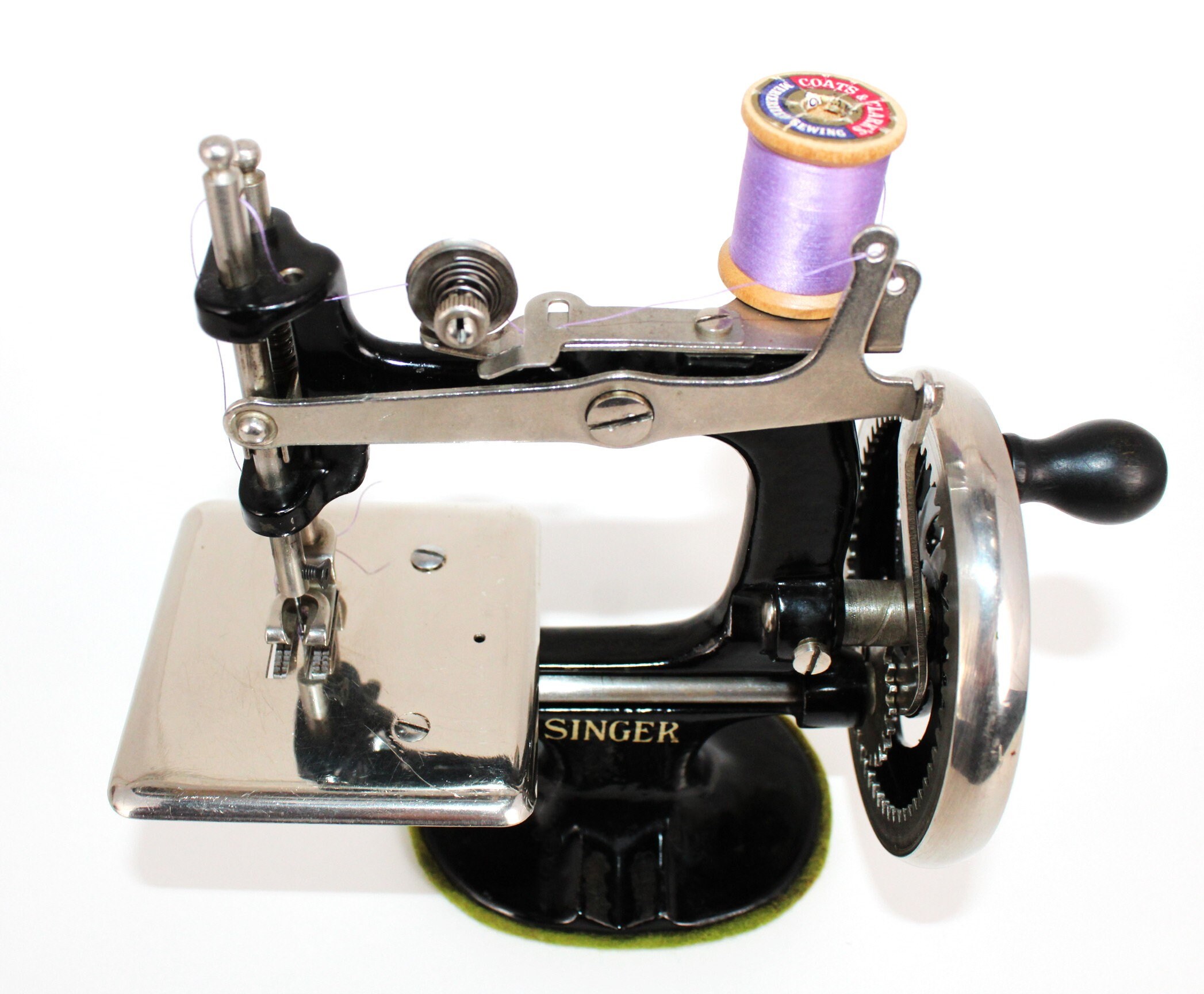This is a beautiful machine all original including original felt on the base. As we show in our video the machine operates nicely and produces a chain stitch sewing pattern using one thread.