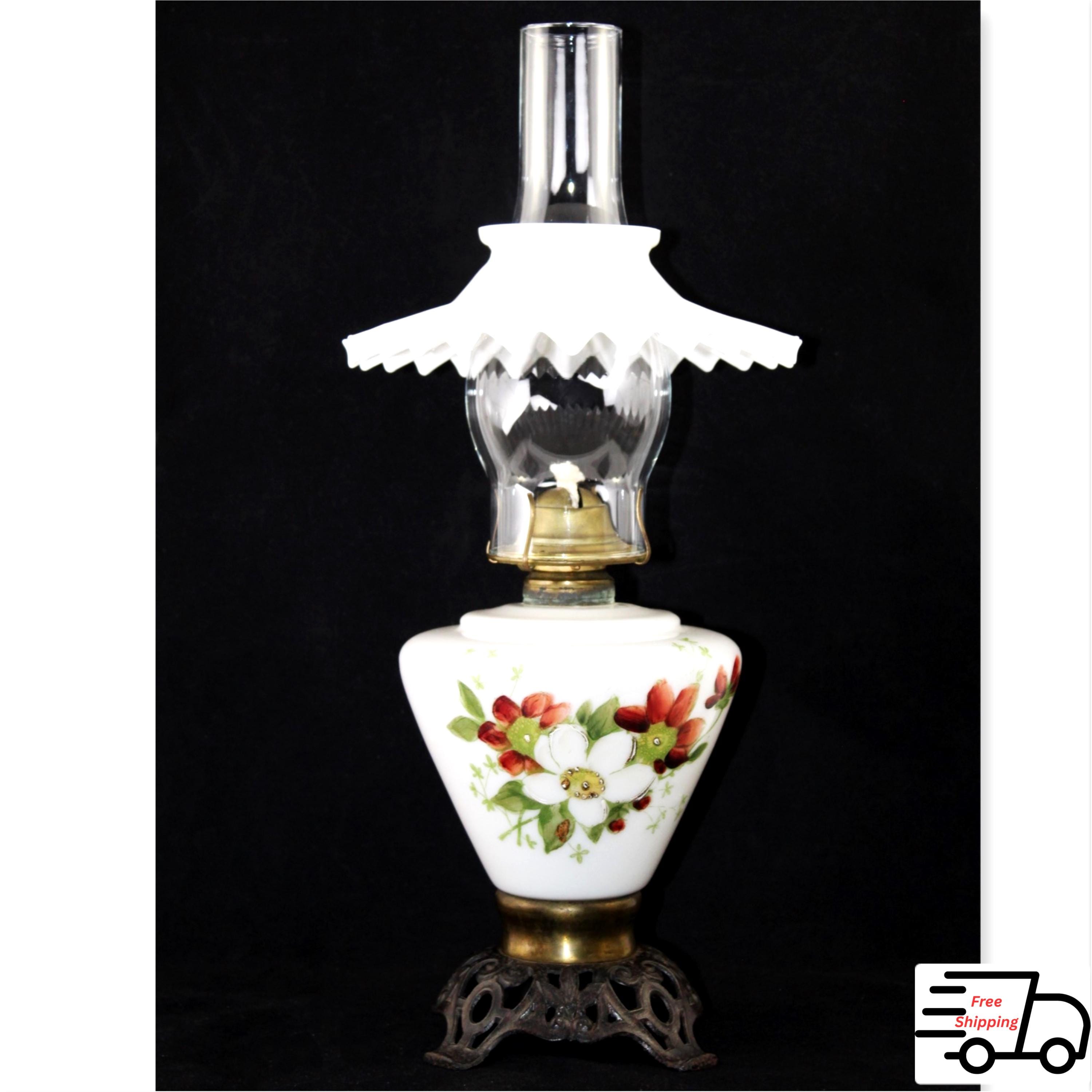 Antique Parlor Oil Lamp, Hand Painted on Milk Glass