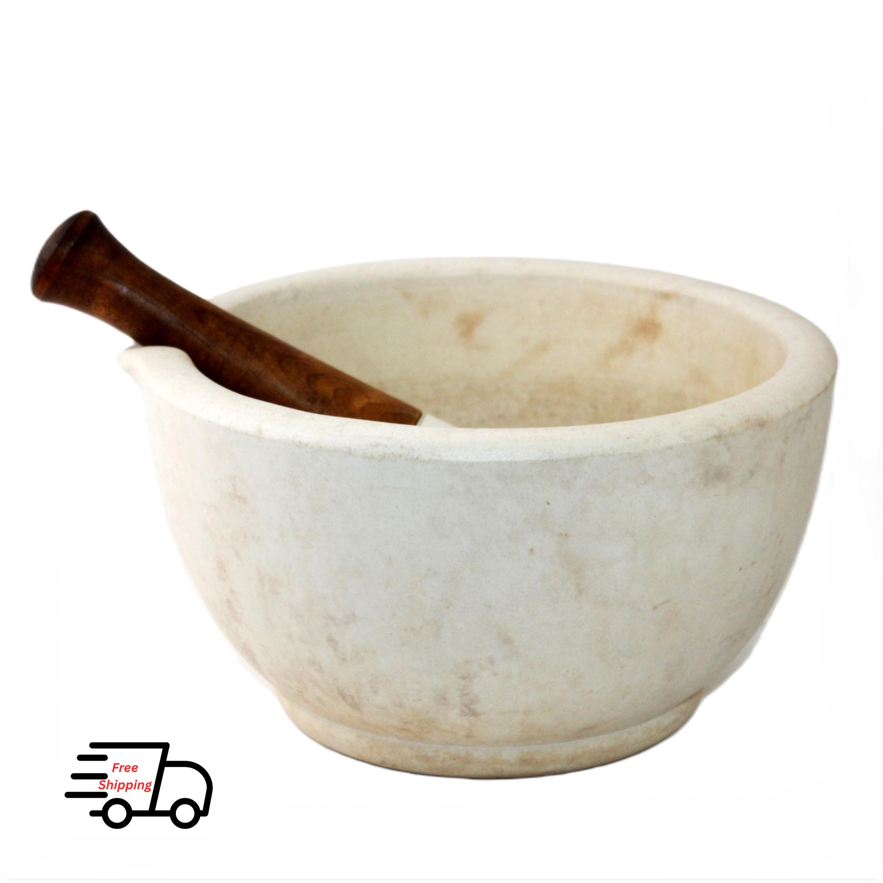 This is a larger Mortar & Pestle Mortar measures 10¼” diameter at top rim and 5¾” outside height. Pestle measures 9 ¾” long, 2½” diameter. Weighs just under 13 pounds.