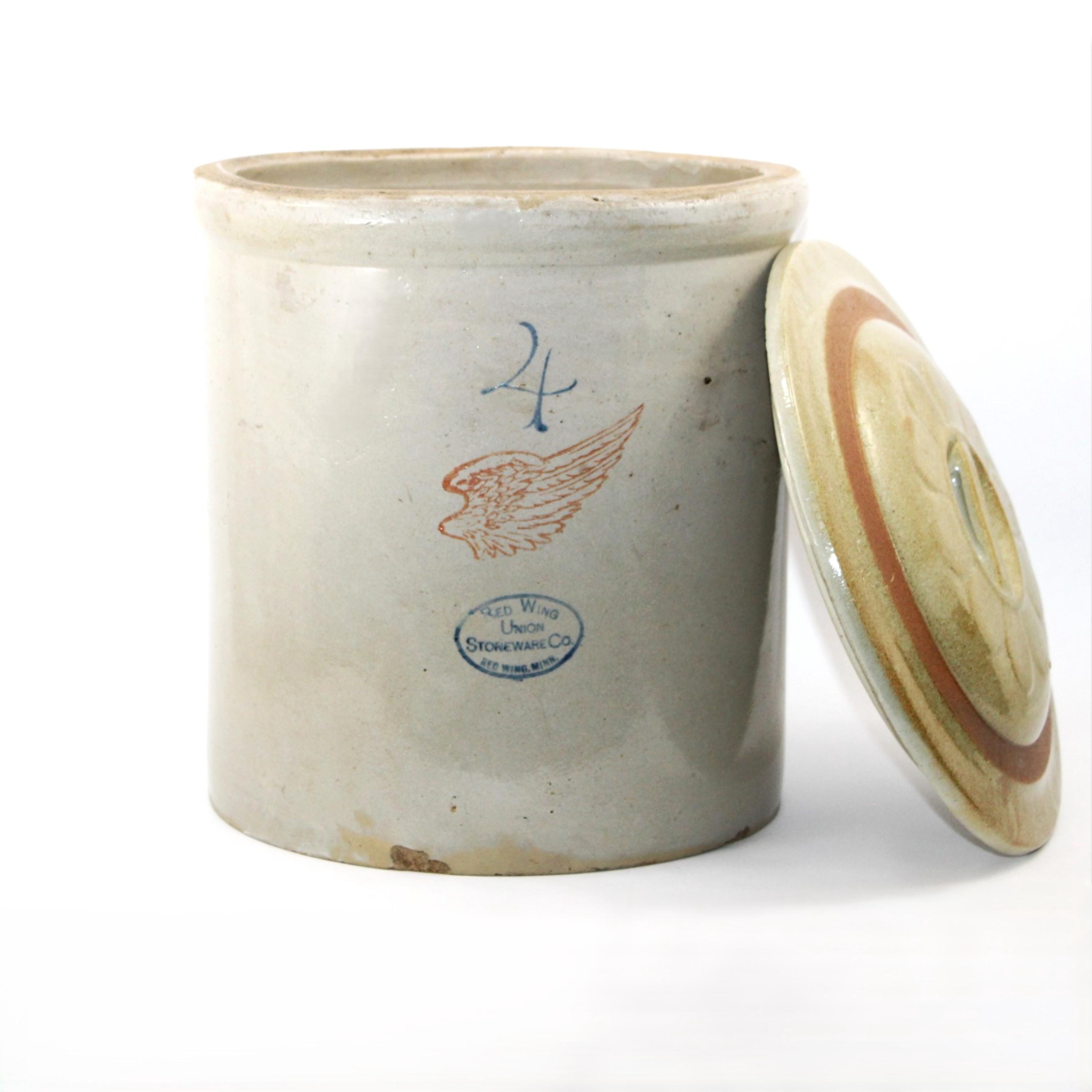 Antique RARE 1917 Red Wing, Union Stoneware Company 4-Gallon Crock and Lid, 4” Red Wing Logo