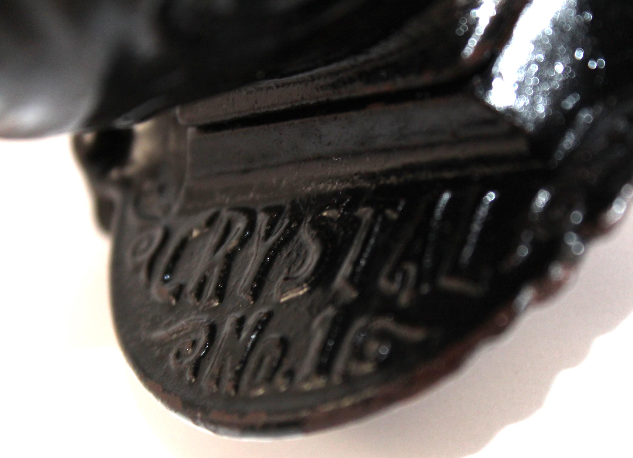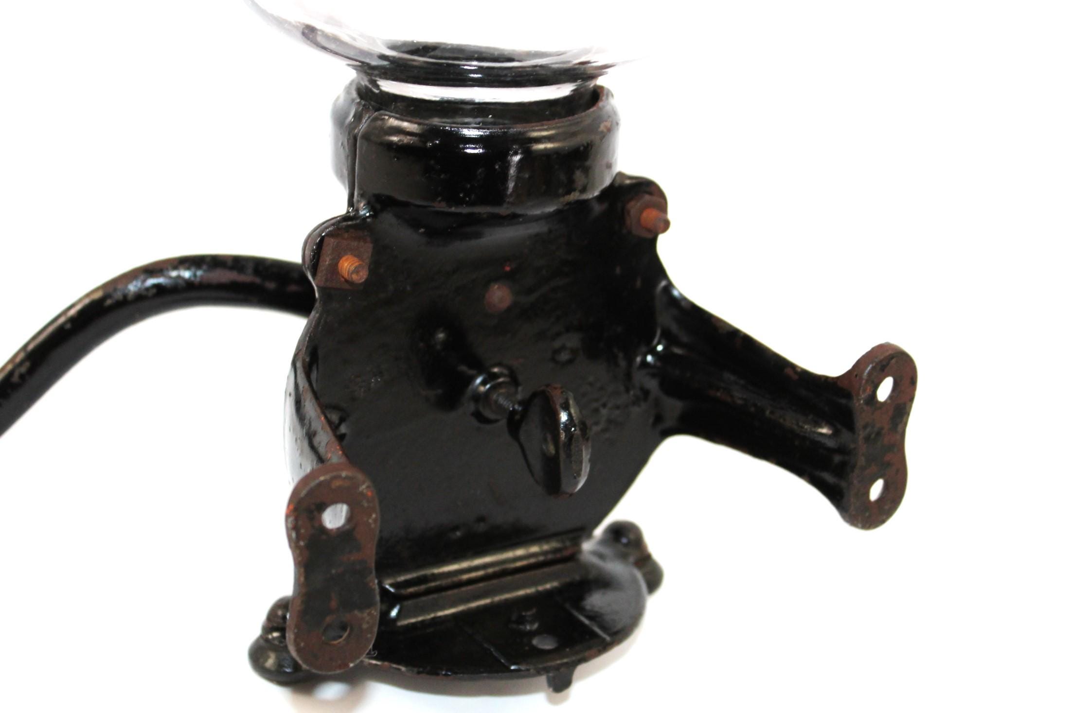 Crystal No. 1 was the first glass hopper mill produced by Arcade, manufactured between 1885-1890s. Made of cast iron with glass hopper. The Arcade Crystal No.1 was only marked at the base (Crystal No.1) the hopper was not marked. The catch cup (not included) was held between the two round rubber bumpers at the base of the grinder. To adjust the grind from fine to coarse there is an adjustment screw on the back of the grinder.