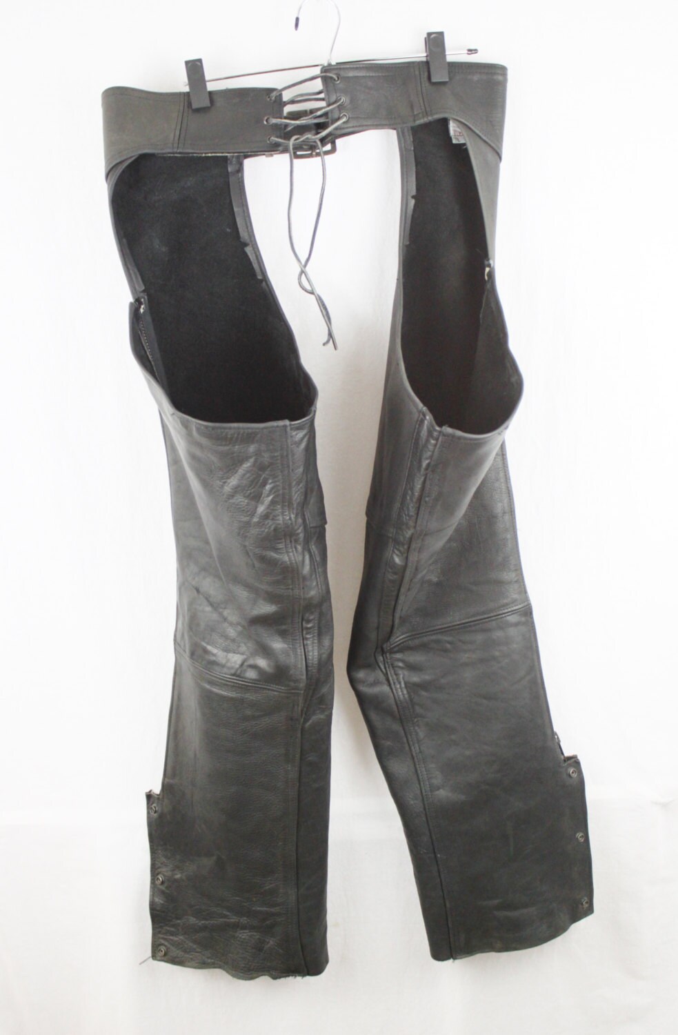 These are made of very heavy weight leather, very durable yet pliable. These well maintained leather chaps are perfectly broken in so you can enjoy those beautiful late fall and early spring rides. Light natural wear. Front Belt Buckle and adjustable back leather lace up. Full length outside zippers with triple snaps at the bottom. No rips, stains or tears. Classic cool. We believe they are 1980’s vintage. Made by Natal Leather Company, Peabody, MA.