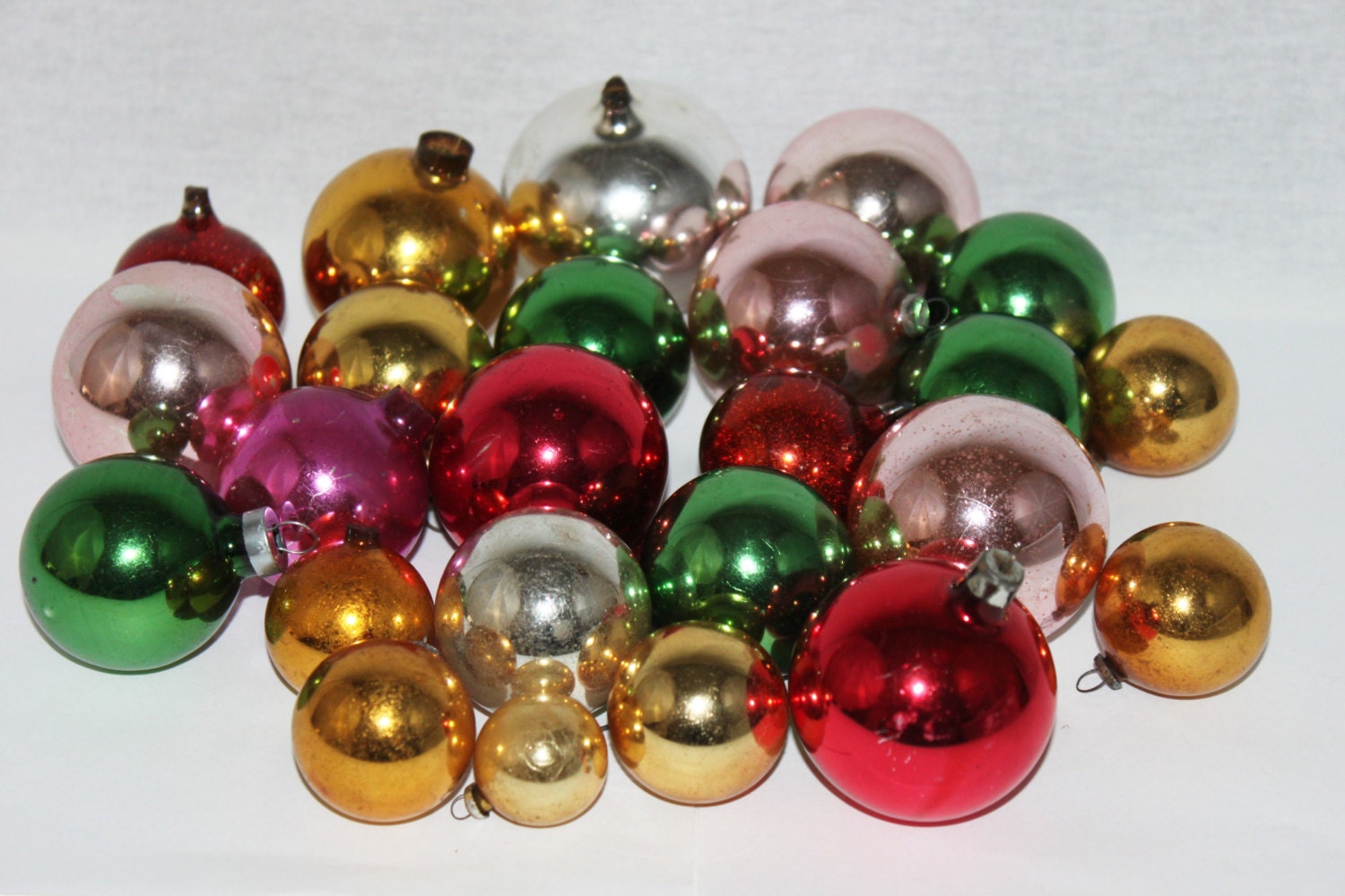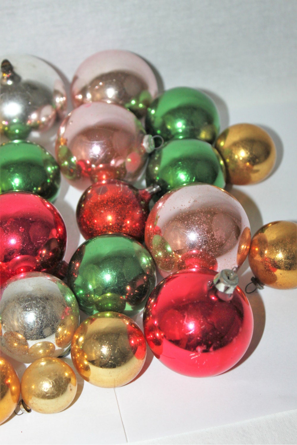This is a wonderful mixed colorful collection of 24 vintage mercury glass Christmas Ornaments ranging in diameter from 1”- 2 1/4” diameter. These ornaments from the 1940’s/1950’s have a great vintage patina. They would be a great way to add a retro look to your tree, wreaths or other Christmas decorations. Lovely in a vintage wooden bowl or added to fresh tree greens with lights on your mantle or party table. Various cap stamps: Japan, Poland, no marks. Some have no caps.