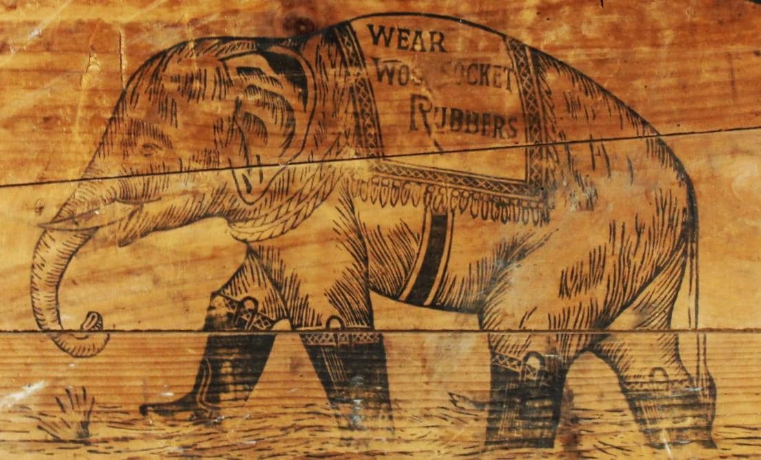 Wonderful find, this larger wooden shipping crate for Woonsocket Rubbers. The awesome Logo on the crate is of an elephant wearing rubber boots.
