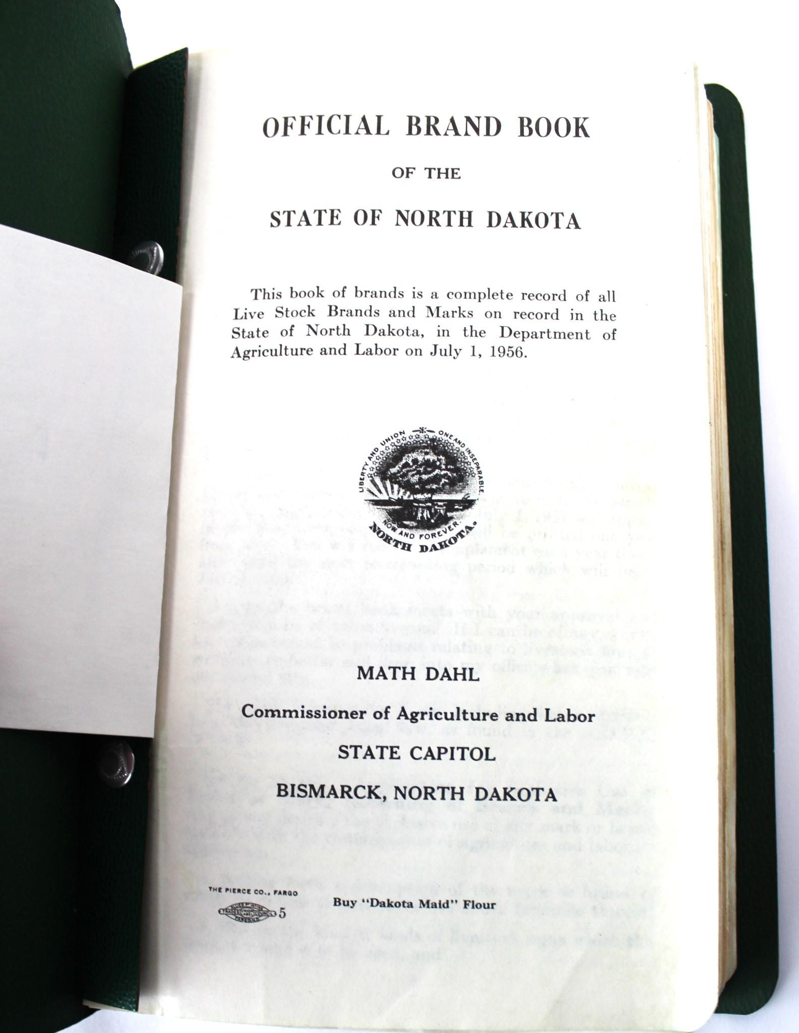 History: The state of North Dakota only issued a new brand book every 5 to 10 years, the information in the 1956 book was compiled staring on July 1, 1955, and sent to copy July 1, 1956. Each year afterwords the state would issue a supplement until July 1964. In 1966 the state issued its 1966 version of their brand book.