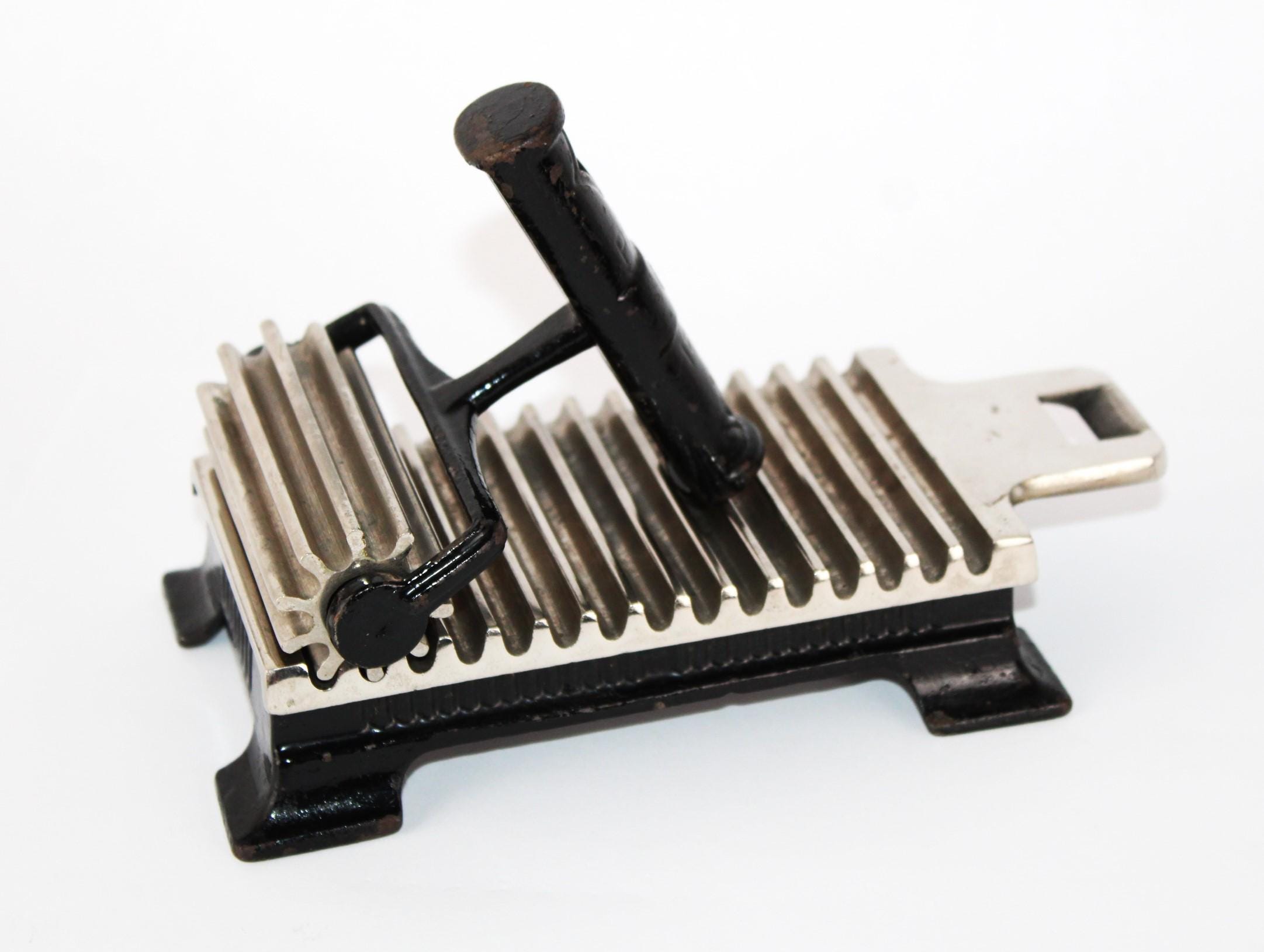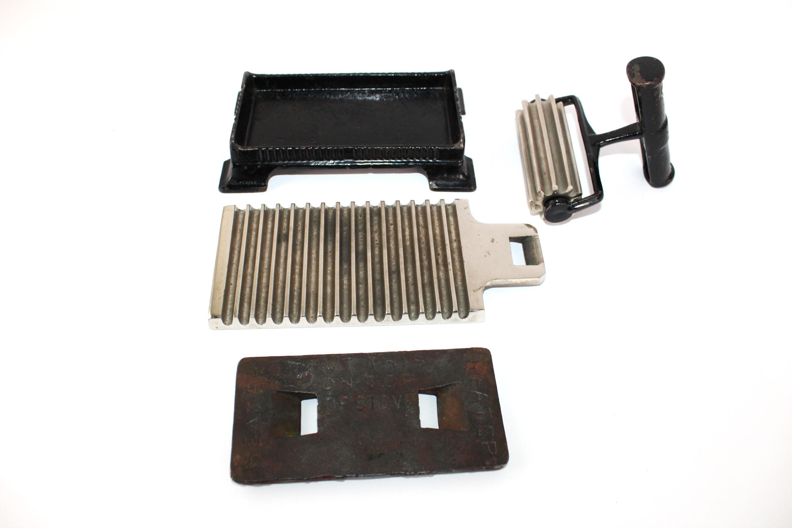 This set includes heating base with lid, removable heating plate and plate roller. The base is case iron with a nickel-plated hinged lid; the removable heating plate is cast iron with directions molded into the cast iron. The roller is made of cast iron with a ventilated hollow handle, the fluting roller is nickel-plated.